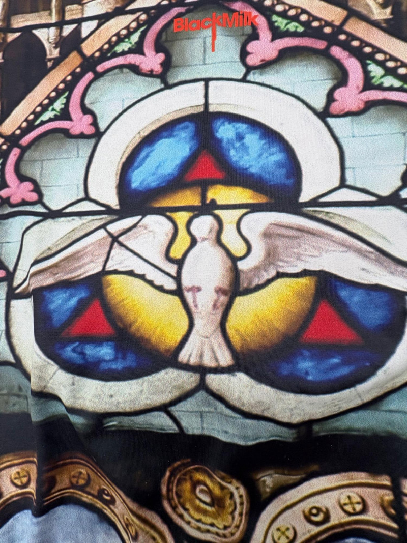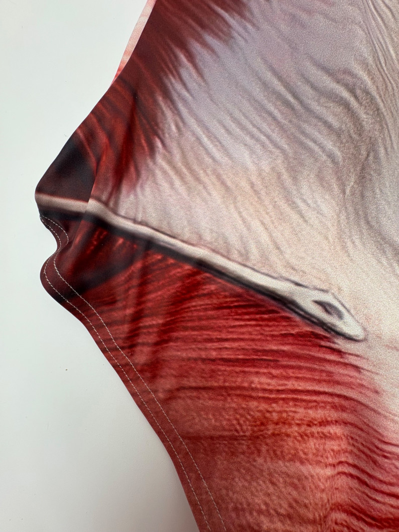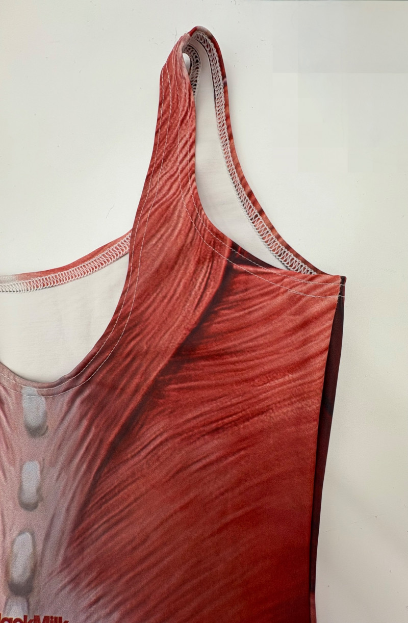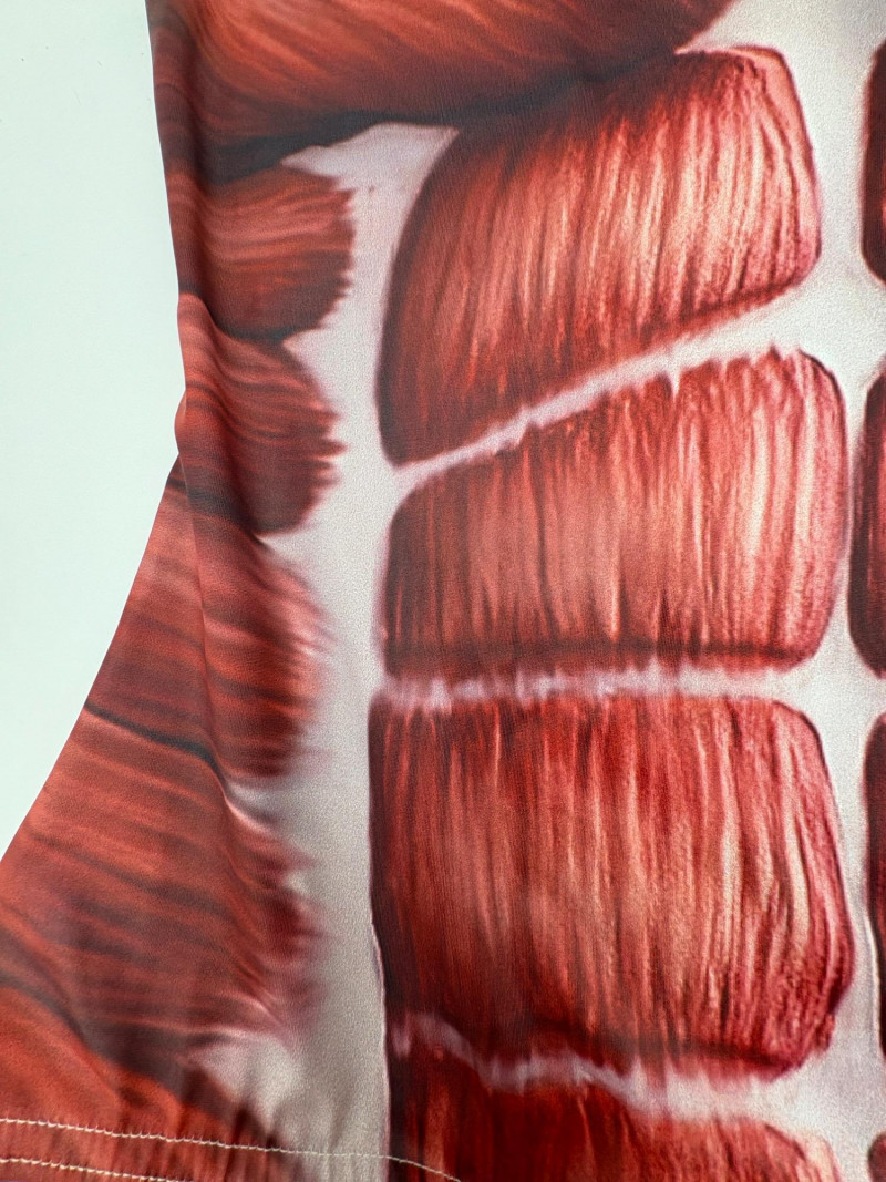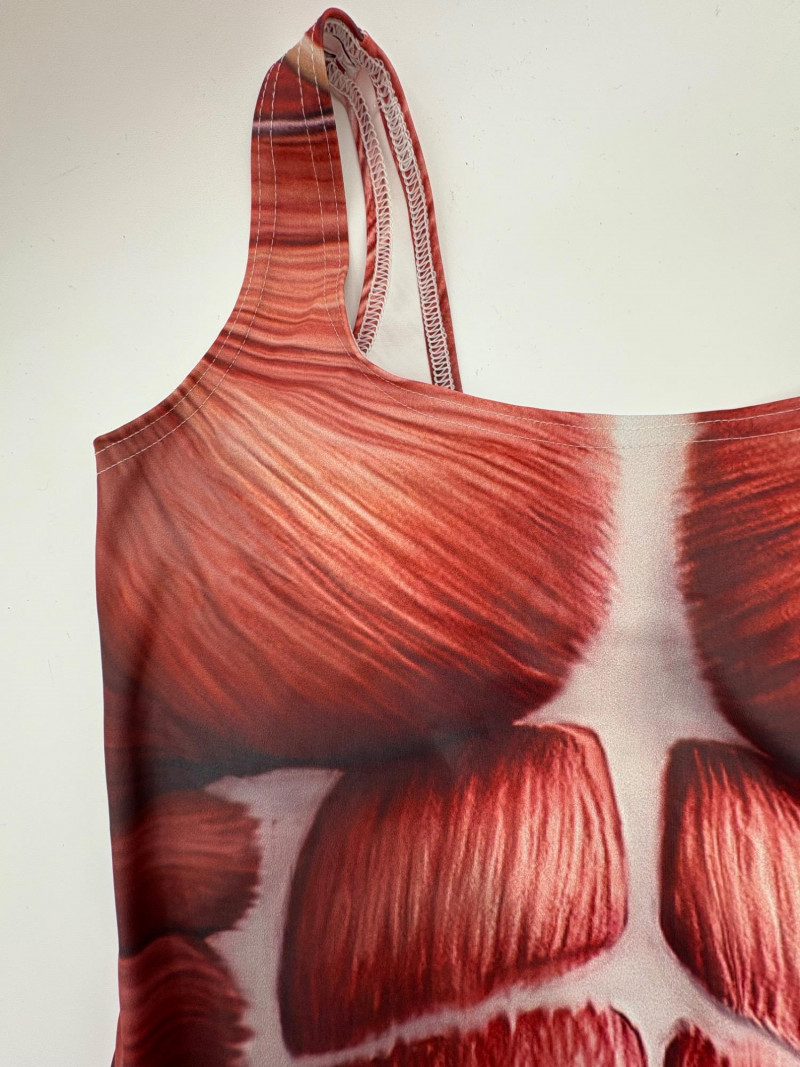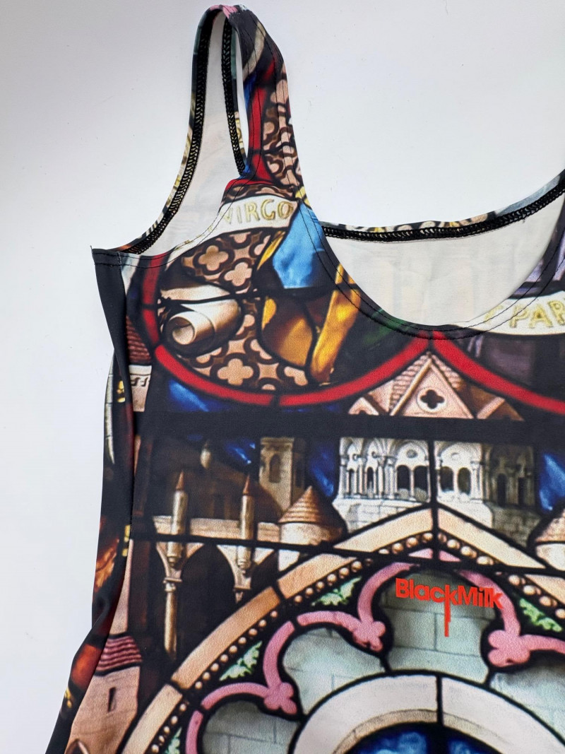 Pair of Black Milk bathing suits from Australia. This company is known for its wild prints on sleek minimalist design suits in high quality Lycra. Here we have a stained glass Annunciation scene and a muscular/skeletal anatomy lesson in a single lot! Suits measure 16" unstretched pit to pit, but have lots of stretch - client wore an XL when she purchased them, but put them away and forgot about them so they were never used. Both say size L on tags.