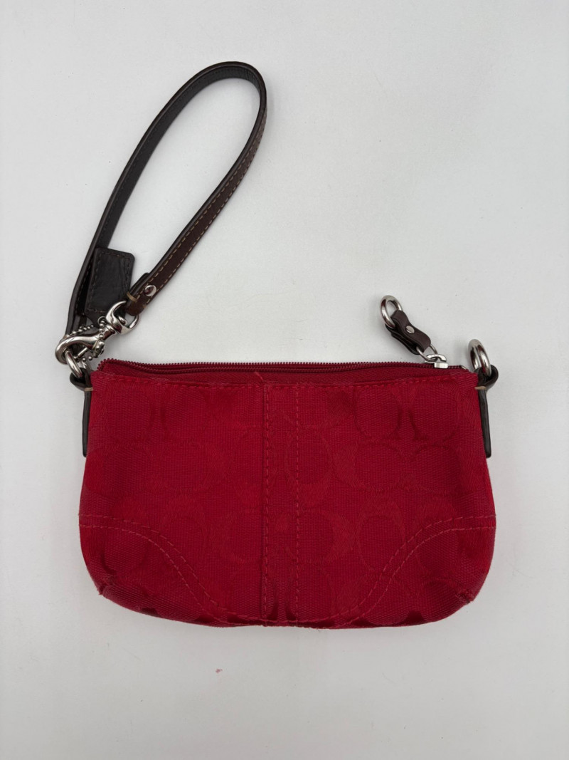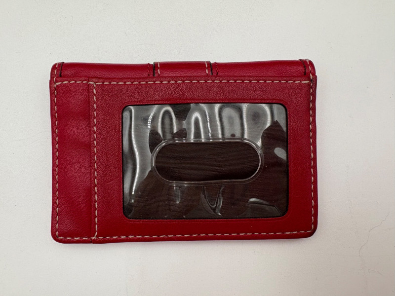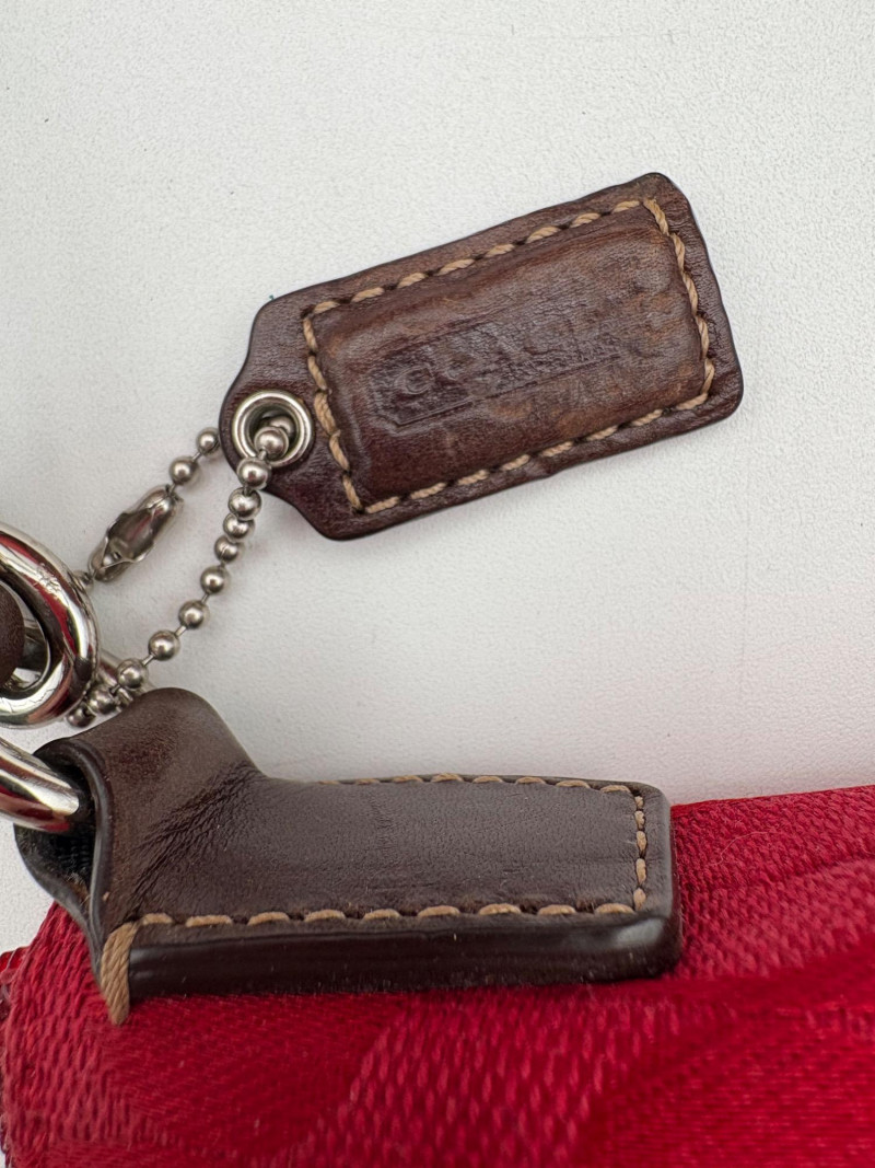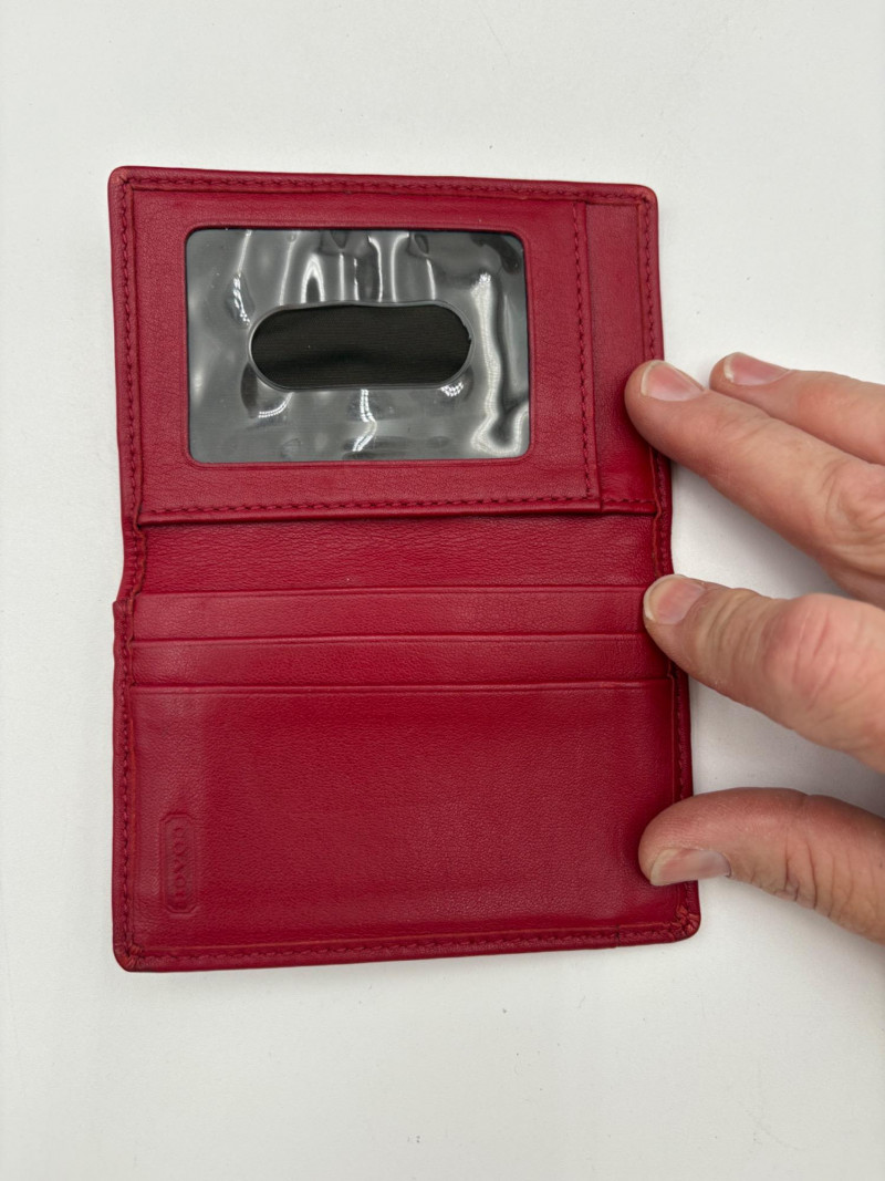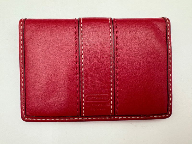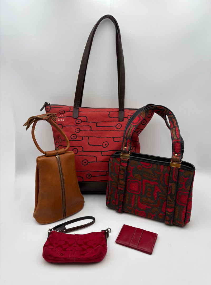 Purses for your every need in red & brown. VIDA tote designed by Seattle artist Jena Scott has heavy canvas exterior, leather straps & bottom, zip top closure and brown lining with zip pocket. Measures 14" H x 22" W x 4" D. 11" drop from top of straps to purse. Vintage brown & red purse has 2 handle straps, gold hardware, and inside snap shut center with side pockets. Measures 8" H x11" W x 3" D. 9" drop from top of straps to purse. Vintage brown leather loop handle purse has zip front and small decorative flourish at the top of the handle. Measures 16” H x 8” W. Small Coach wristlet has leather trim & logo fabric with zip top. Measures 4.75" H x 7" W. Small Coach card carrier is bi-fold and measures 3" H x 4.5" W.