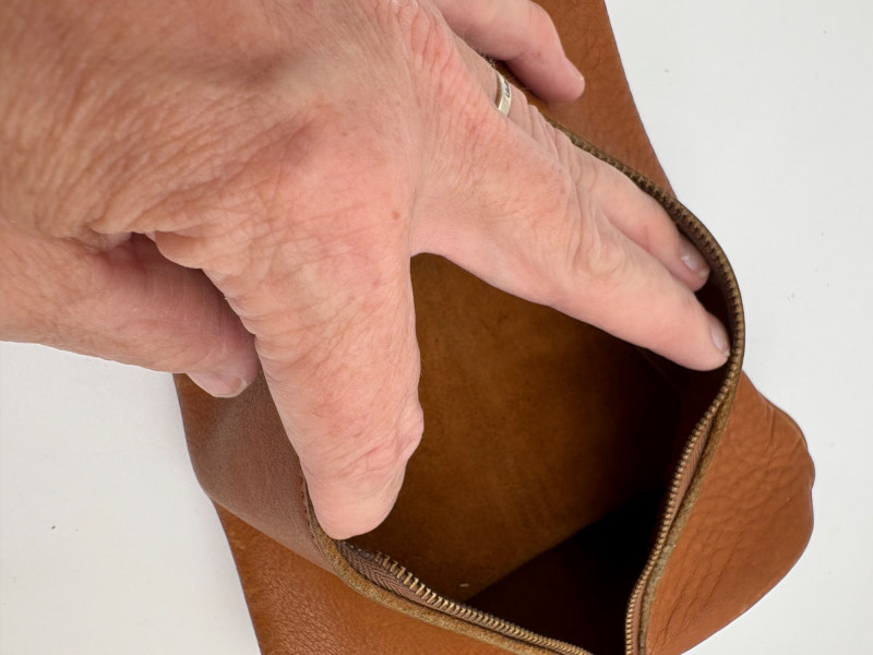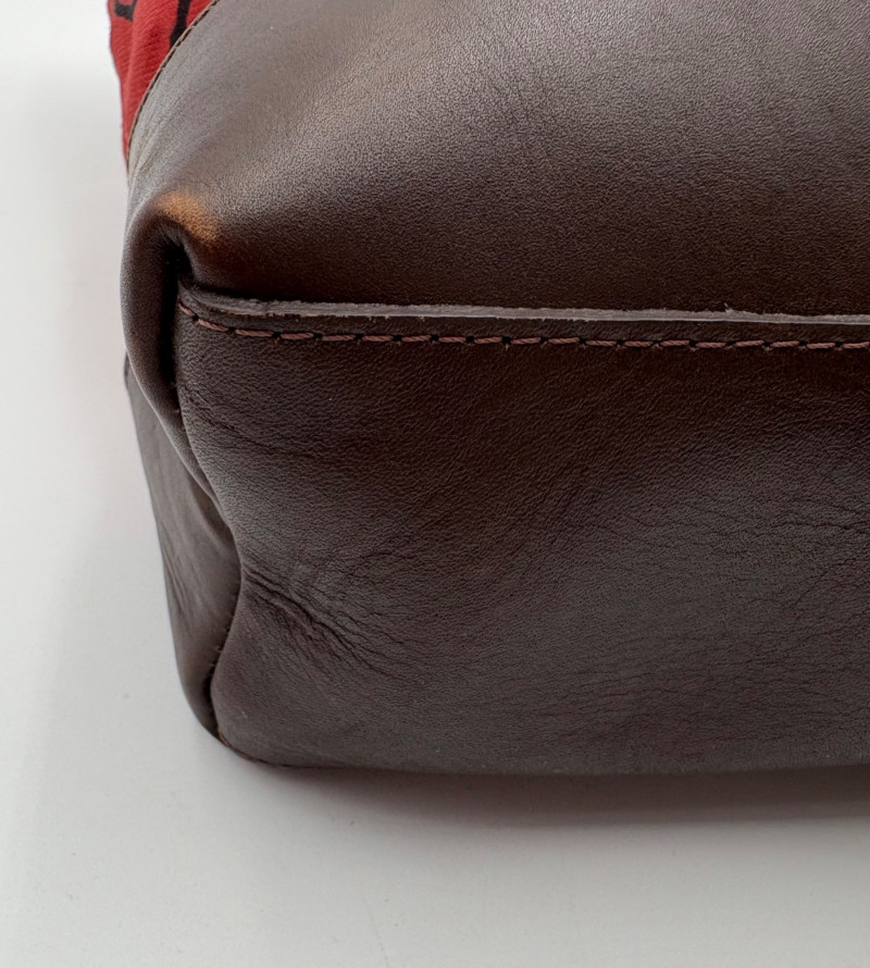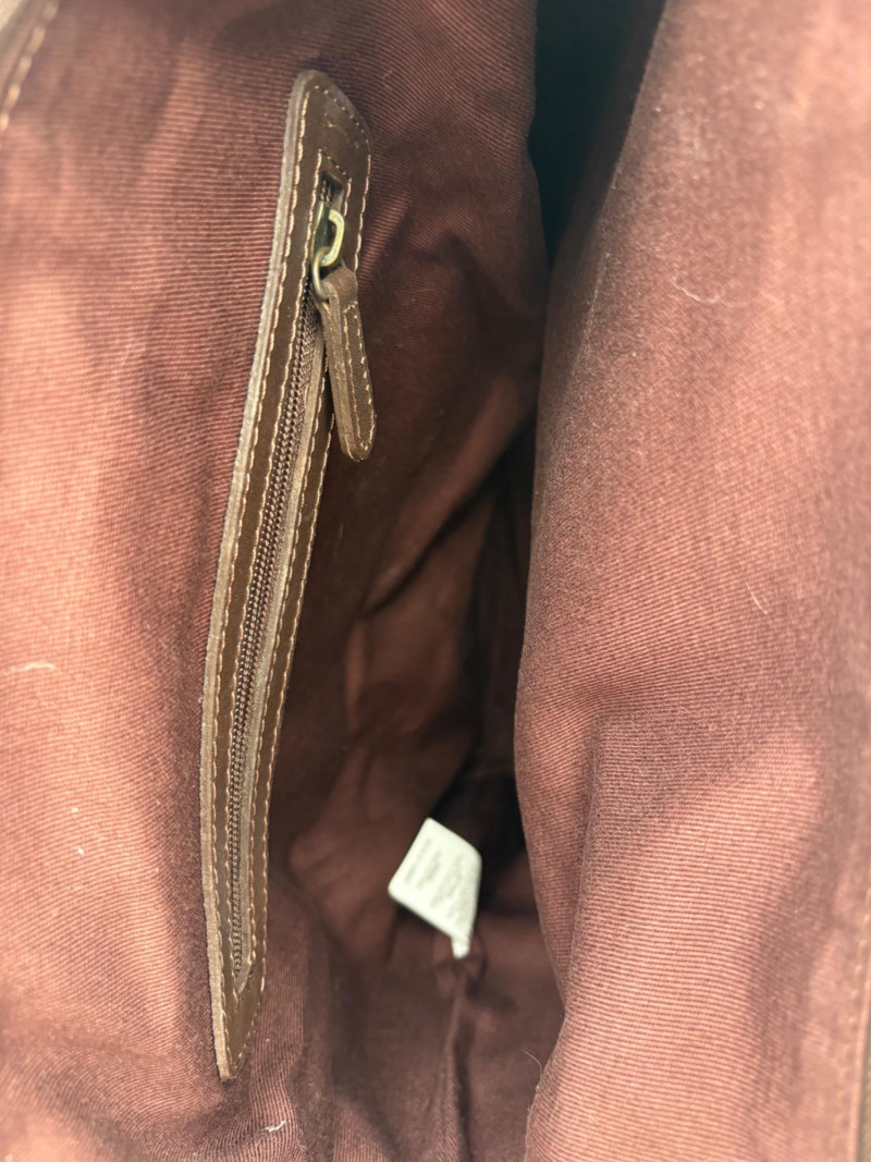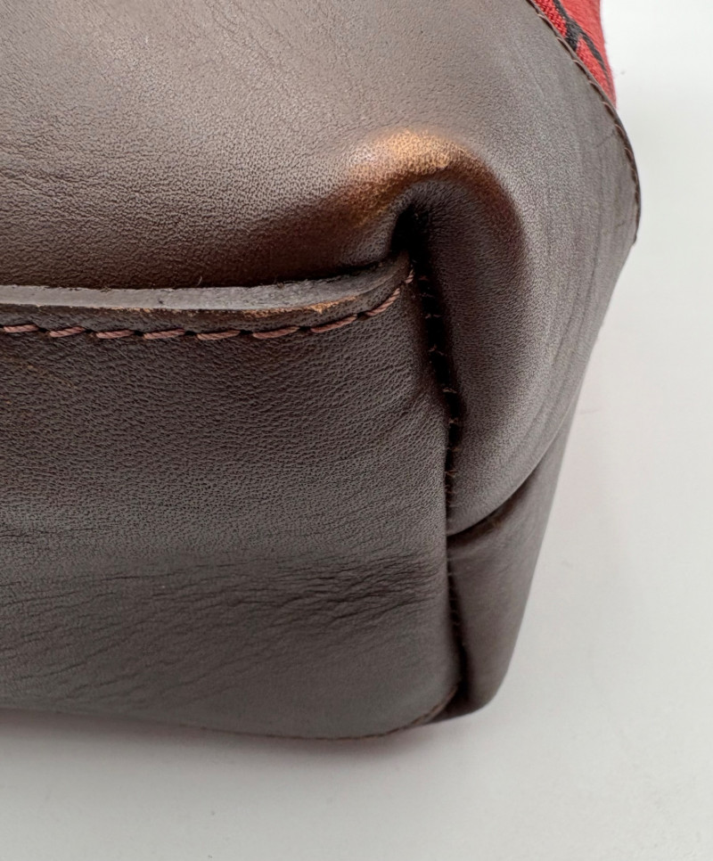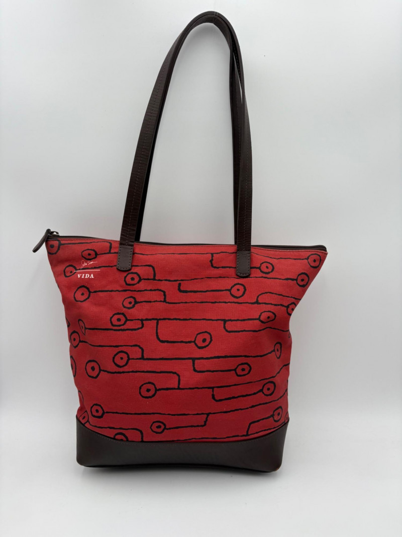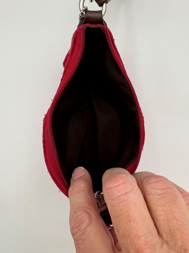 Purses for your every need in red & brown. VIDA tote designed by Seattle artist Jena Scott has heavy canvas exterior, leather straps & bottom, zip top closure and brown lining with zip pocket. Measures 14" H x 22" W x 4" D. 11" drop from top of straps to purse. Vintage brown & red purse has 2 handle straps, gold hardware, and inside snap shut center with side pockets. Measures 8" H x11" W x 3" D. 9" drop from top of straps to purse. Vintage brown leather loop handle purse has zip front and small decorative flourish at the top of the handle. Measures 16” H x 8” W. Small Coach wristlet has leather trim & logo fabric with zip top. Measures 4.75" H x 7" W. Small Coach card carrier is bi-fold and measures 3" H x 4.5" W.