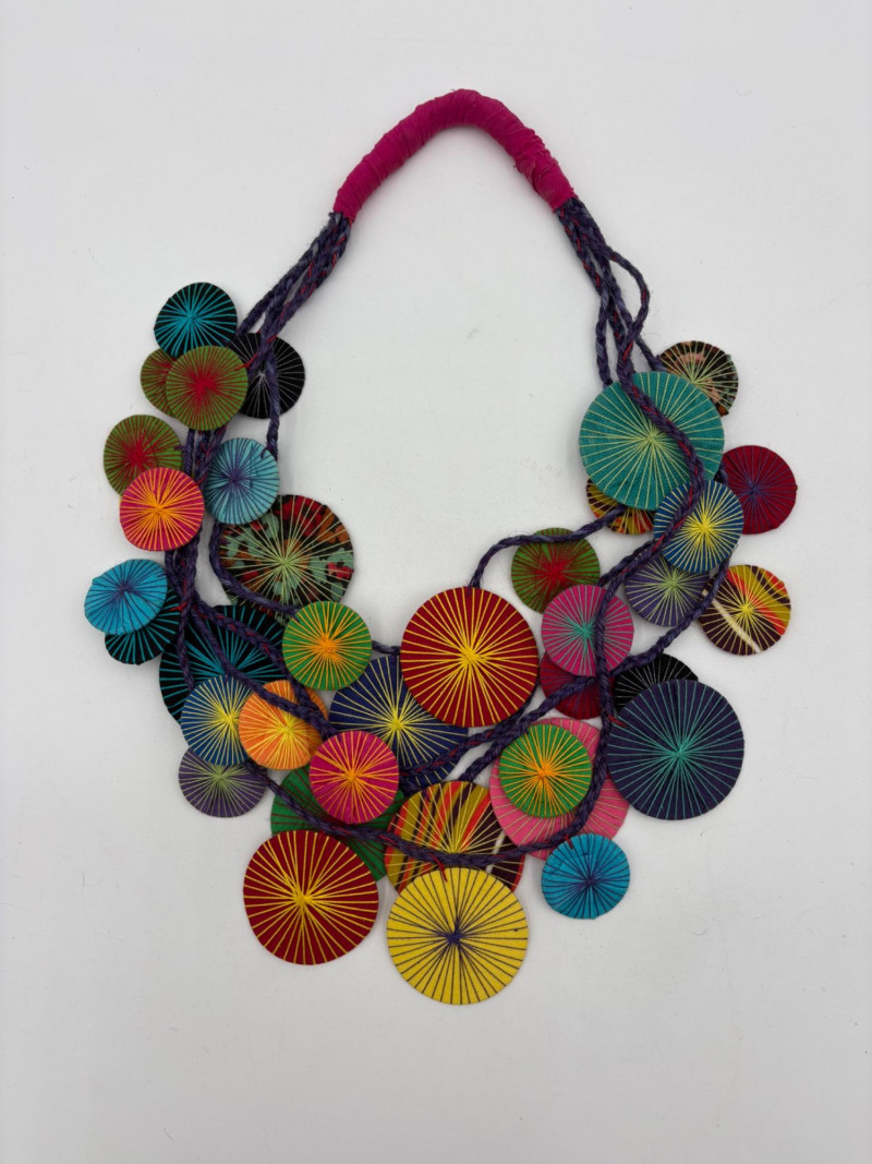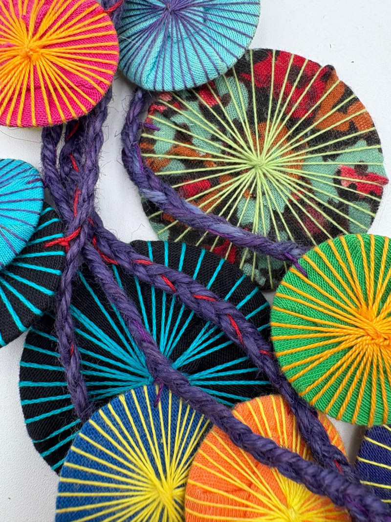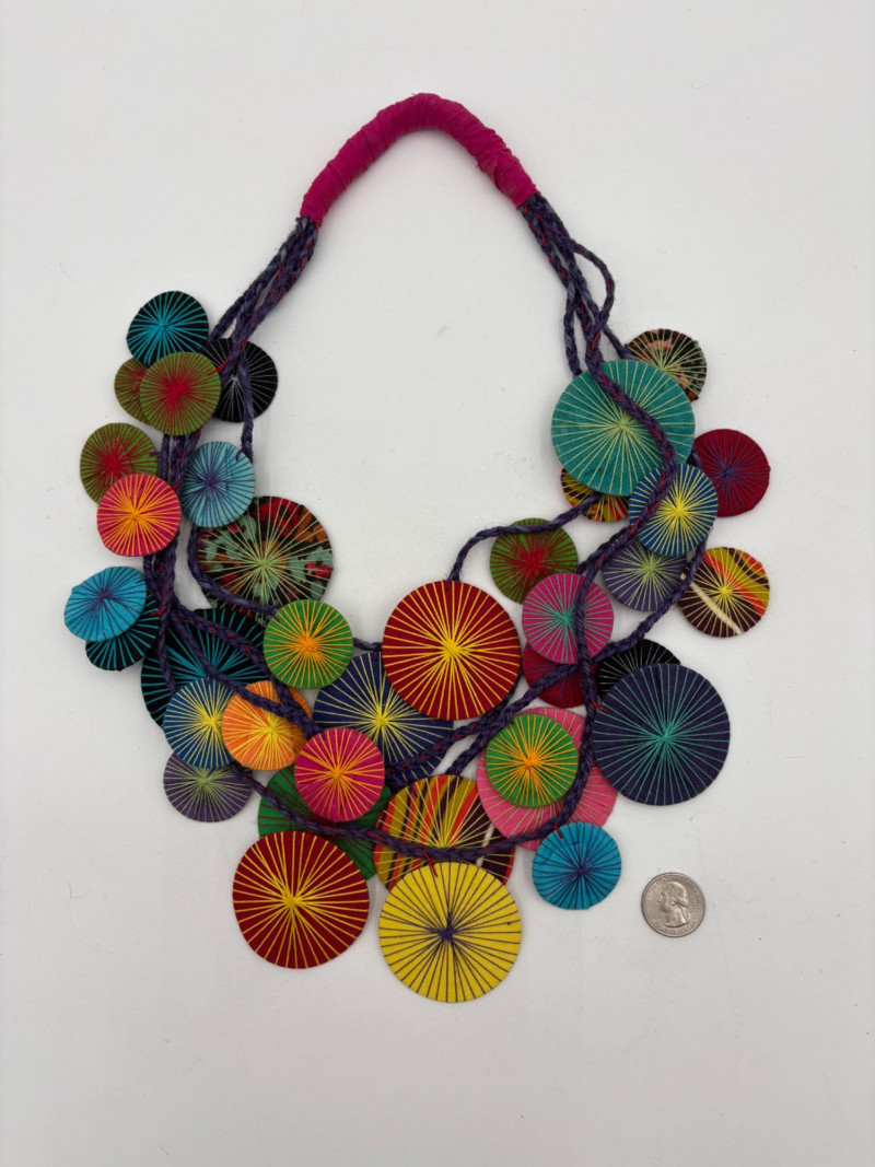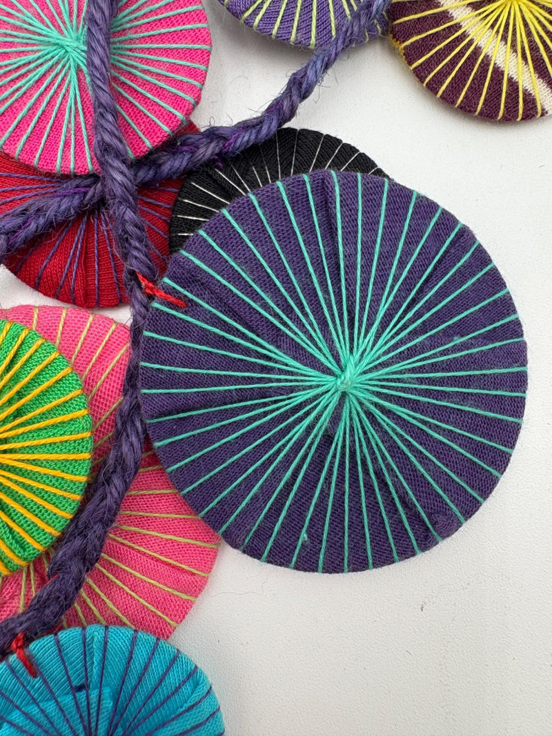 Multi-colored fabric disks with thread in starburst design. Cord is 4 strands with varying size disks and bound at the back of the neck with pink cotton. Drop from back of neck is 17". Goes with virtually any outfit, but particularly good with lagenlook style.
