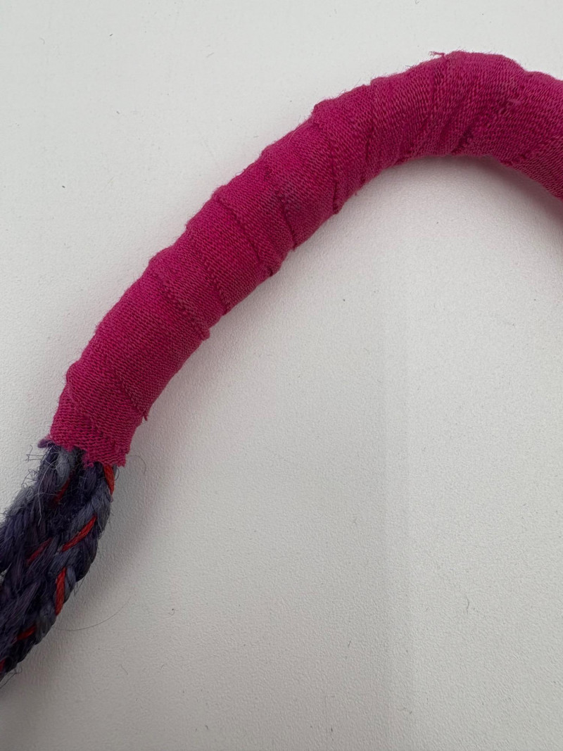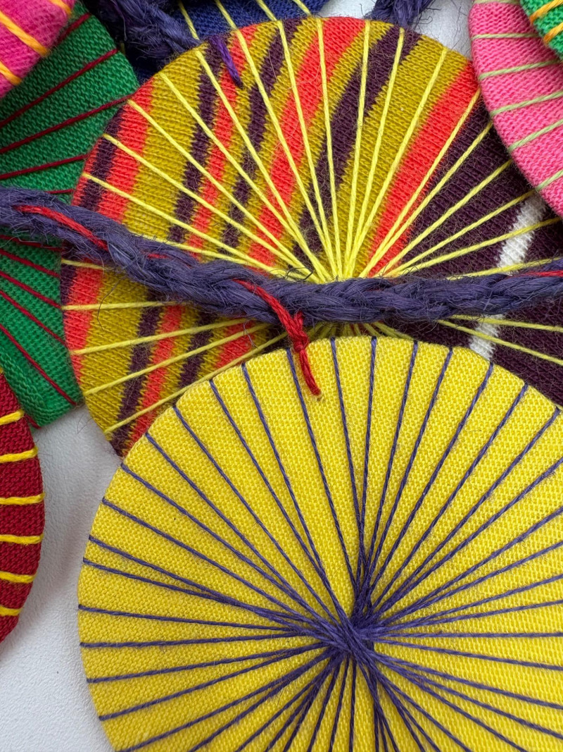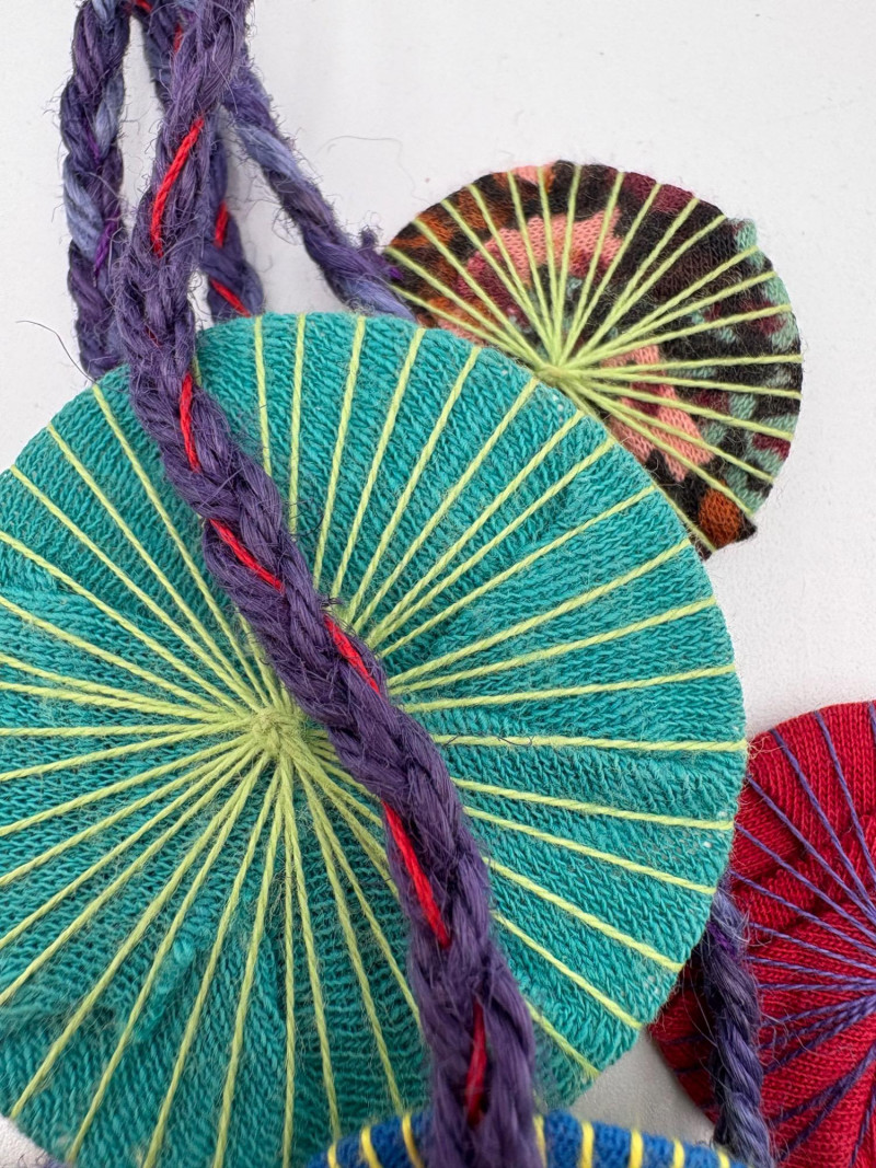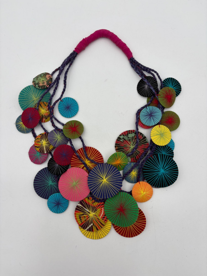 Multi-colored fabric disks with thread in starburst design. Cord is 4 strands with varying size disks and bound at the back of the neck with pink cotton. Drop from back of neck is 17". Goes with virtually any outfit, but particularly good with lagenlook style.