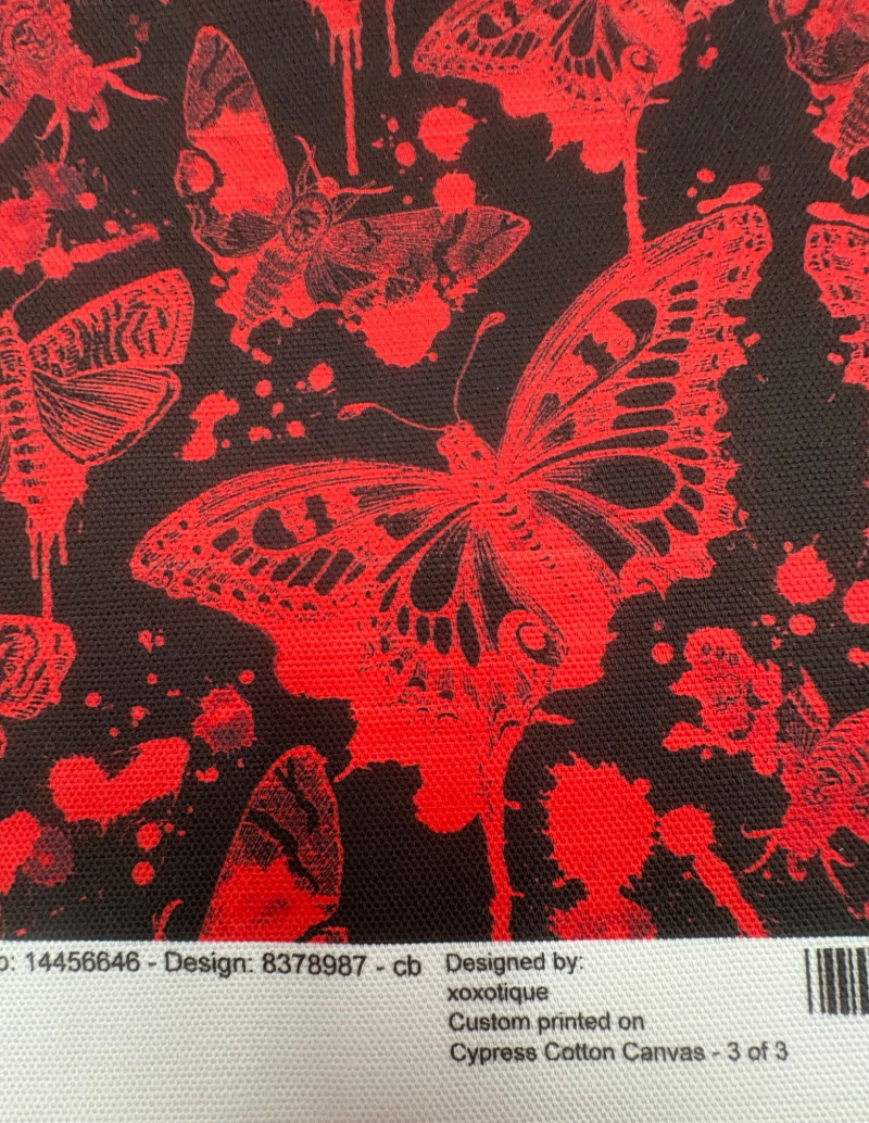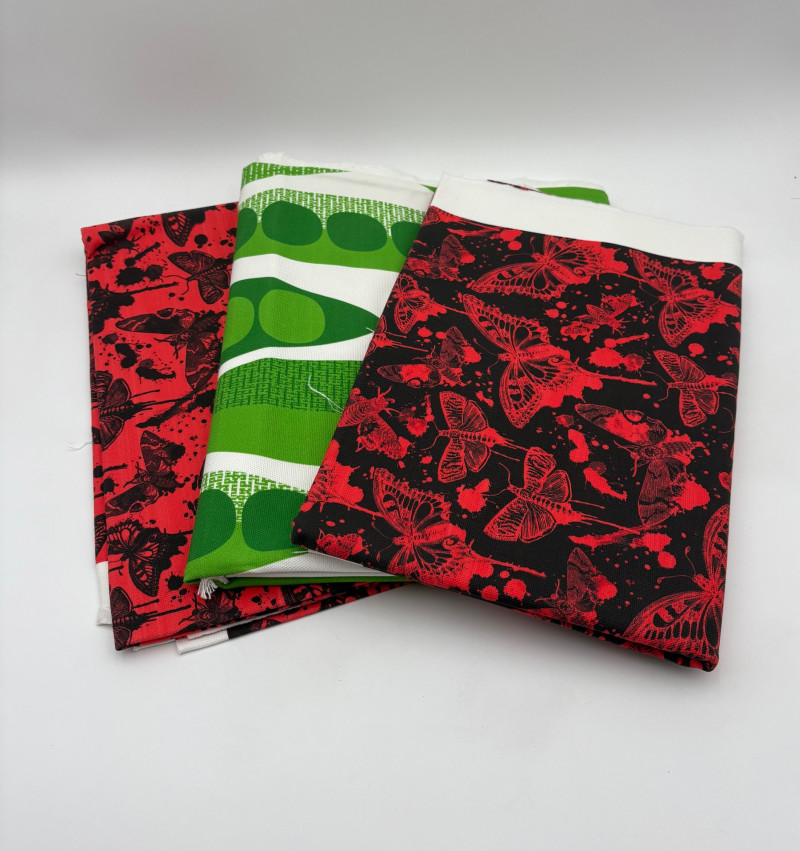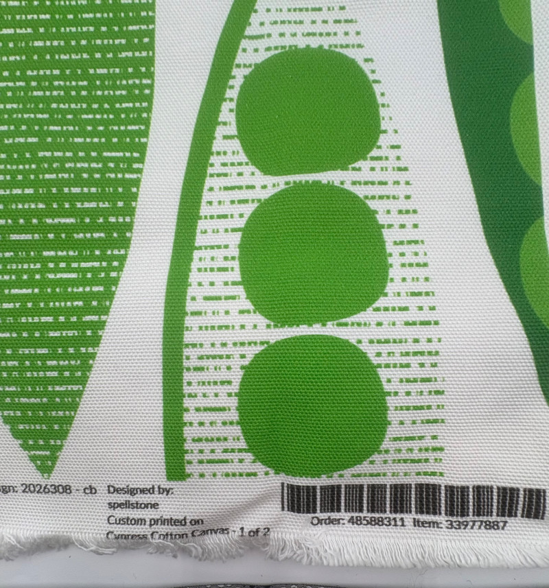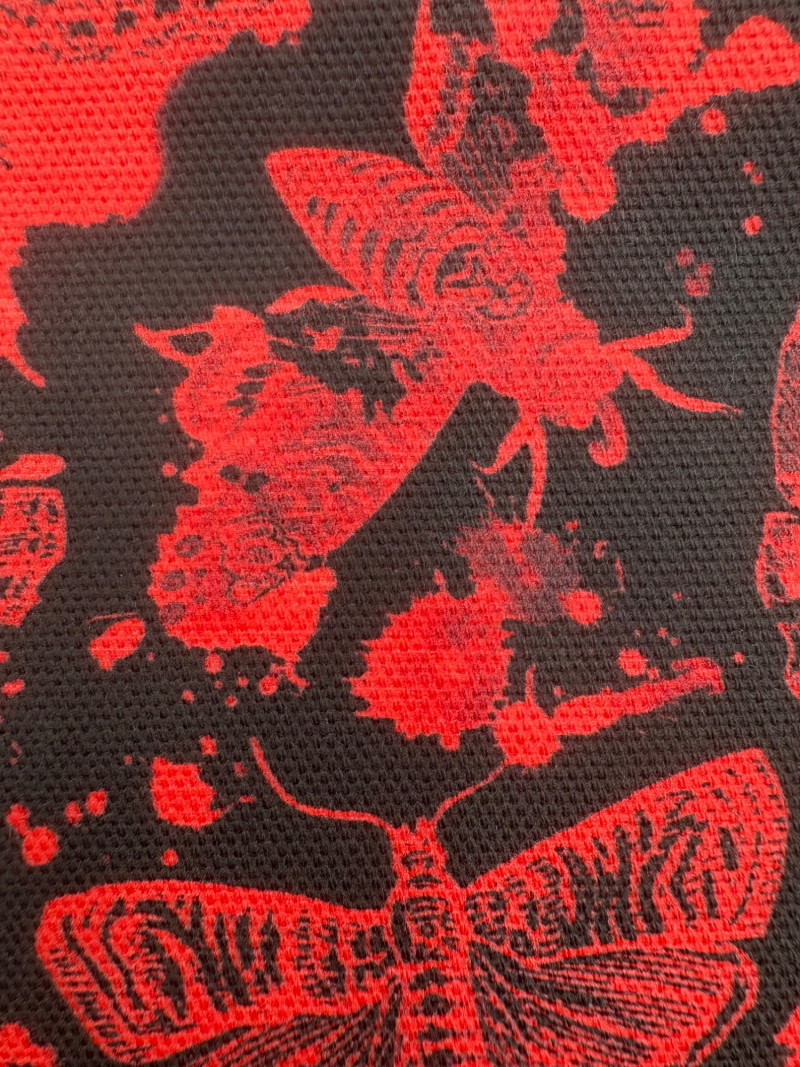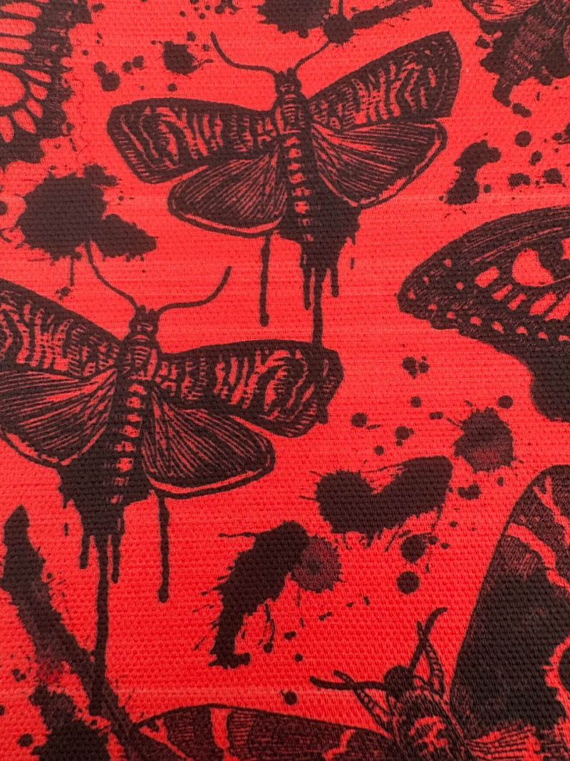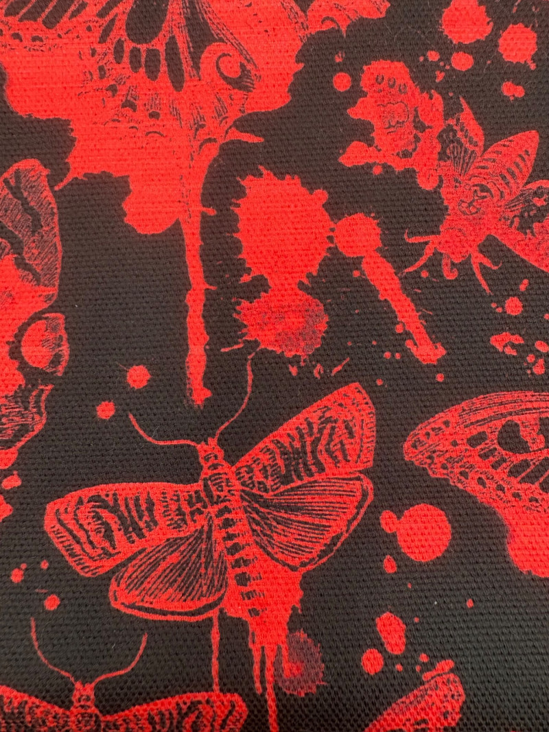 These 3 custom-printed fabrics are from Spoonflower in cotton canvas. As a custom print, the canvas is 60" wide, but the actual printed area is 56". Great heavy weave suitable for bags, pillows, or light upholstery. - Moths & Ink on black. 1 yard. NOT pre-washed & shrunk. - Green peas. Just shy 1 yard (35") Pre-washed & shrunk. - Moths & Ink on red. 1 yard. NOT pre-washed & shrunk.