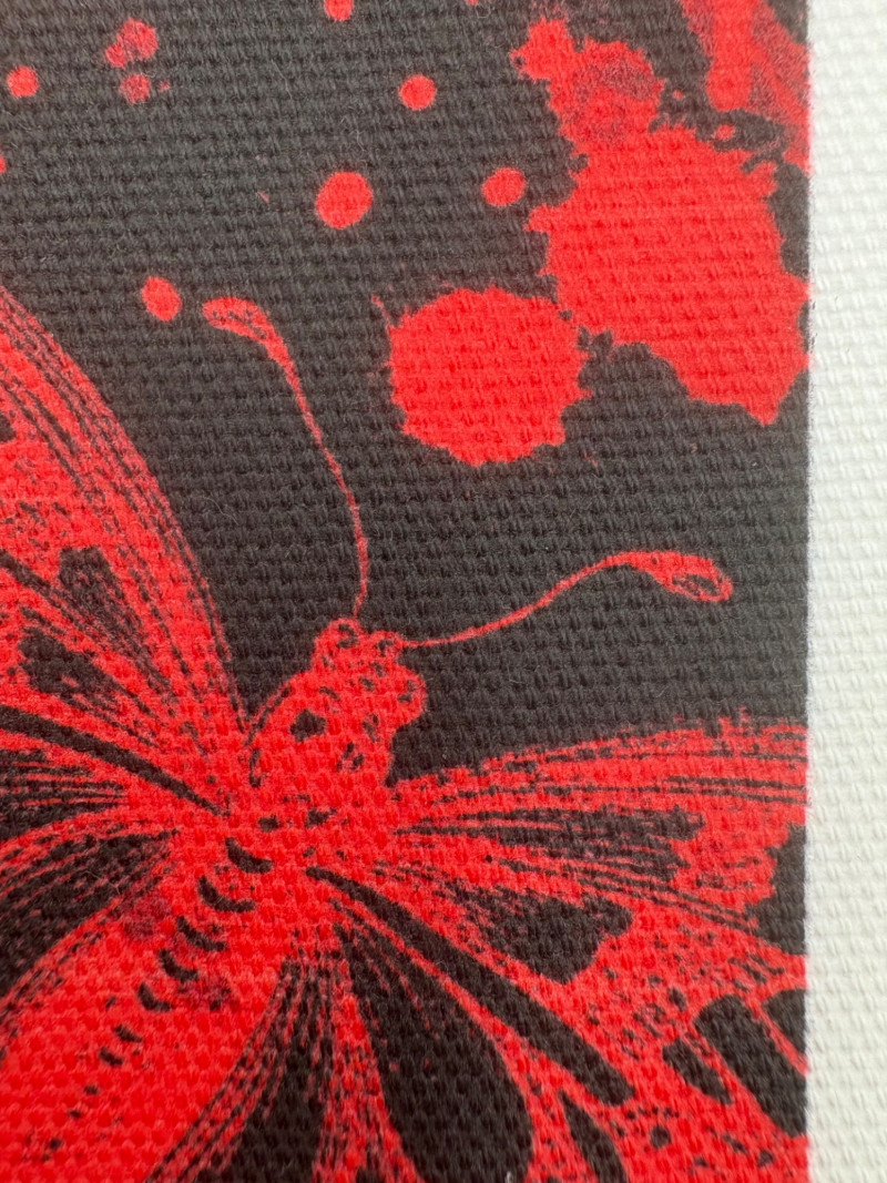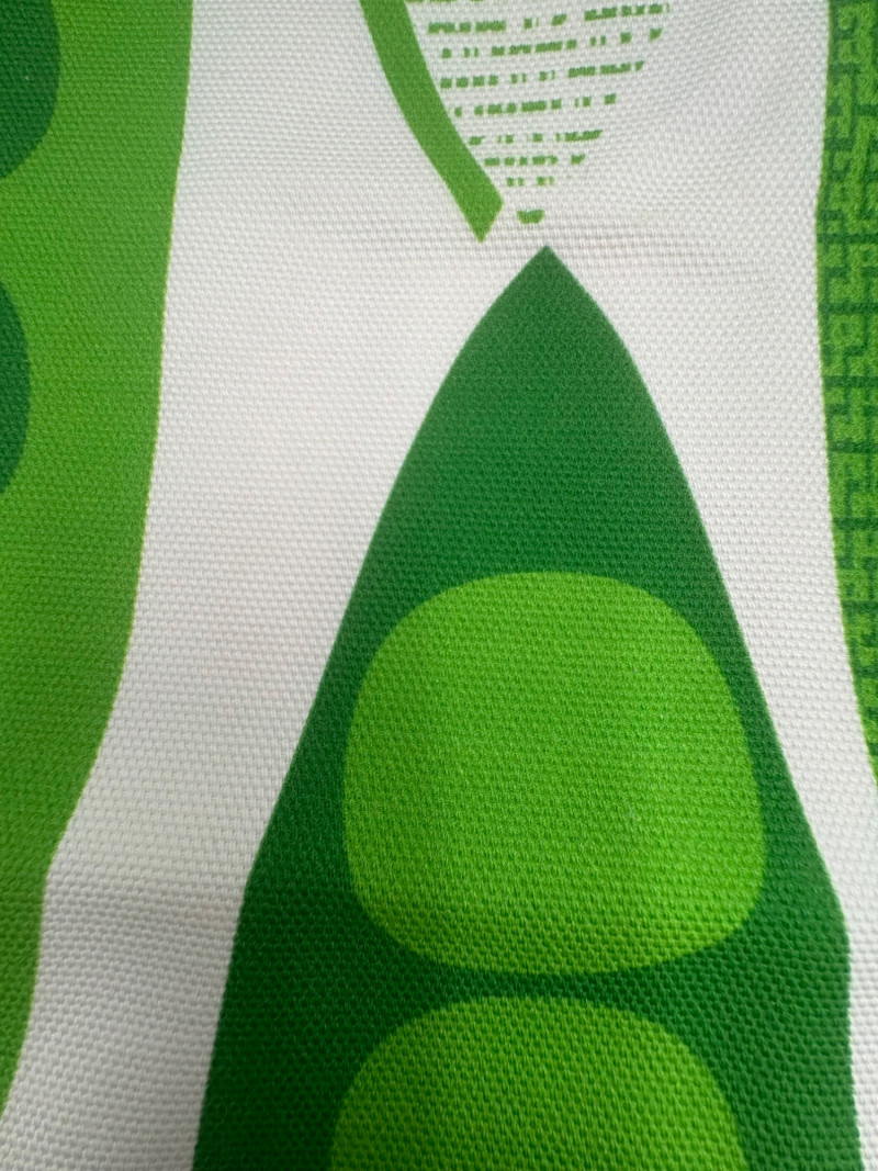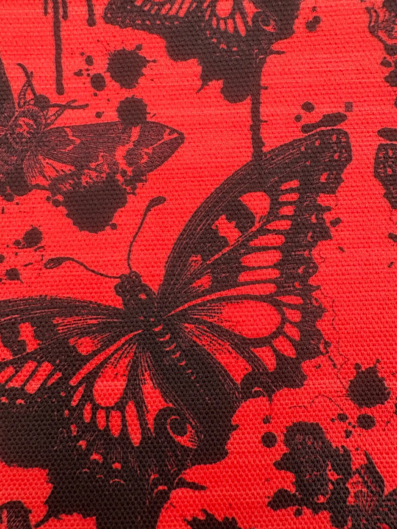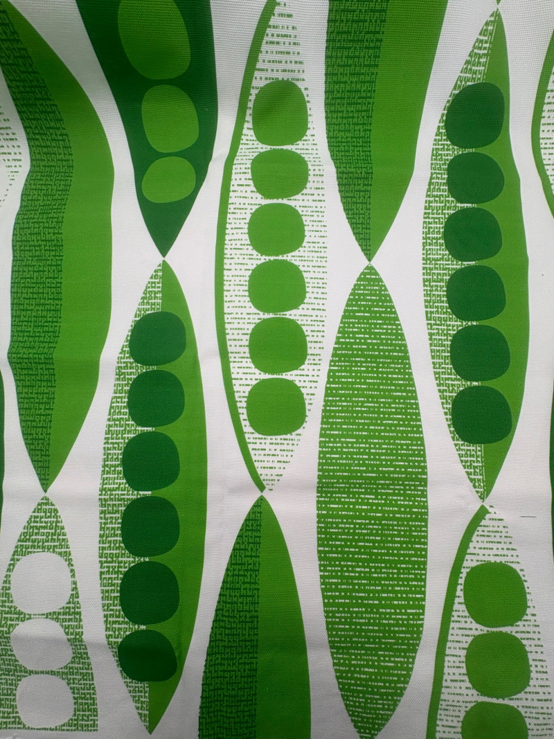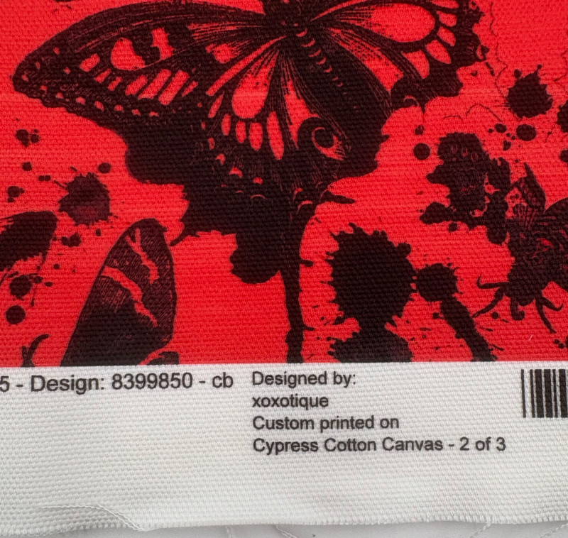 These 3 custom-printed fabrics are from Spoonflower in cotton canvas. As a custom print, the canvas is 60" wide, but the actual printed area is 56". Great heavy weave suitable for bags, pillows, or light upholstery. - Moths & Ink on black. 1 yard. NOT pre-washed & shrunk. - Green peas. Just shy 1 yard (35") Pre-washed & shrunk. - Moths & Ink on red. 1 yard. NOT pre-washed & shrunk.