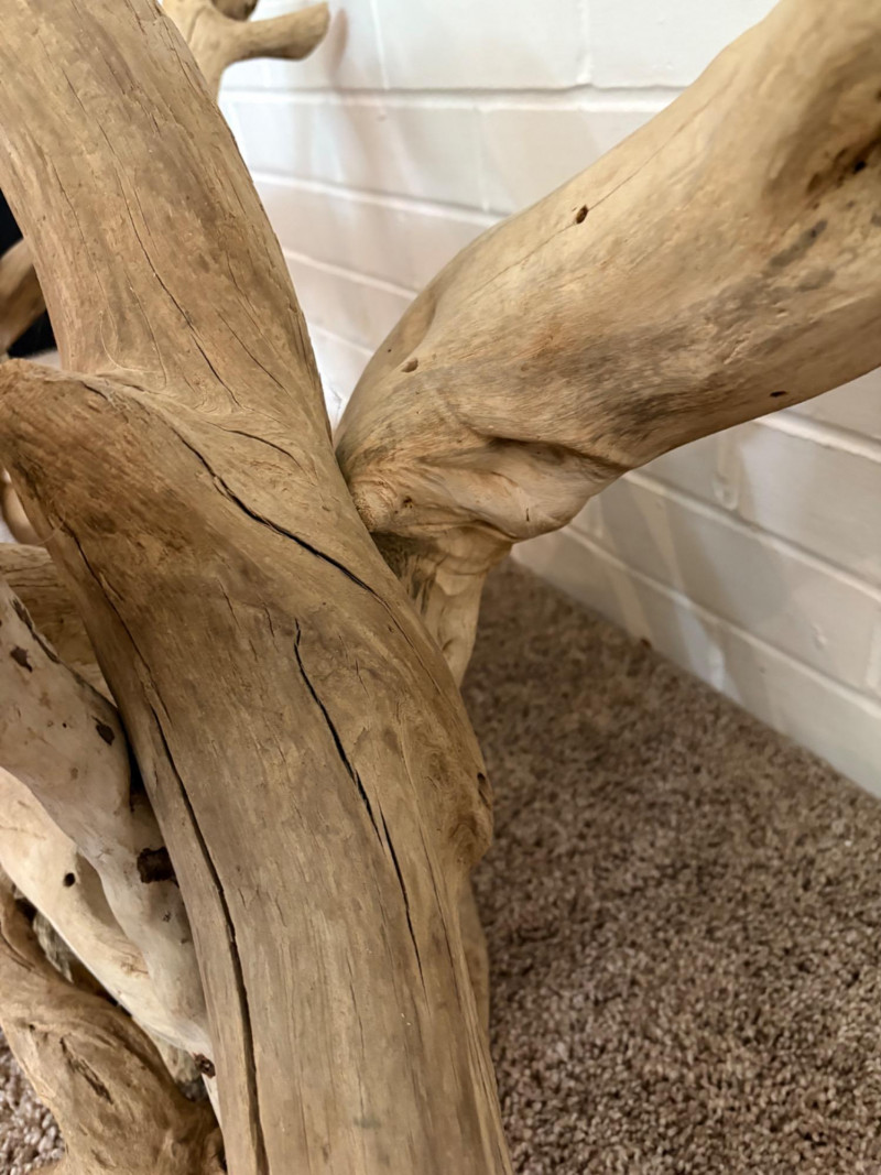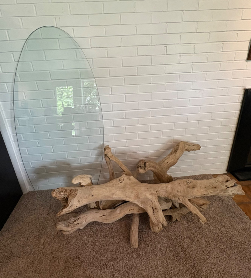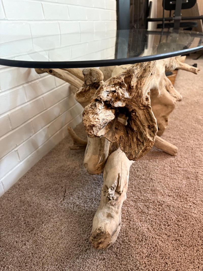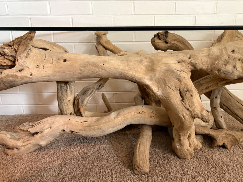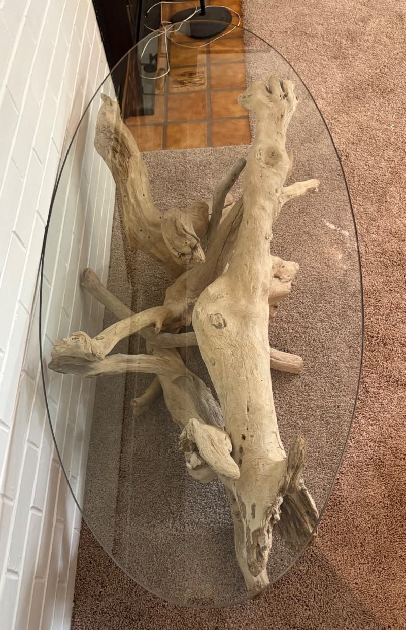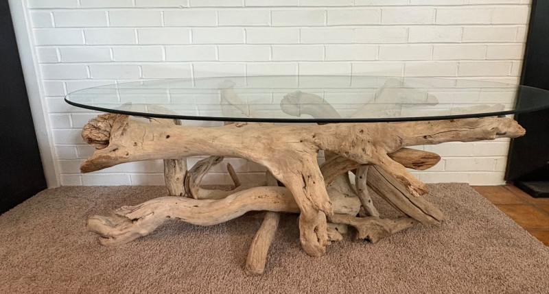 Really unique driftwood coffee table with oval tempered glass top. Driftwood sits intertwined at the base and the glass is secured on the base by its weight (the glass is only 1/2" thick, but sturdy and heavy for its size). Table measures approx. 18" H x 54" L by 24" W. In excellent condition. Local Pickup Only. Bidding on this lot is an agreement that: (1.) You will have 2 capable, able-bodied persons to lift and load at a minimum. (2.) You will bring a hand truck and/or any other tools needed to remove this item. If these steps are not followed your item will be forfeited and no refund given.