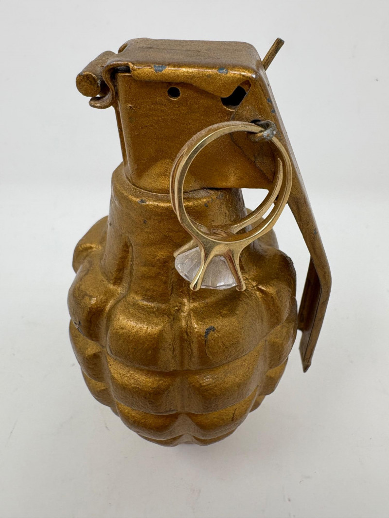 Our absolutely favorite art piece in this auction! "Grenade“ by Seattle artist Jena Scott. While there is no explanation accompanying the piece, we assume that the wedding ring as the grenade’s pin says it all. Measures approximately 4.5" H. Sound Estate Company does not appraise art or guarantee authenticity.