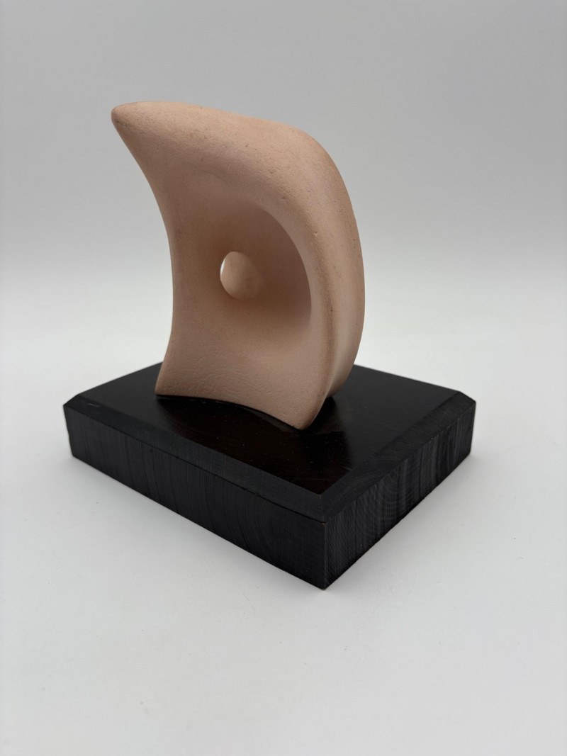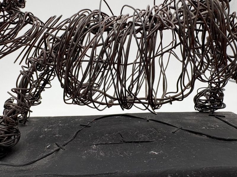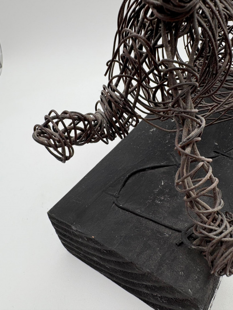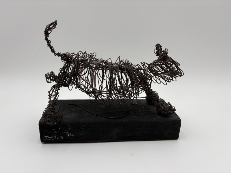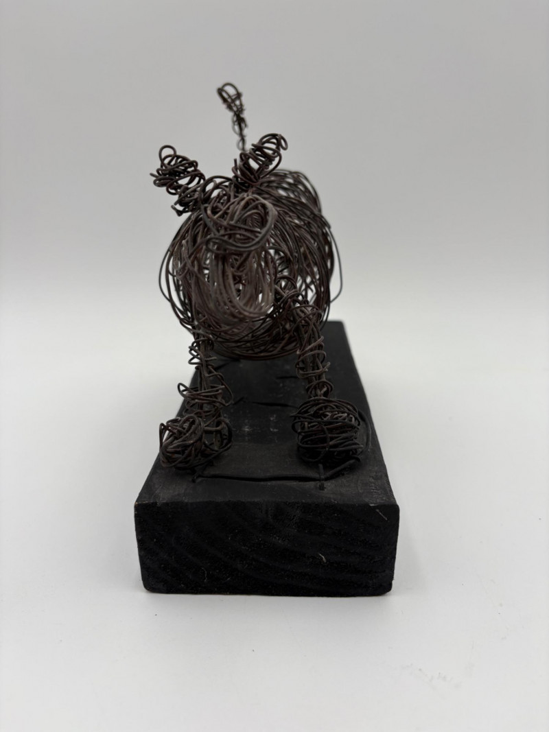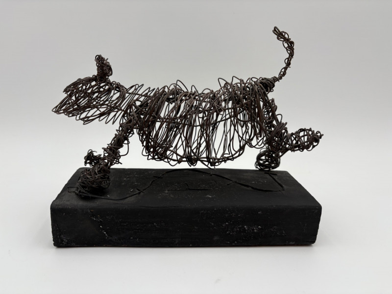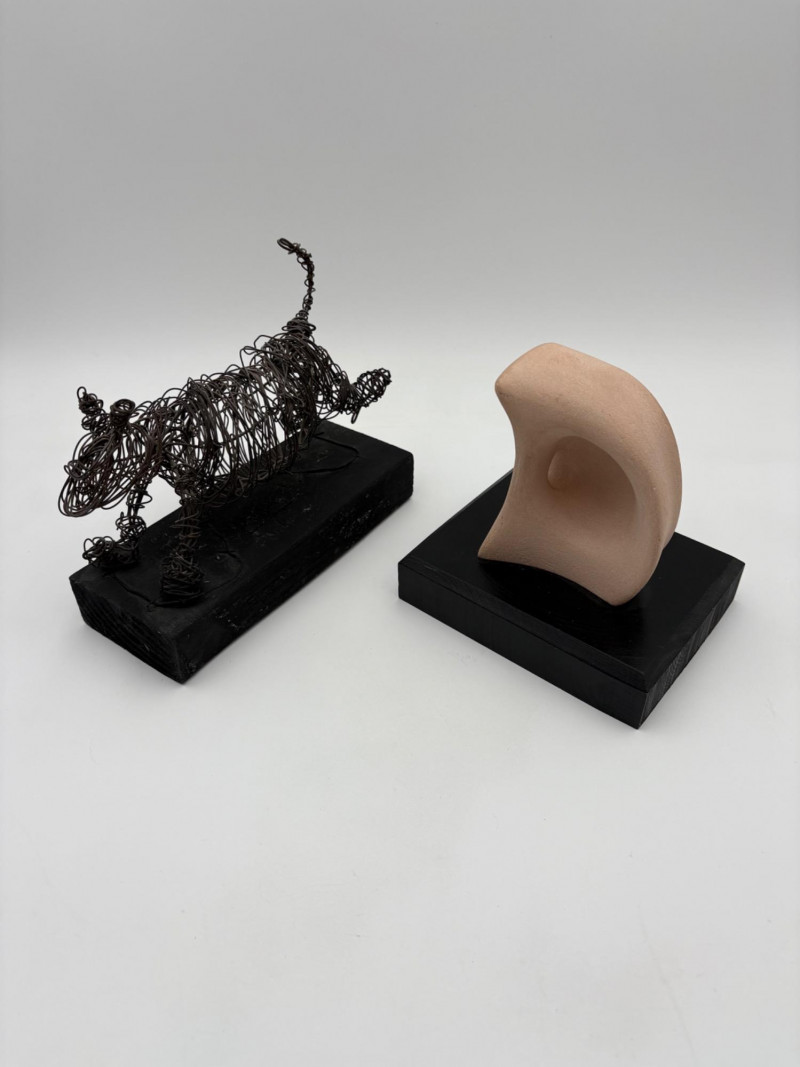 This pair of sculptures were two of our client's favorites - she like to juxtapose them showing fine and folk art compatibility. Wire dog folk sculpture from unknown artist. Made of ordinary black wire, mounted on a slice of black painted 2 x 4, this piece measures 7.25" H x 8.75" W x 3.5" D. We are unsure if the dog is running or taking care of business - new owner gets to decide. The second sculpture is a mystery - client thought it could be a maquette for a larger work done by British sculptor Barbara Hepworth. Client was unable to have it authenticated (galleries/foundations are reluctant nowadays to authenticate because of liability issues if a work is later shown to be fake), but strongly feels that if it is not Hepworth's original work, its creator was purposely emulating her style. Ceramic mounted on black wood base. Measures approx. 7" H x 6.25" W x 5" D. Sound Estate Company does not appraise art or guarantee authenticity.