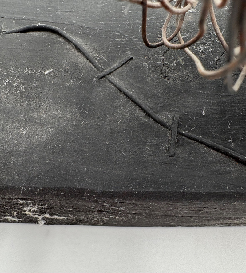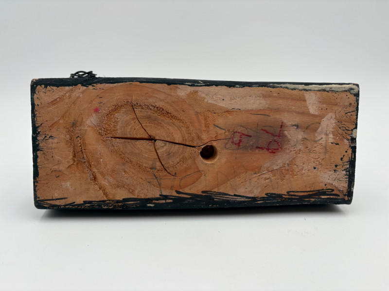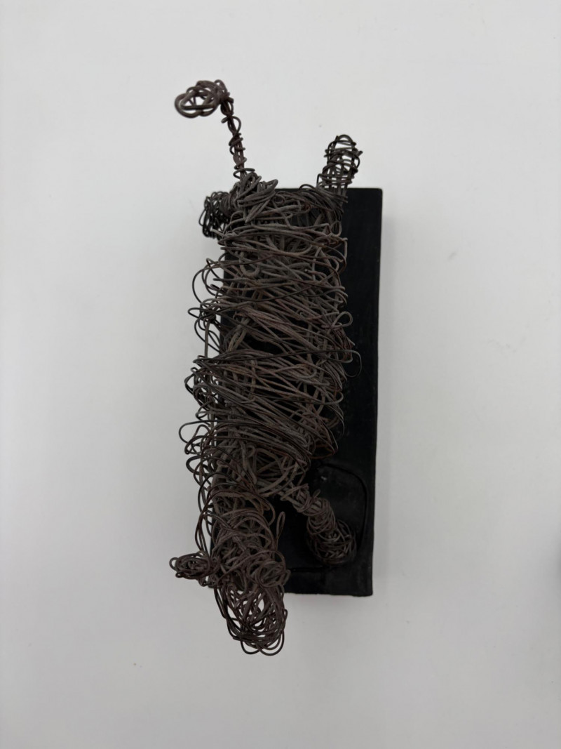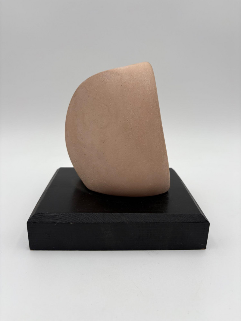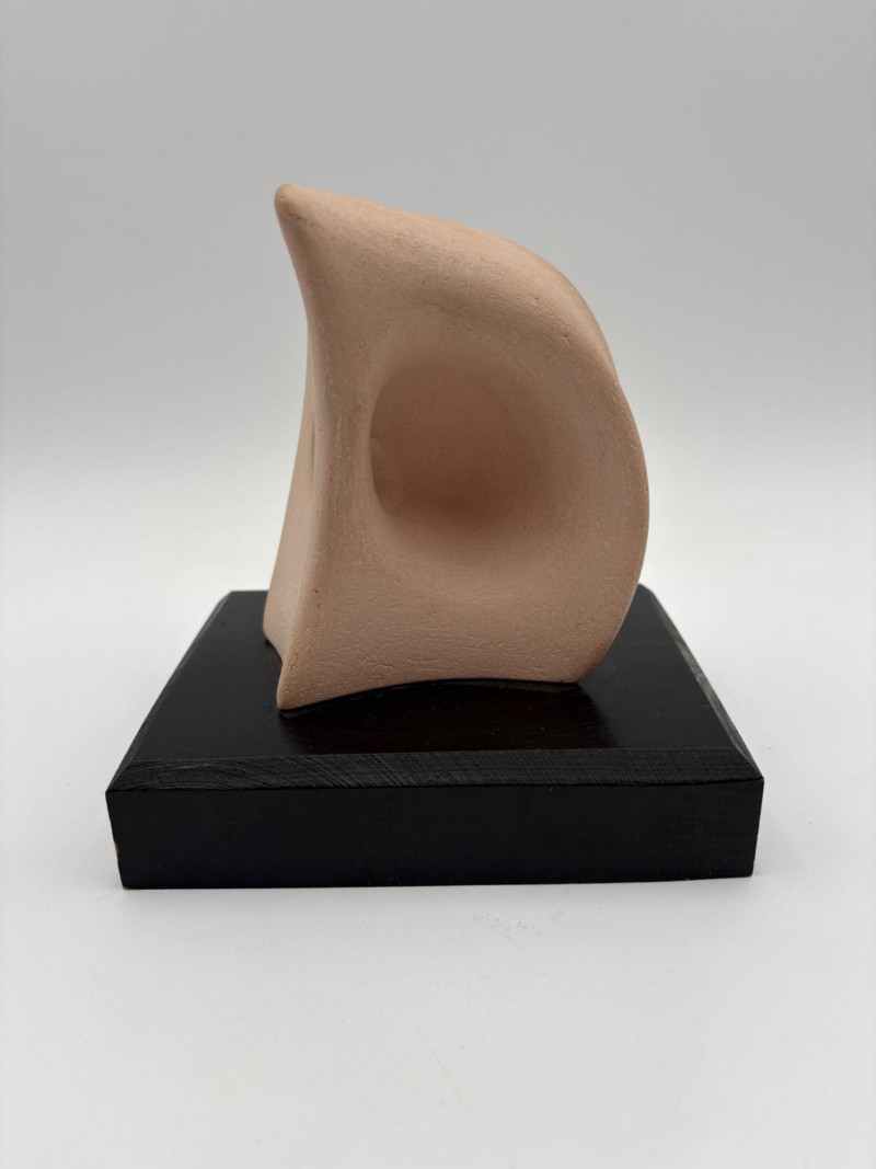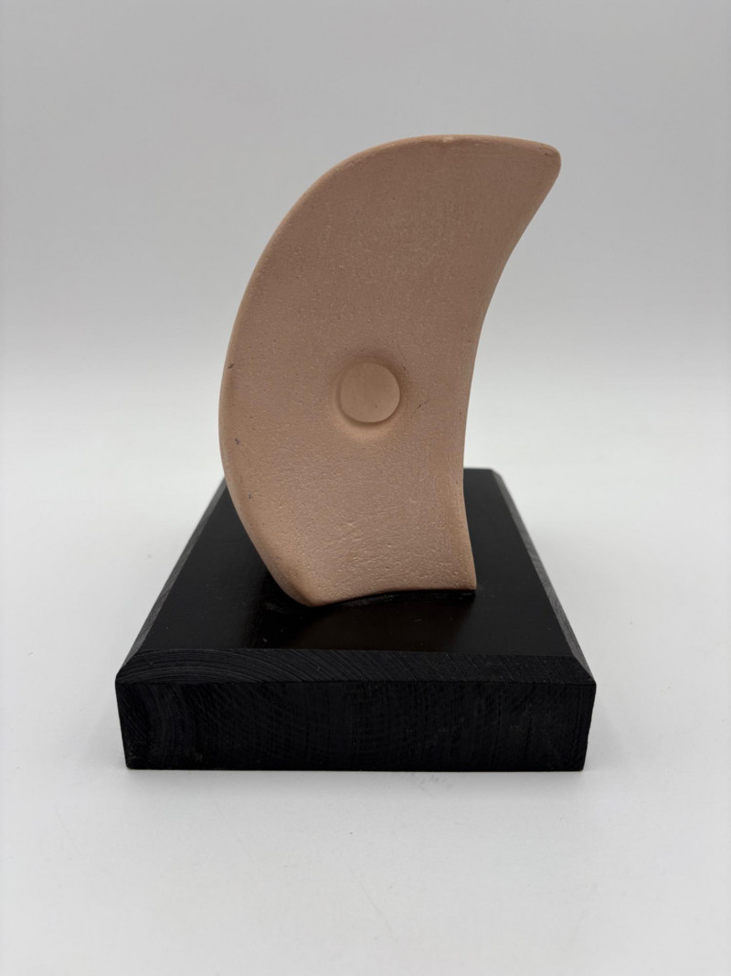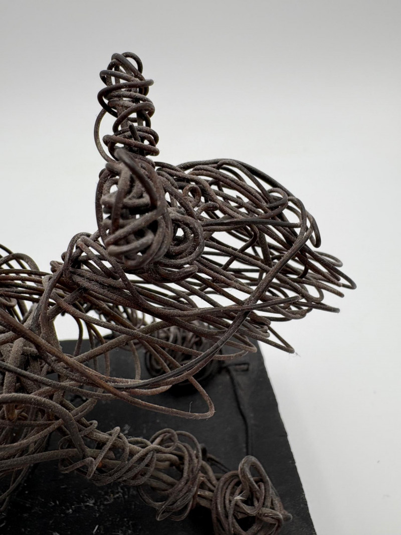 This pair of sculptures were two of our client's favorites - she like to juxtapose them showing fine and folk art compatibility. Wire dog folk sculpture from unknown artist. Made of ordinary black wire, mounted on a slice of black painted 2 x 4, this piece measures 7.25" H x 8.75" W x 3.5" D. We are unsure if the dog is running or taking care of business - new owner gets to decide. The second sculpture is a mystery - client thought it could be a maquette for a larger work done by British sculptor Barbara Hepworth. Client was unable to have it authenticated (galleries/foundations are reluctant nowadays to authenticate because of liability issues if a work is later shown to be fake), but strongly feels that if it is not Hepworth's original work, its creator was purposely emulating her style. Ceramic mounted on black wood base. Measures approx. 7" H x 6.25" W x 5" D. Sound Estate Company does not appraise art or guarantee authenticity.