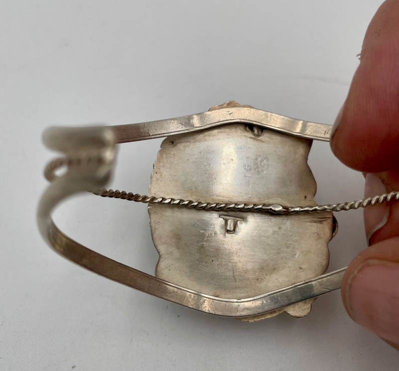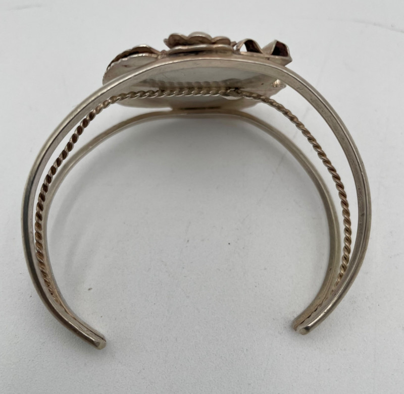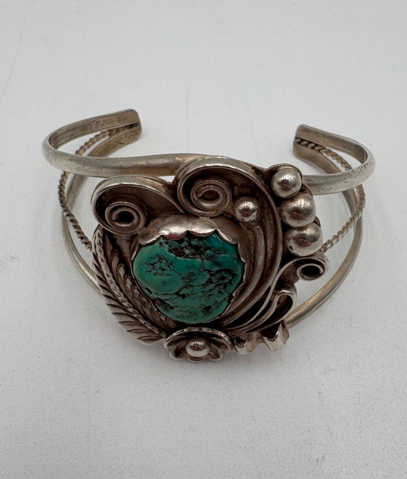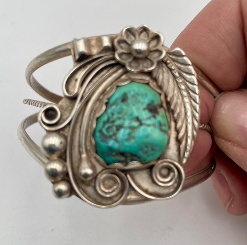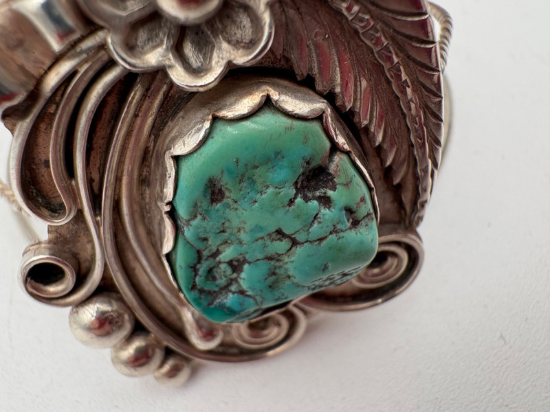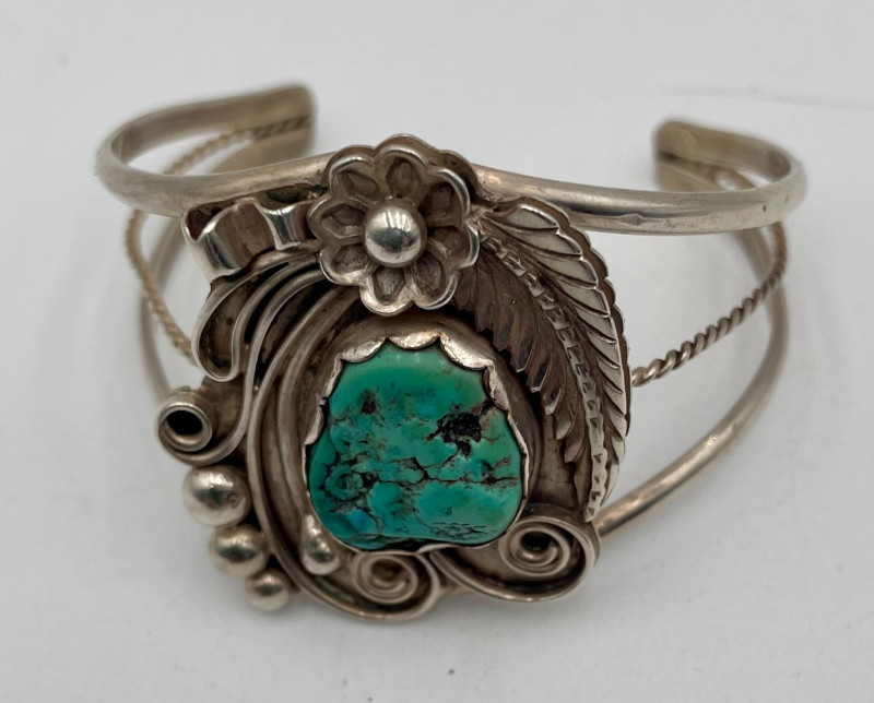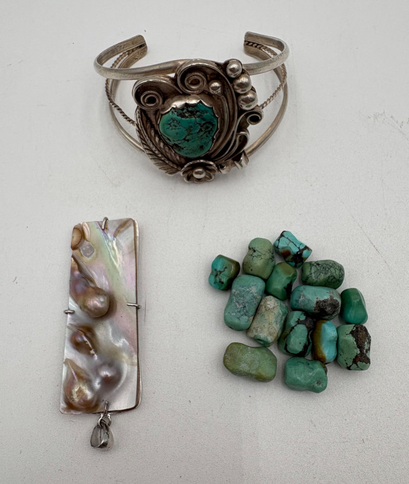 Sterling bracelet, pendant, and loose turquoise stones. Sterling silver cuff with turquoise stone along with leaf & flower flourishes. Artist stamp looks like "TJ" and it can fit any size wrist. Lovely delicate construction. Mother of pearl and sterling silver necklace pendant with beautiful colors. Small grouping of turquoise stones.