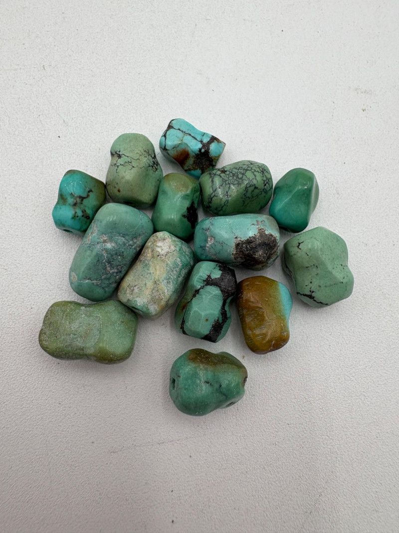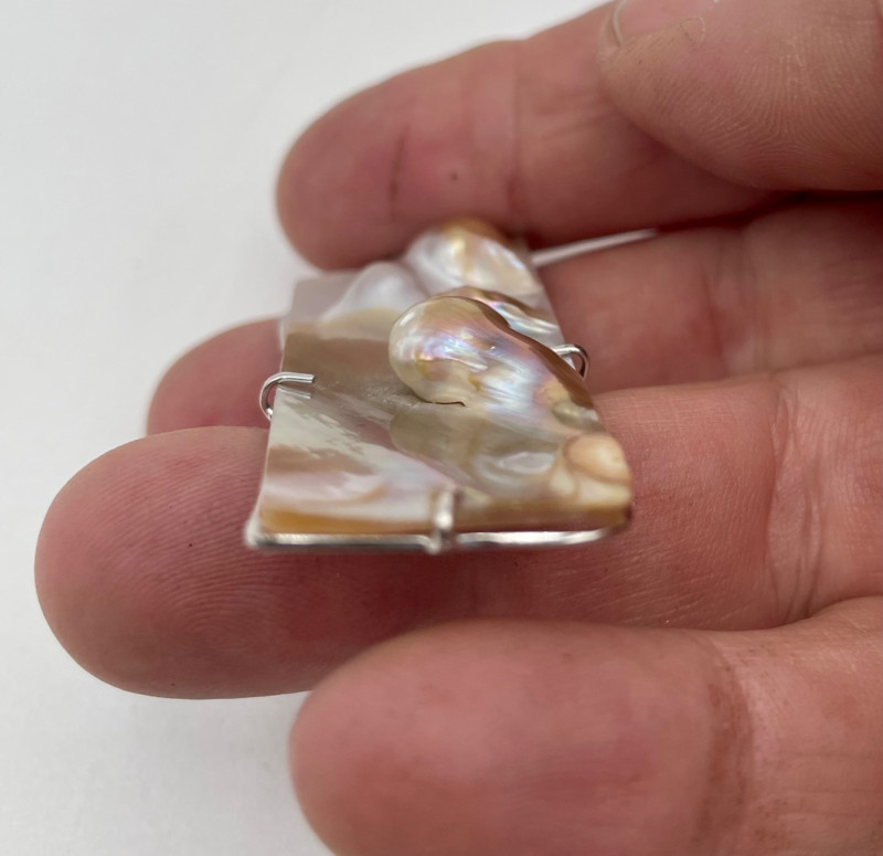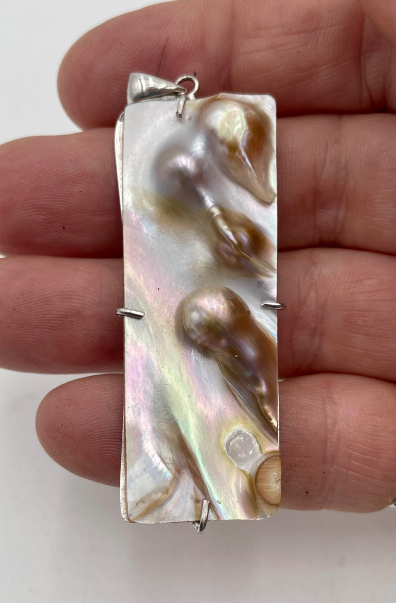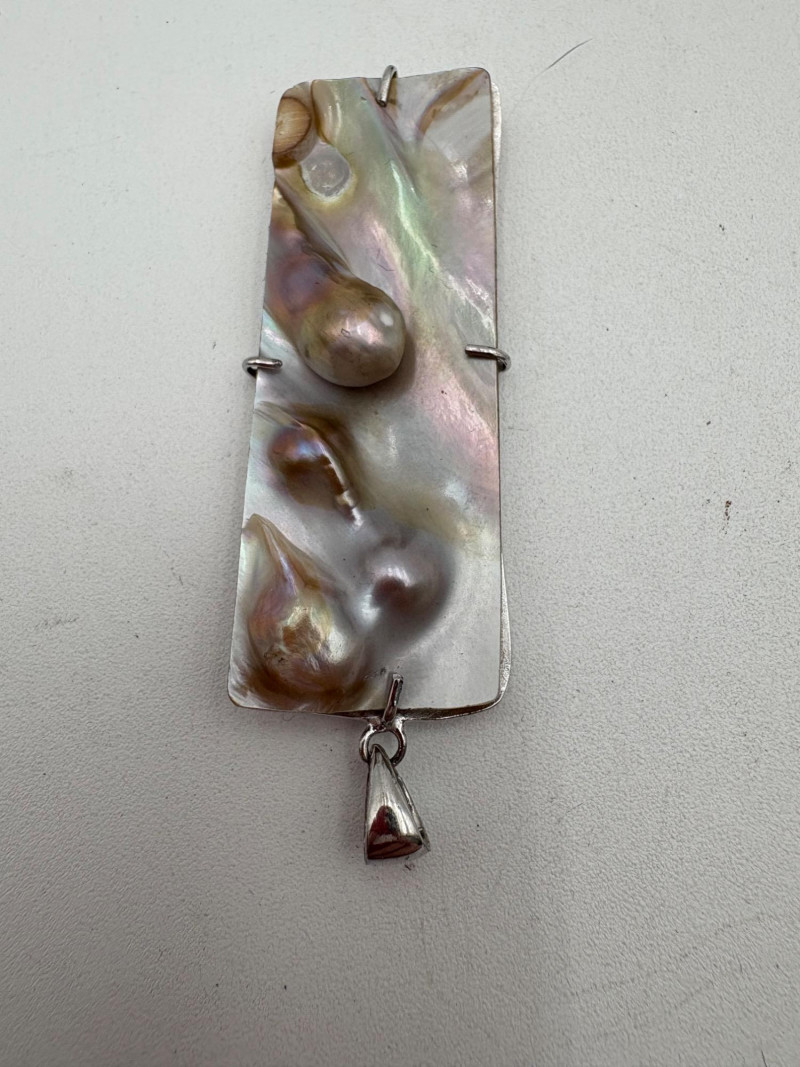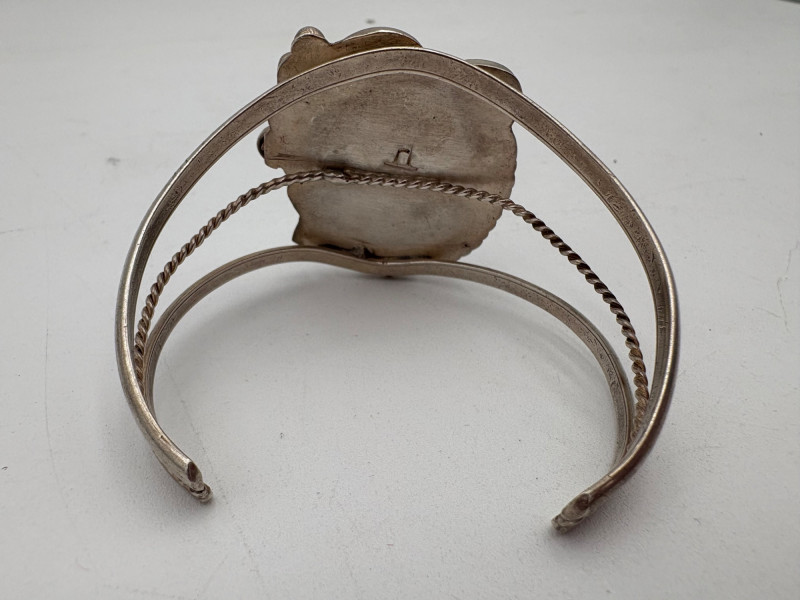 Sterling bracelet, pendant, and loose turquoise stones. Sterling silver cuff with turquoise stone along with leaf & flower flourishes. Artist stamp looks like "TJ" and it can fit any size wrist. Lovely delicate construction. Mother of pearl and sterling silver necklace pendant with beautiful colors. Small grouping of turquoise stones.
