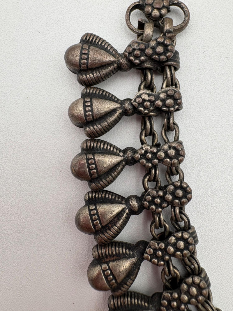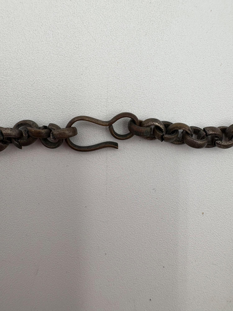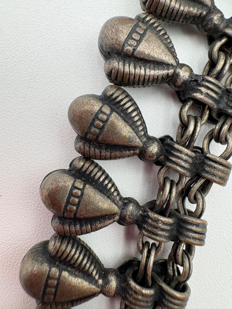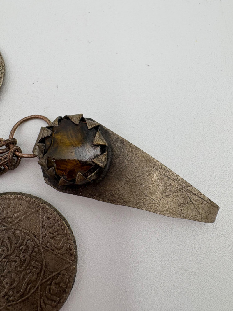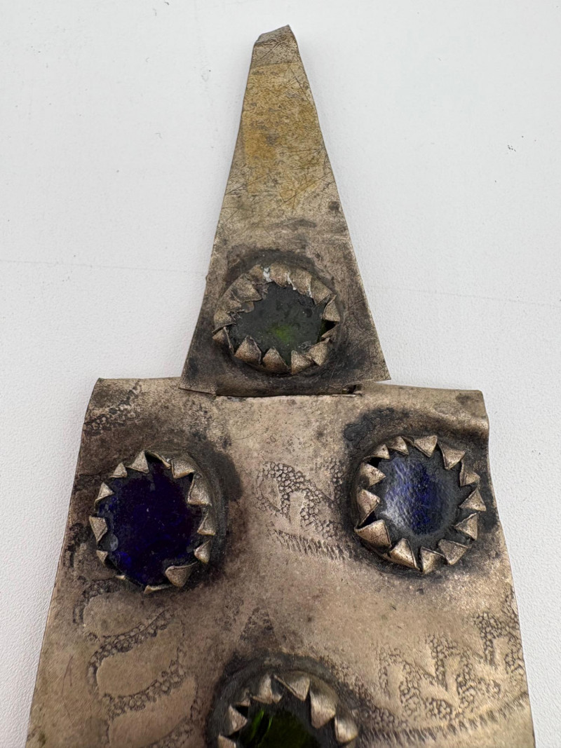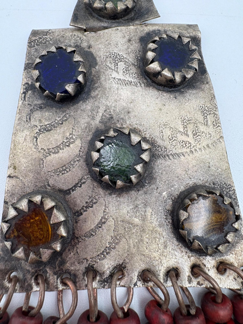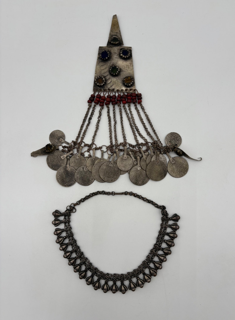 Two lovely pieces of jewelry from disparate places that our client loved equally! Antique metal, glass, and wood Berber headpiece purchased in Morocco circa late 1990s. Hand-made. Measures approx. 11.5" L. In good antique condition. Older decorative necklace purchased in India in the late 1990s. Unknown origin or provenance. Measures 15" L. with curved clasp. In good condition.