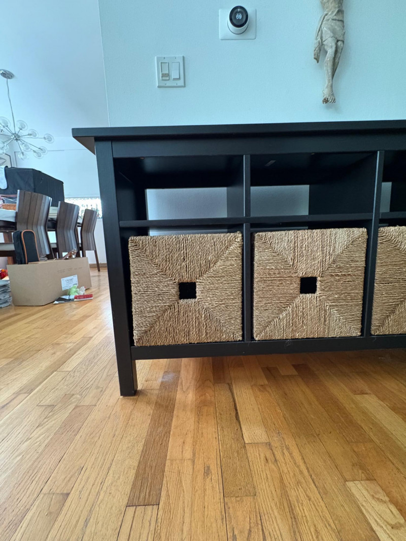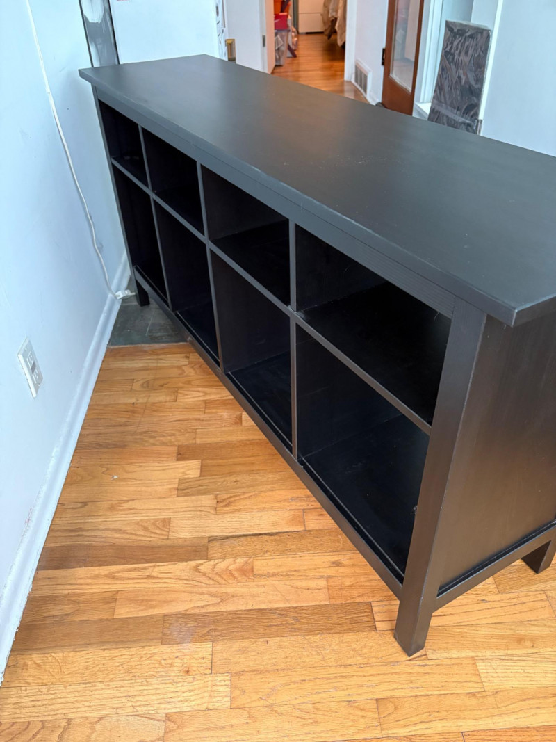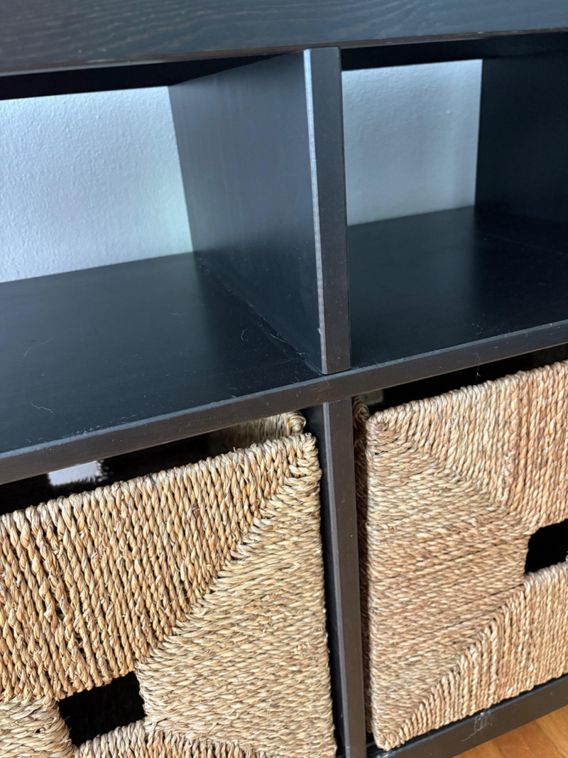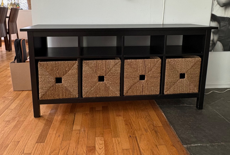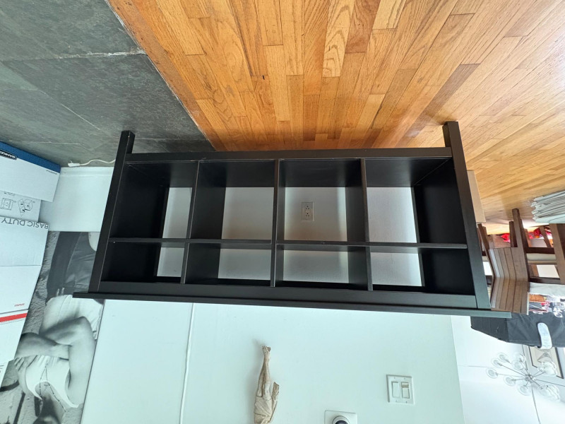 Black-brown 8-space storage unit. Measures 29" H x 61.75" W x 15.5" D. Comes with four very sturdy baskets that measure approximately 12 in.² that fit perfectly into the bottom four cube spaces. Baskets fold down flat when bottom insert is removed. Piece is in good used condition with a few scrapes here and there - nothing that a furniture crayon or a black Sharpie wouldn't cover easily. Top has a few minor marks that could also be easily covered - see last photos. Local Pickup Only. Bidding on this lot is an agreement that: (1.) You will have 2 capable, able-bodied persons to lift and load at a minimum. (2.) You will bring a hand truck and/or any other tools needed to remove this item. If these steps are not followed your item will be forfeited and no refund given.