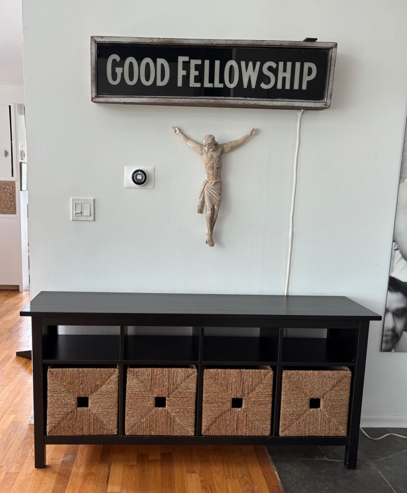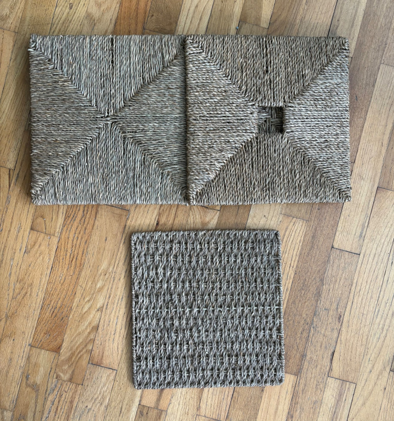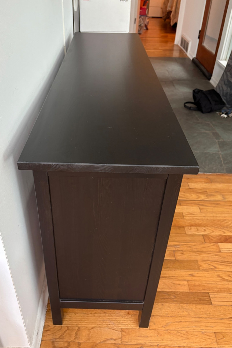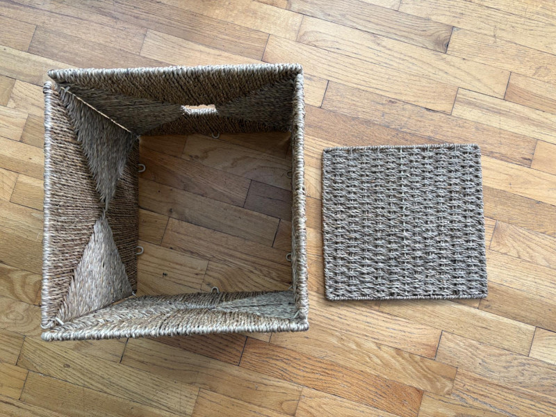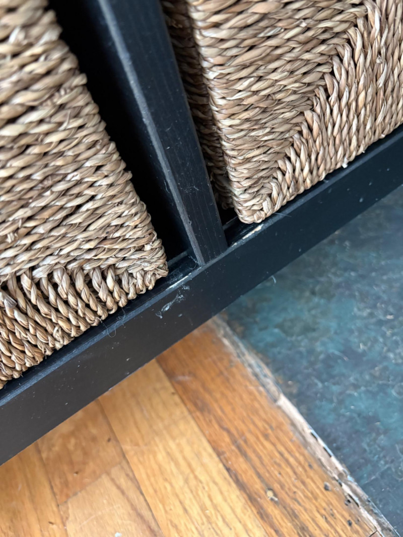 Black-brown 8-space storage unit. Measures 29" H x 61.75" W x 15.5" D. Comes with four very sturdy baskets that measure approximately 12 in.² that fit perfectly into the bottom four cube spaces. Baskets fold down flat when bottom insert is removed. Piece is in good used condition with a few scrapes here and there - nothing that a furniture crayon or a black Sharpie wouldn't cover easily. Top has a few minor marks that could also be easily covered - see last photos. Local Pickup Only. Bidding on this lot is an agreement that: (1.) You will have 2 capable, able-bodied persons to lift and load at a minimum. (2.) You will bring a hand truck and/or any other tools needed to remove this item. If these steps are not followed your item will be forfeited and no refund given.