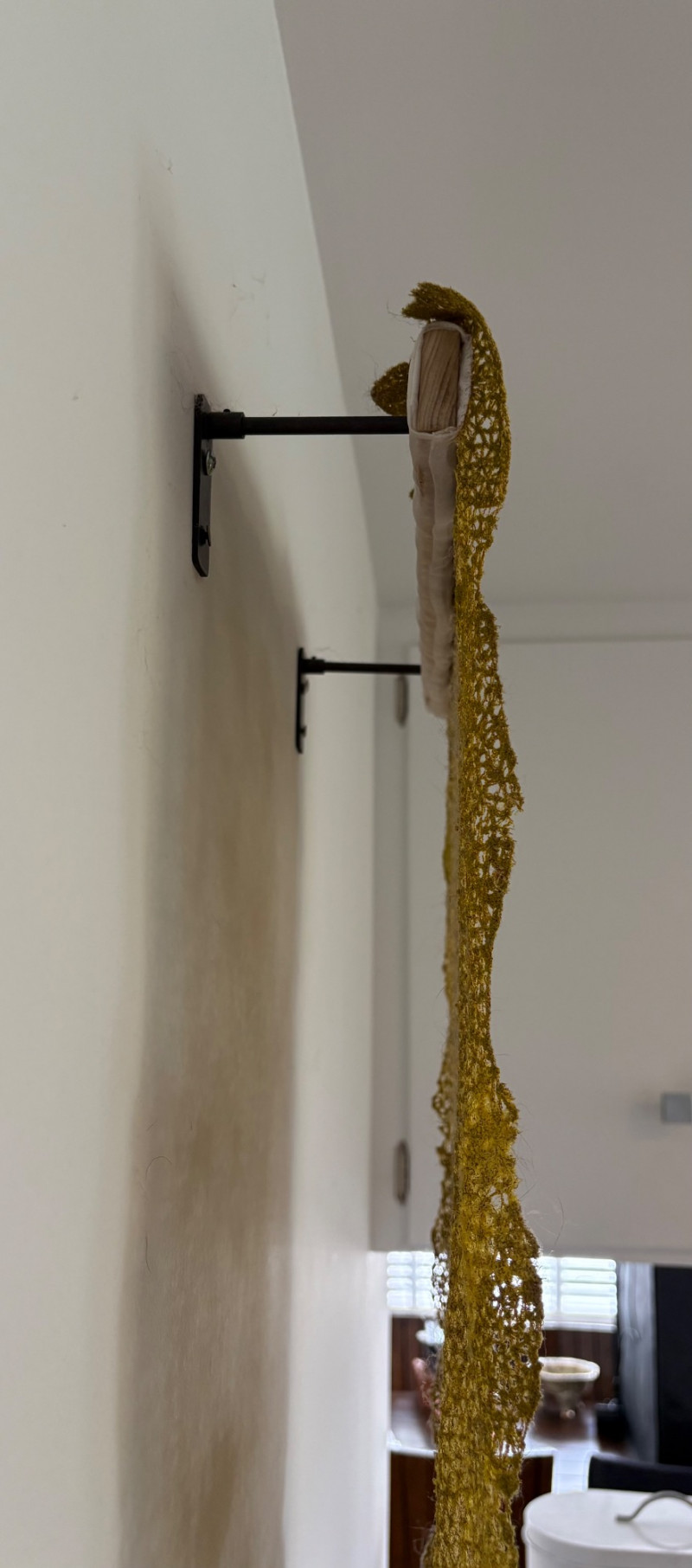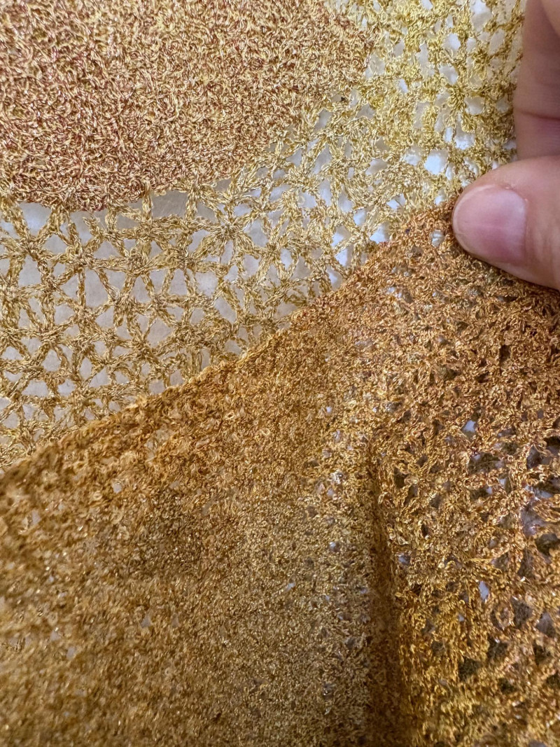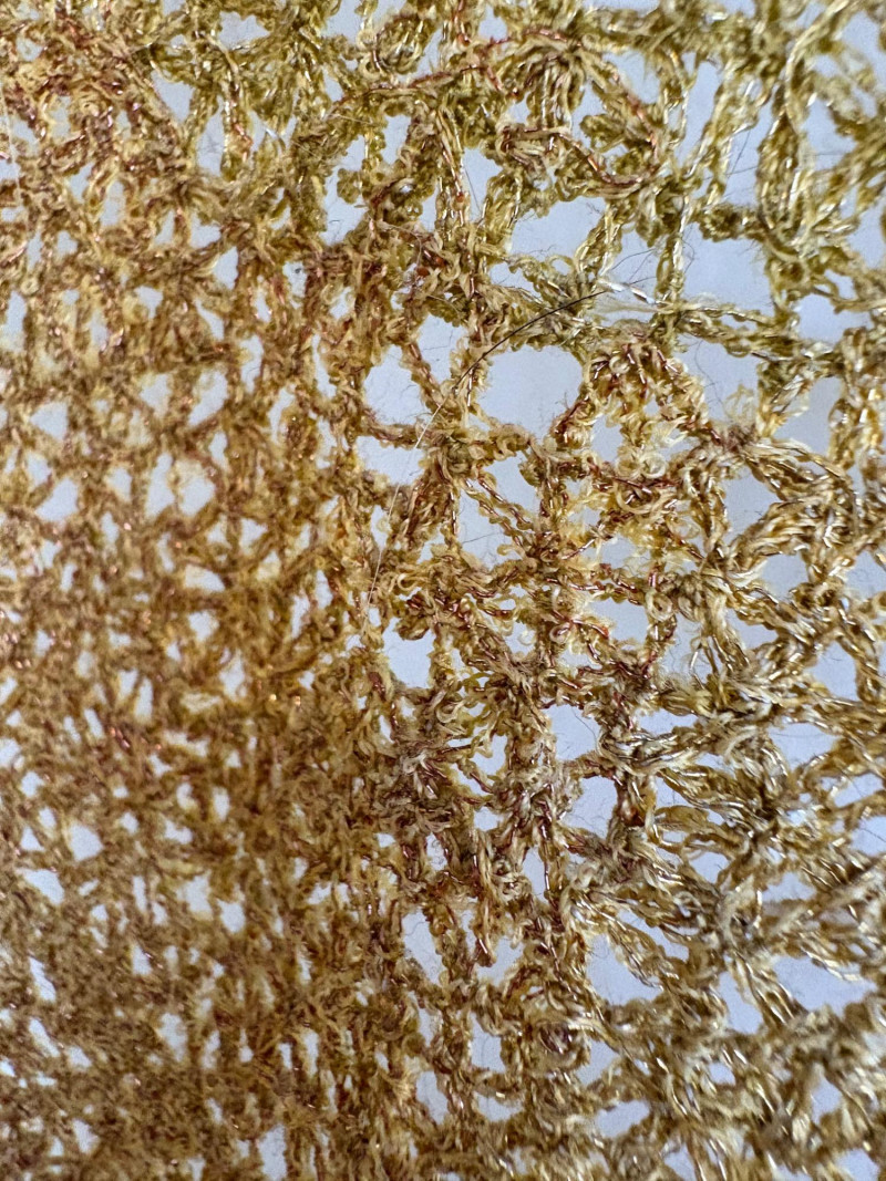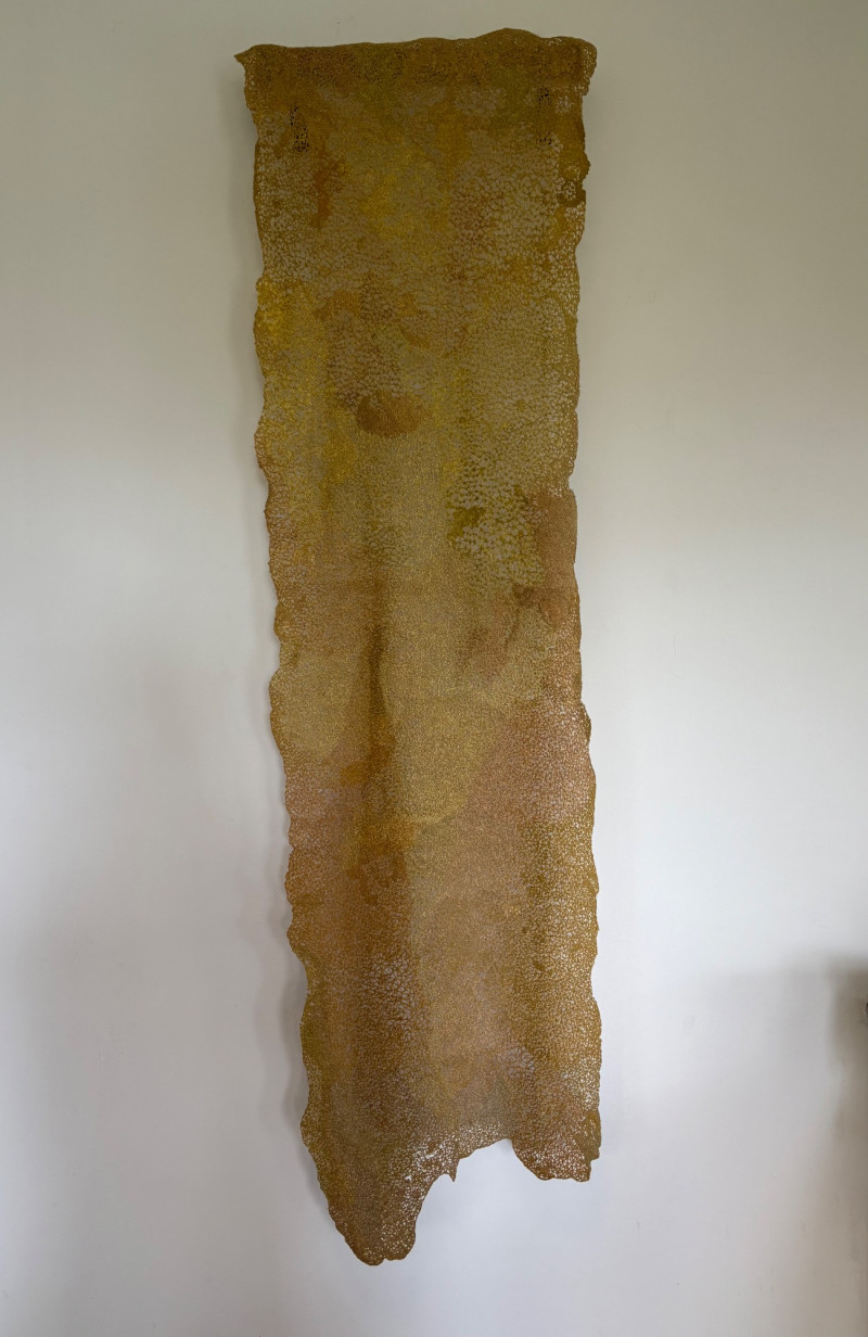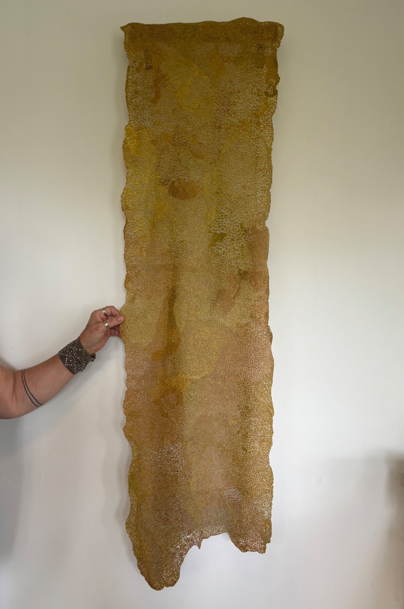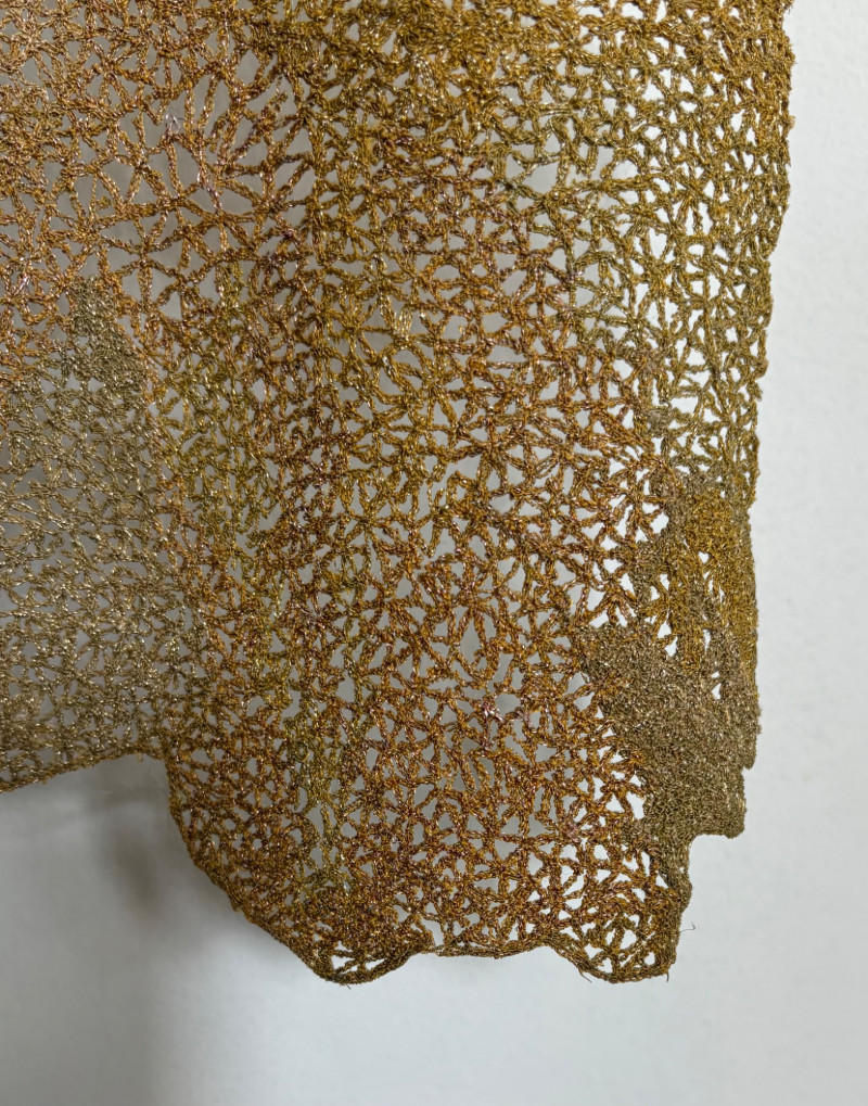 Stunning textile art in iridescent golds by unknown maker. Client purchased this piece at auction about 10 years ago despite auction house being unable to provide its history. However, client thought it was so beautiful that she didn't care. It is hand-made/woven with amazing intricacy and metallic threads. Has a metal & wood mount that extends the piece about 4" away from the wall. Measures approx. 56" L x 15" W with scallops and dips along the edges and asymmetrical hem. Fabulous piece of meticulous workmanship.