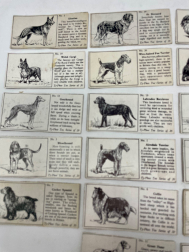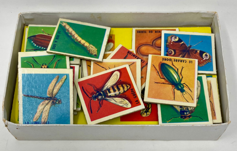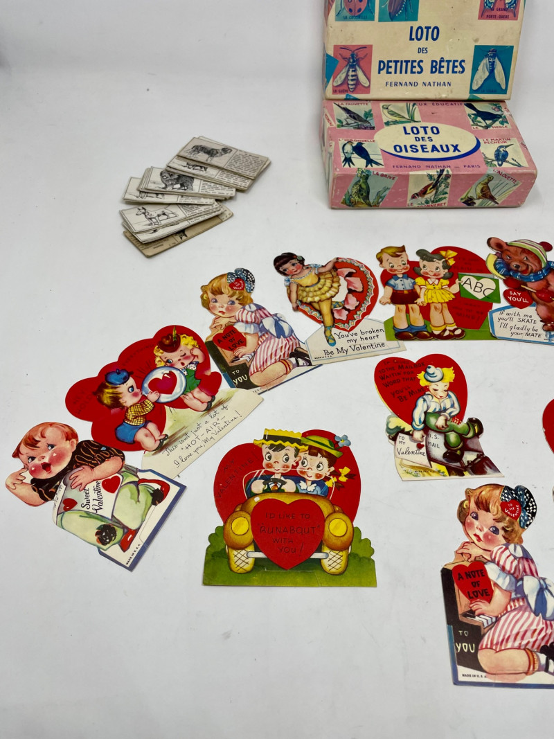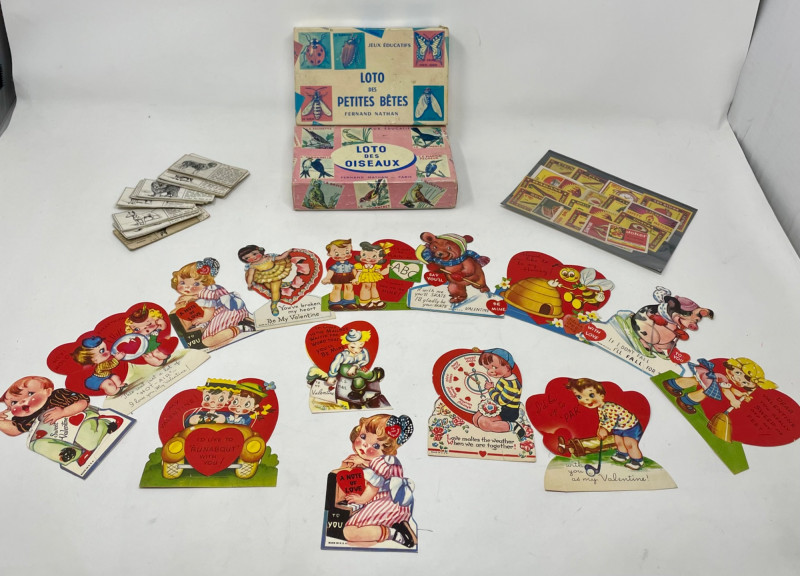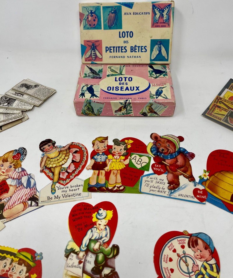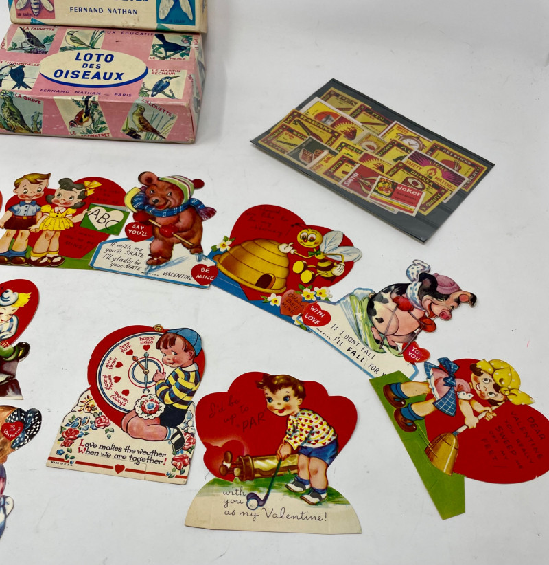 A great collection of antique tea cards, matchbox labels, vintage Valentine's Day cards, and French flashcards of birds and bugs - fantastic for art projects/collage and drawings: Vintage "Loto des Oiseaux" and "Loto des Petites Betes" cards by Ferdinand Nathan. These are small flashcard images of birds & bugs in French. In original boxes, 18 Vintage matchbox labels from India - large variety of imagery. Ty-Phoo Tea collector's cards of dog breeds. From 1955 - complete set of 20 with a few duplicate cards. 14 Vintage American St. Valentine's Day cards.