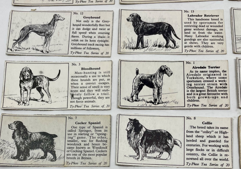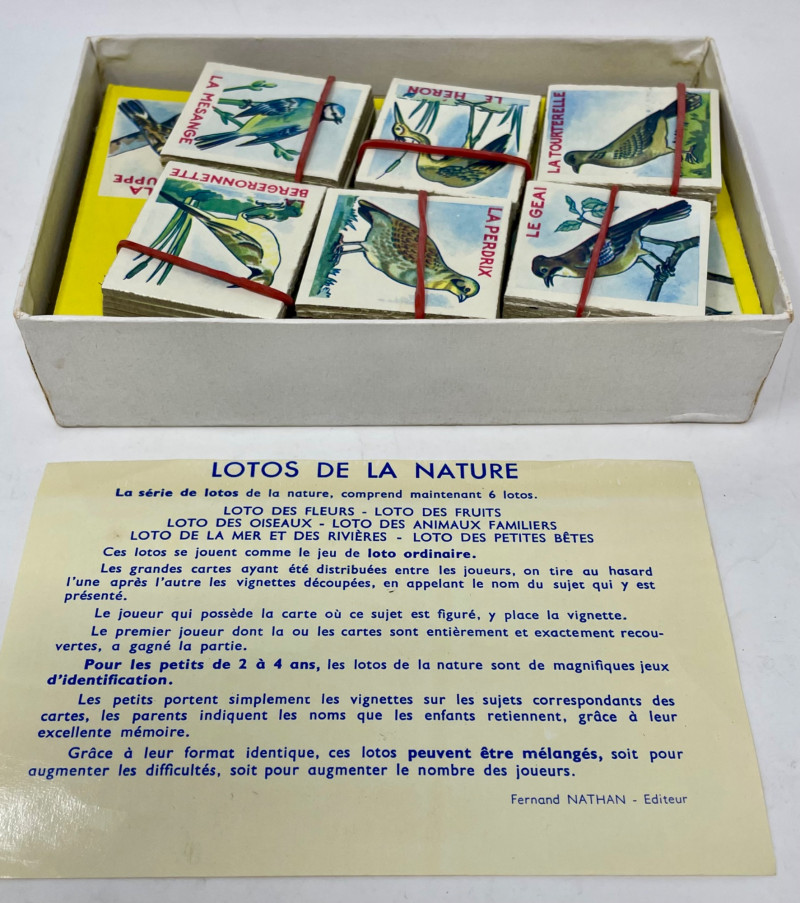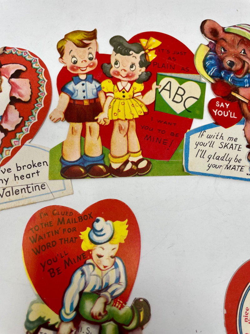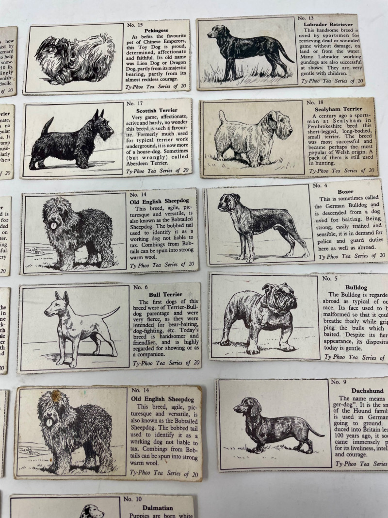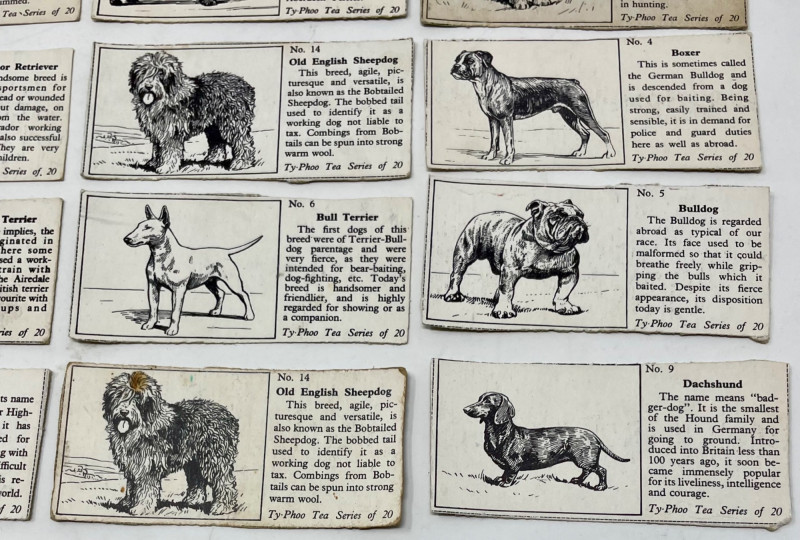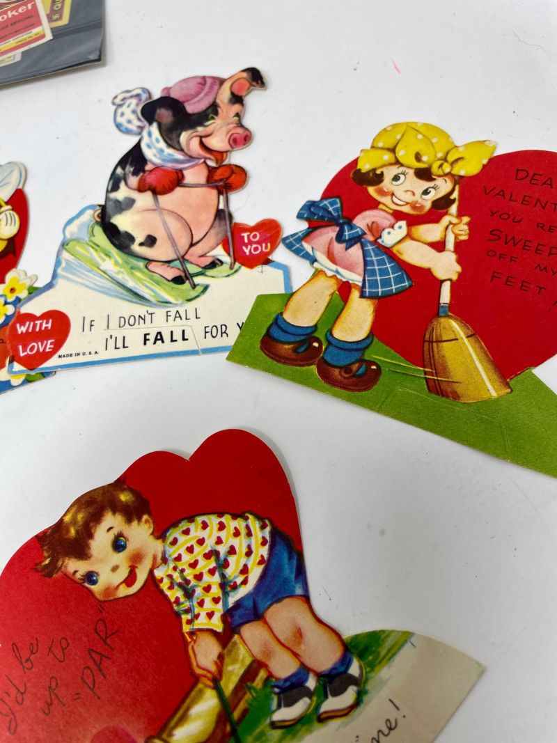 A great collection of antique tea cards, matchbox labels, vintage Valentine's Day cards, and French flashcards of birds and bugs - fantastic for art projects/collage and drawings: Vintage "Loto des Oiseaux" and "Loto des Petites Betes" cards by Ferdinand Nathan. These are small flashcard images of birds & bugs in French. In original boxes, 18 Vintage matchbox labels from India - large variety of imagery. Ty-Phoo Tea collector's cards of dog breeds. From 1955 - complete set of 20 with a few duplicate cards. 14 Vintage American St. Valentine's Day cards.