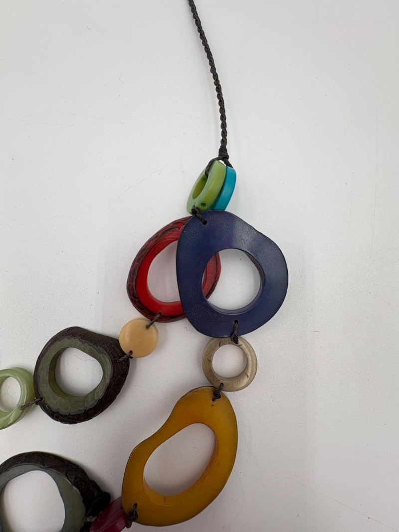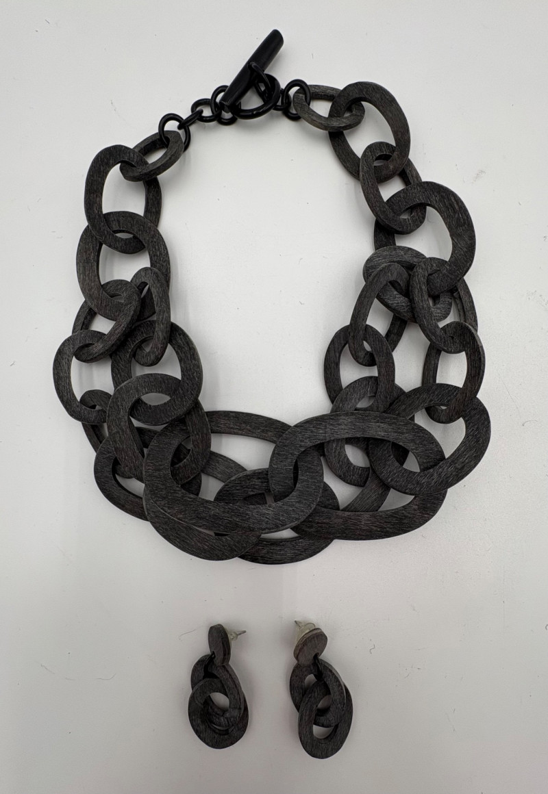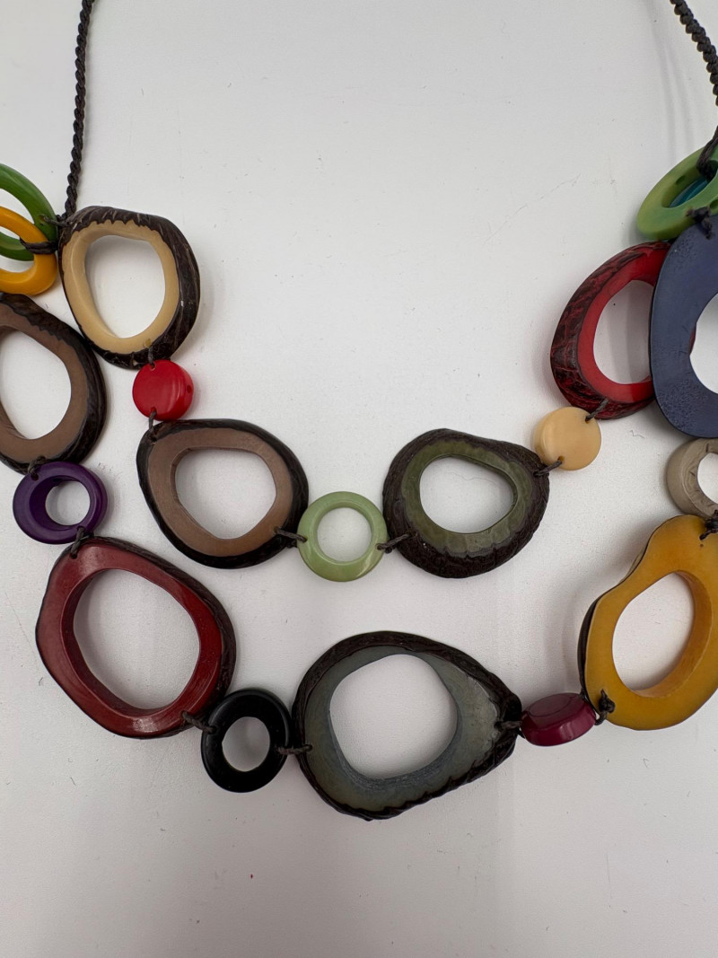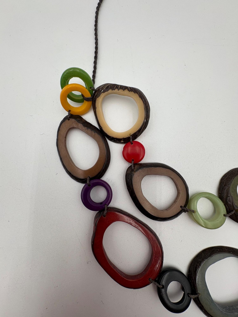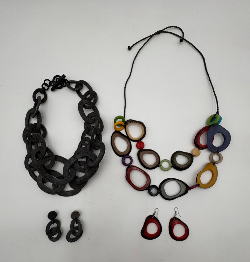 Chunky necklaces that pair wonderfully with artsy lagenlook clothing. Grey 1/8" thick plastic interlocking oval necklace with black toggle closure. Measures 21" L. Matching pierced earrings. Muti-colored plastic open shapes on black cord with secured wrapped back neck closure. 15.5" drop from center back of neck. Matching pierced earrings.
