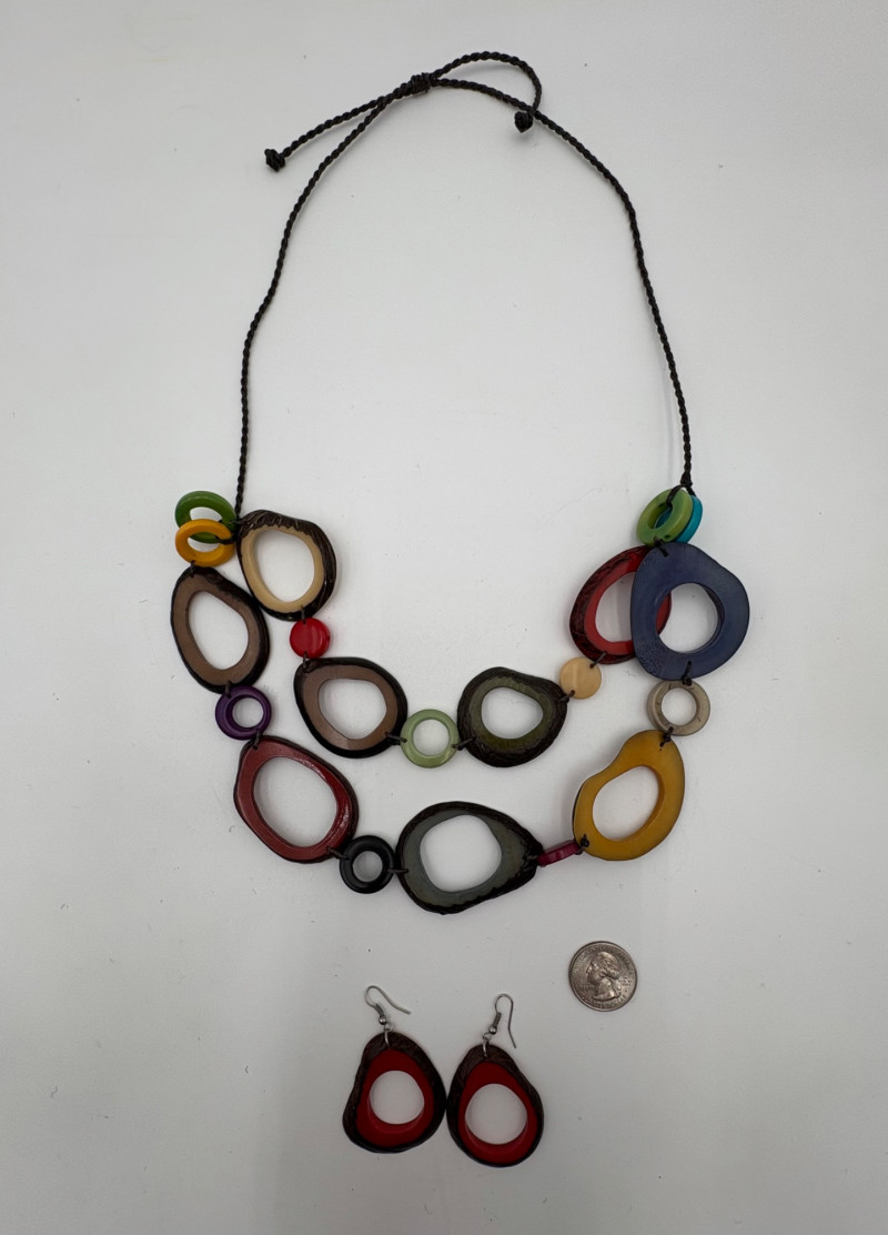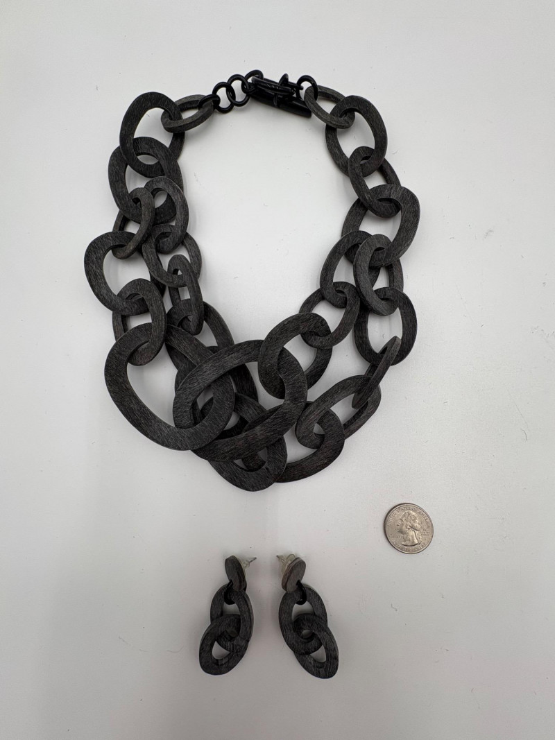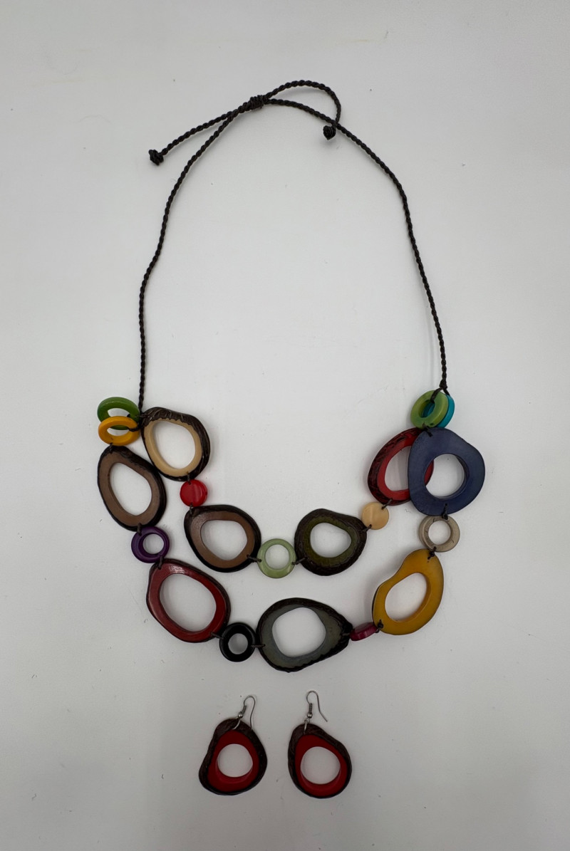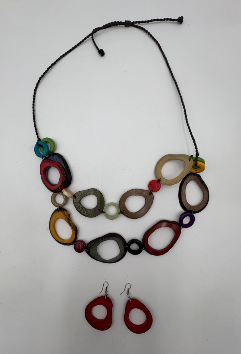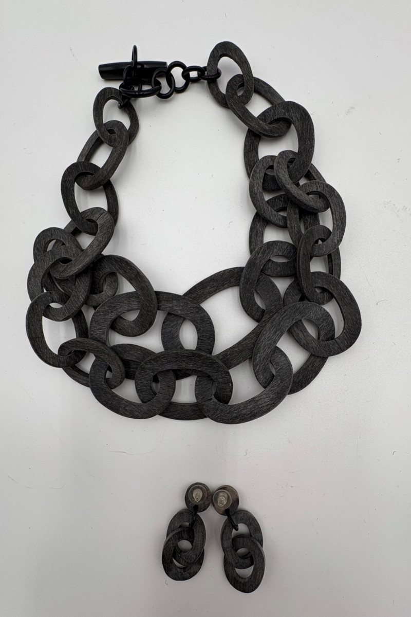 Chunky necklaces that pair wonderfully with artsy lagenlook clothing. Grey 1/8" thick plastic interlocking oval necklace with black toggle closure. Measures 21" L. Matching pierced earrings. Muti-colored plastic open shapes on black cord with secured wrapped back neck closure. 15.5" drop from center back of neck. Matching pierced earrings.