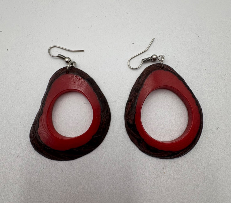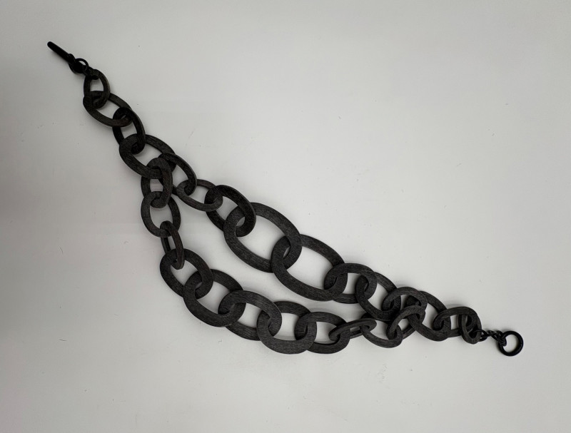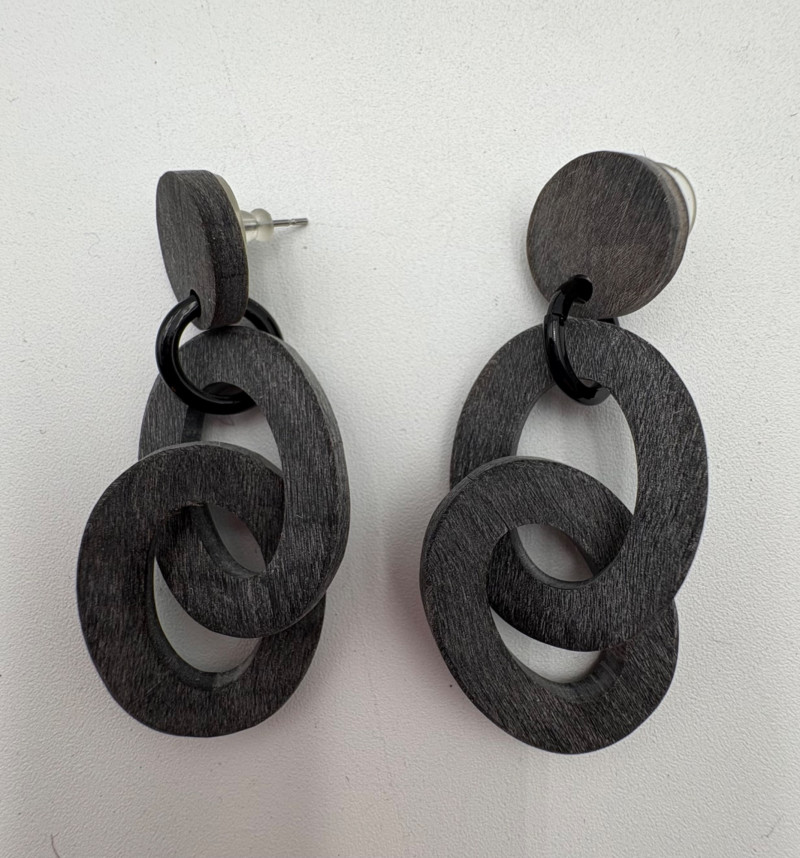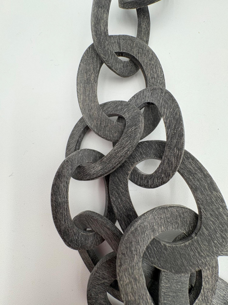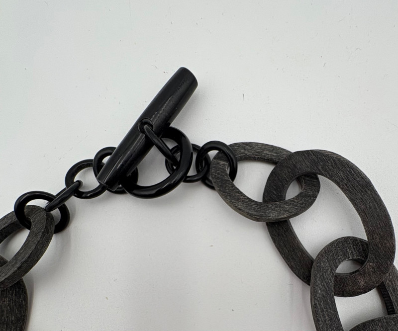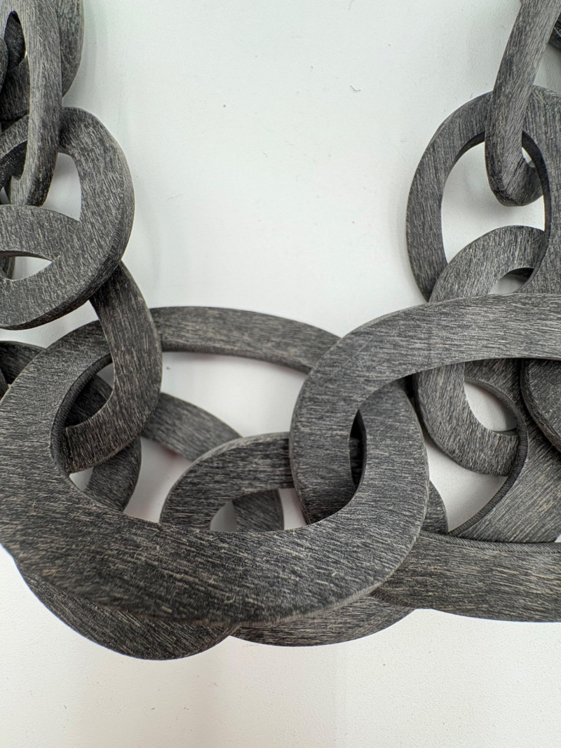 Chunky necklaces that pair wonderfully with artsy lagenlook clothing. Grey 1/8" thick plastic interlocking oval necklace with black toggle closure. Measures 21" L. Matching pierced earrings. Muti-colored plastic open shapes on black cord with secured wrapped back neck closure. 15.5" drop from center back of neck. Matching pierced earrings.