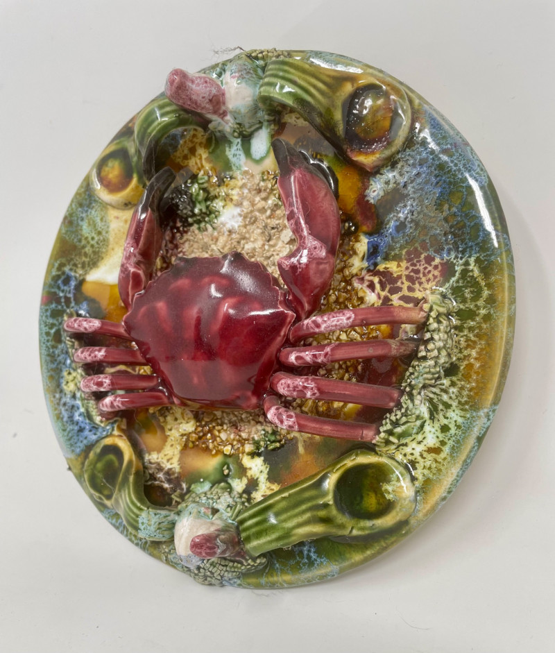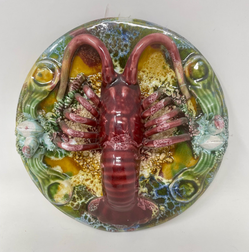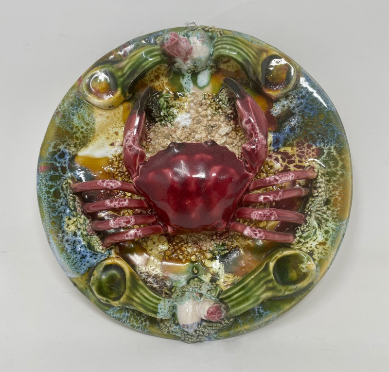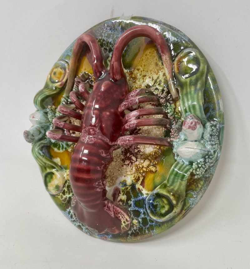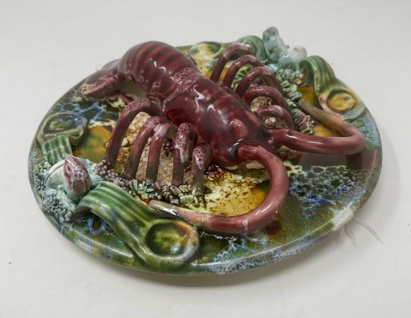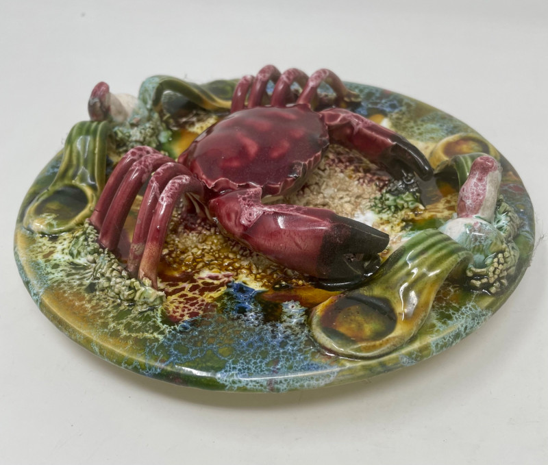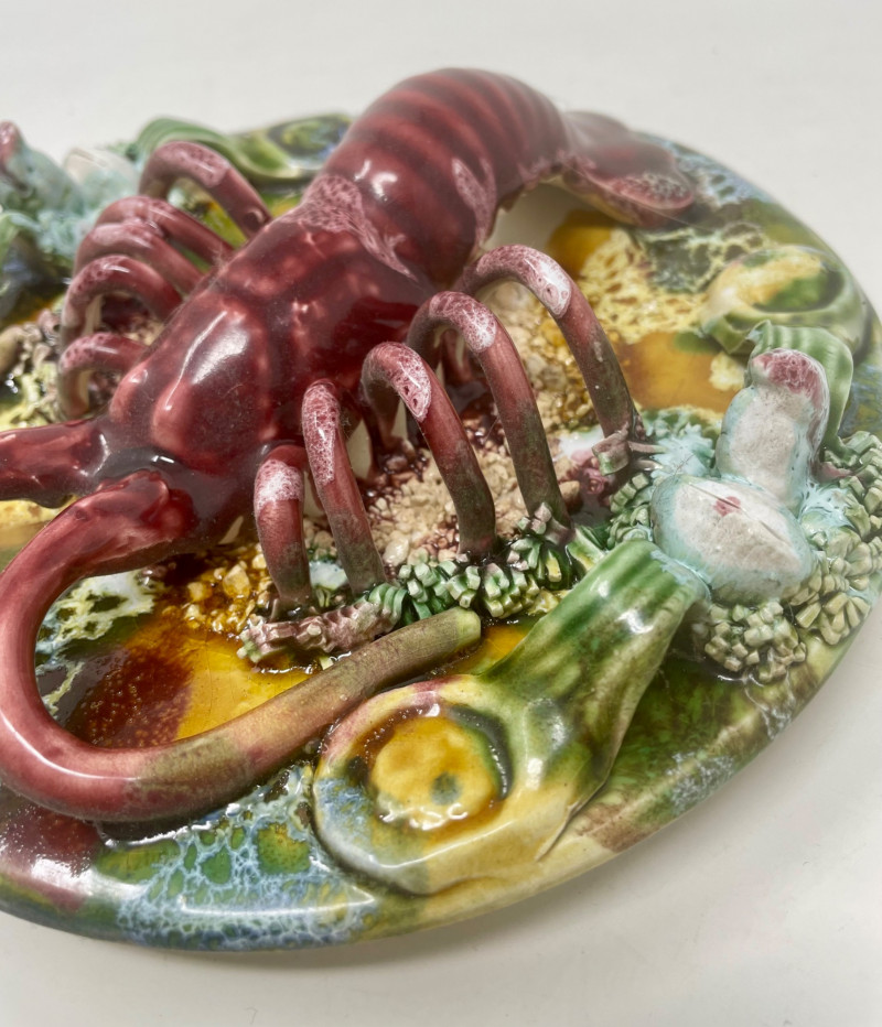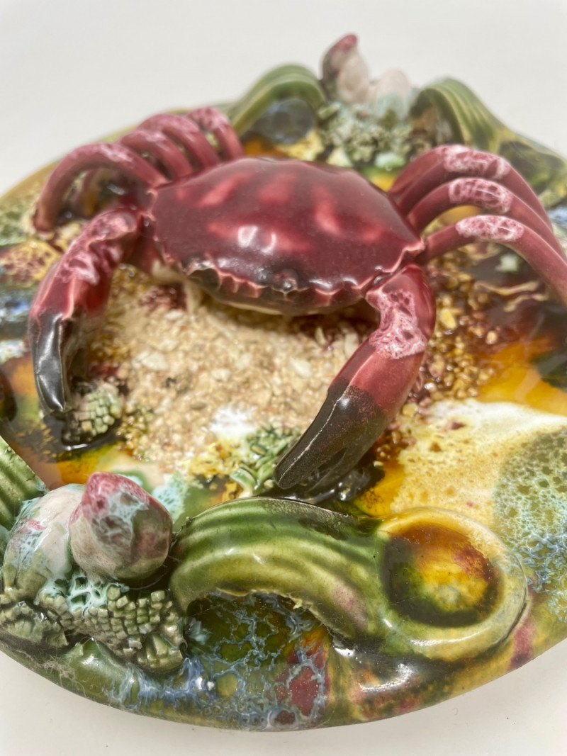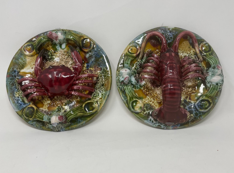 Set of two vintage Palissy majolica plates from Caldas, Portugal. Ceramic crab and lobster plates are in the Palissy "Barbotine" style. Purchased by our client in Portugal in the 1990s at a flea market from a vendor who specialized in antique and vintage Palissy Ware. They measure 7.5" in diameter. Palissy Barbotine refers to a style of majolica pottery inspired by the work of Bernard Palissy, a 16th-century French potter and naturalist. It's characterized by detailed 3-D colorful decoration, often featuring natural elements like fish, reptiles, shells, and plants, typically with a majolica (tin-glazed) finish. The term "Barbotine" specifically relates to the technique of applying a slip (a mixture of clay and water) to create these raised, textured surfaces.