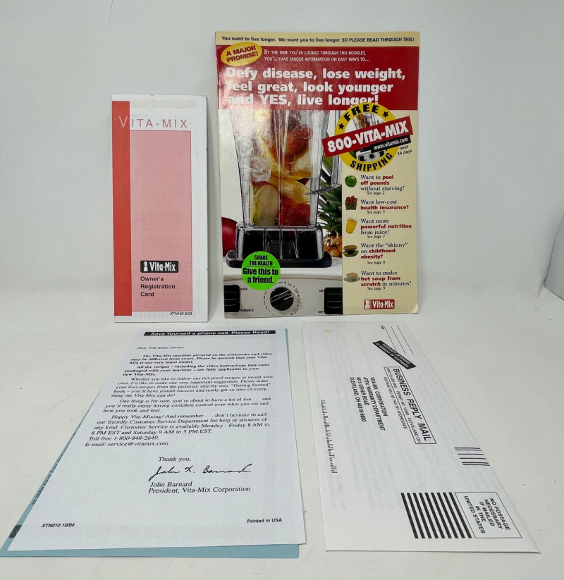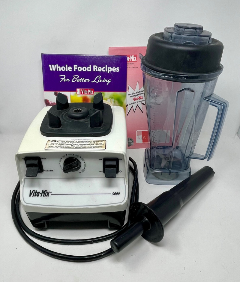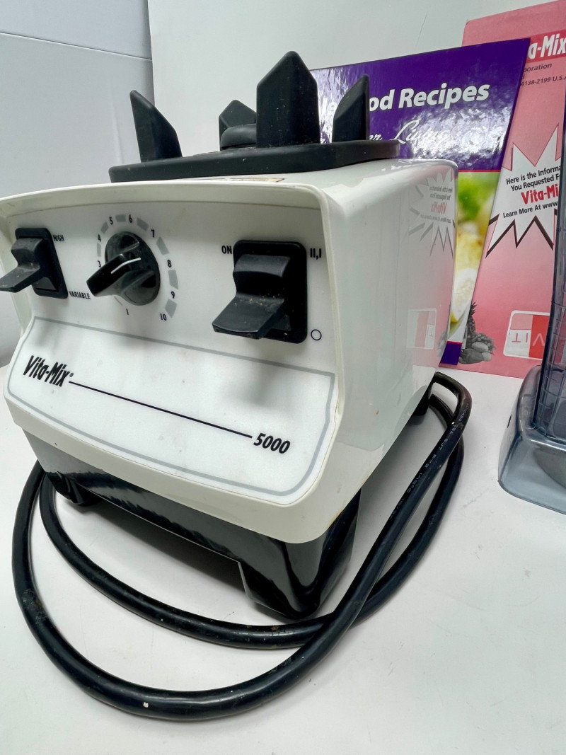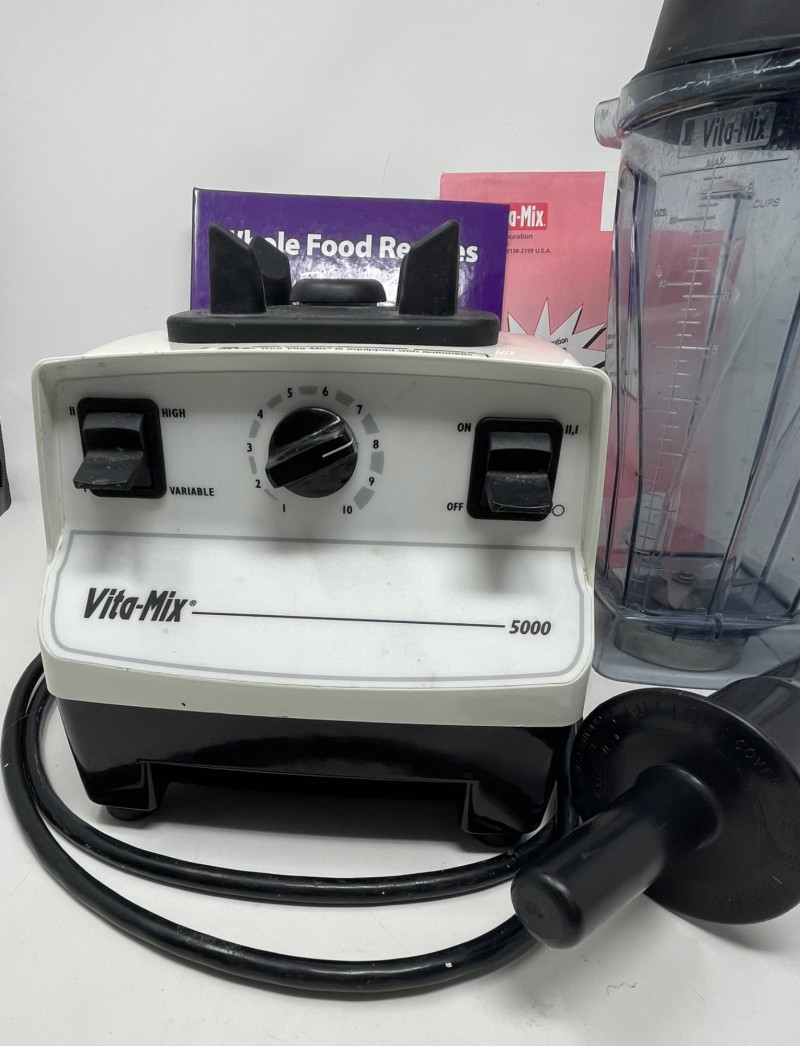 In 1992, the Vita-Mix 5000, also known as the Total Nutrition Center, was introduced. It was the company's first blender to use a boxier plastic base, a clear polycarbonate container, and an 11-speed motor. They continued to produce the 5000 model until just recently. This 5000 has exactly the same motor as the newer models and is just as powerful. Comes with original paperwork and a large recipe notebook for everything from sauces, hot soups, and salads. A "must have" for any cook.