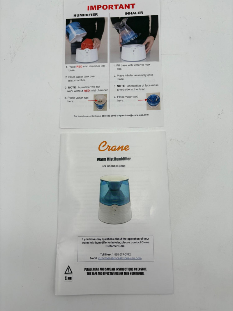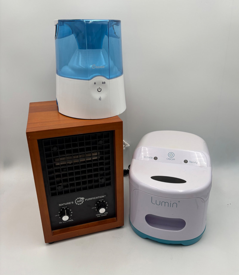 Everything you need to breathe and stay sanitary as you do so! Nature’s Air Purification ionizer. Adjustable control and fan with three-prong grounded plug. In great condition with a few small cosmetic scratches in wood case. Measures 12.5" H x 8.25" W x 9" D. Lumin UV light sanitizer with manual. Client says they originally bought it to sanitize CPAP masks, but it works great on toothbrushes and anything else you want to thoroughly clean since the drawer is quite large. Measures 8" H x 9" W x 12" D. Comes with manual. Crane warm mist humidifier with an auto-off feature - used minimally. Measures 9" H x 6.5" W x 8" D. Comes with manual.