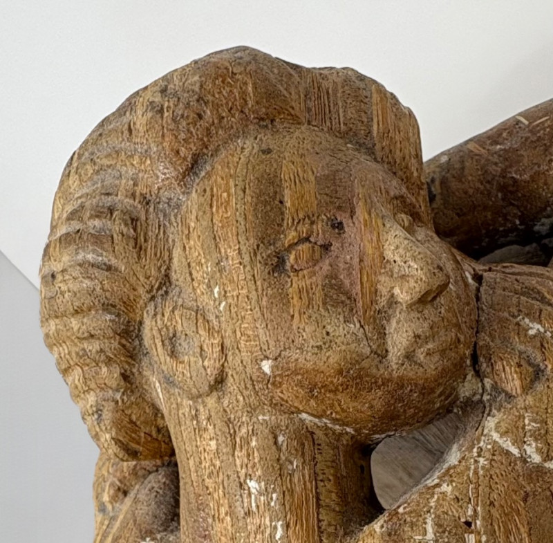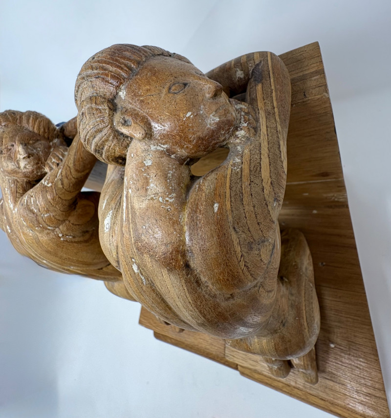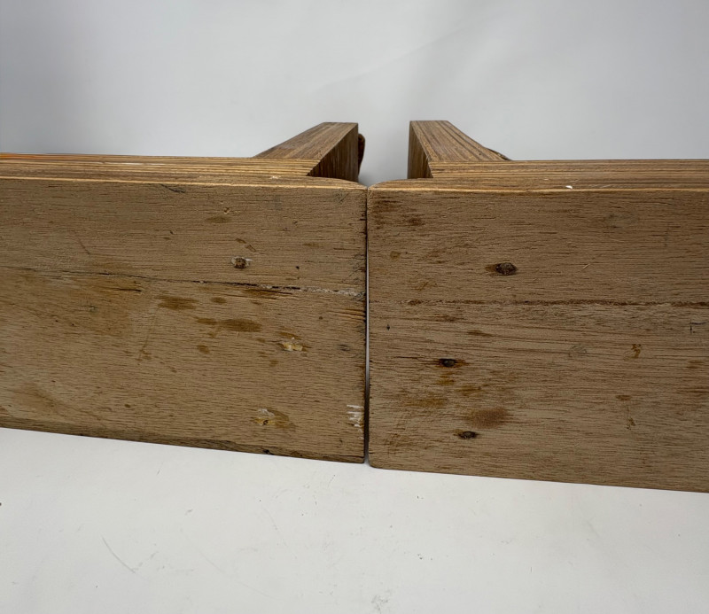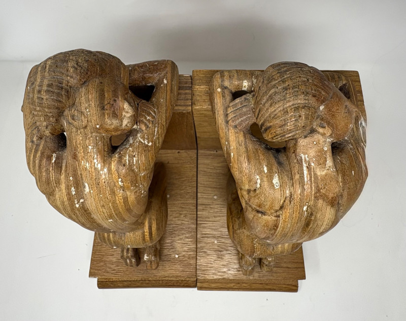 Two solid wood, large-size bookends. Great folk art! We think a former owner took them on as a painting project having sanded them smooth and filled in any holes with spackle. They didn’t finish the project so you can leave them in a distressed state (like our client did) or paint them yourselves. We sort of like the look of the wood as is, personally. Although they look identical, the nude figures are actually hand-carved with slight differences in terms of proportions and faces. They measure approximately 13.5" H x 10.25" W x just under 6" D.