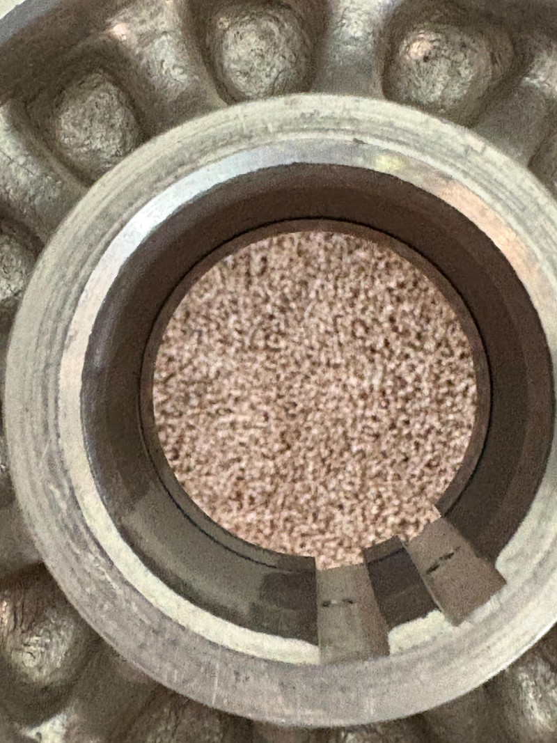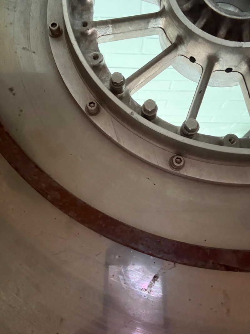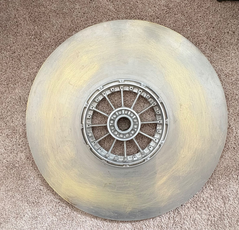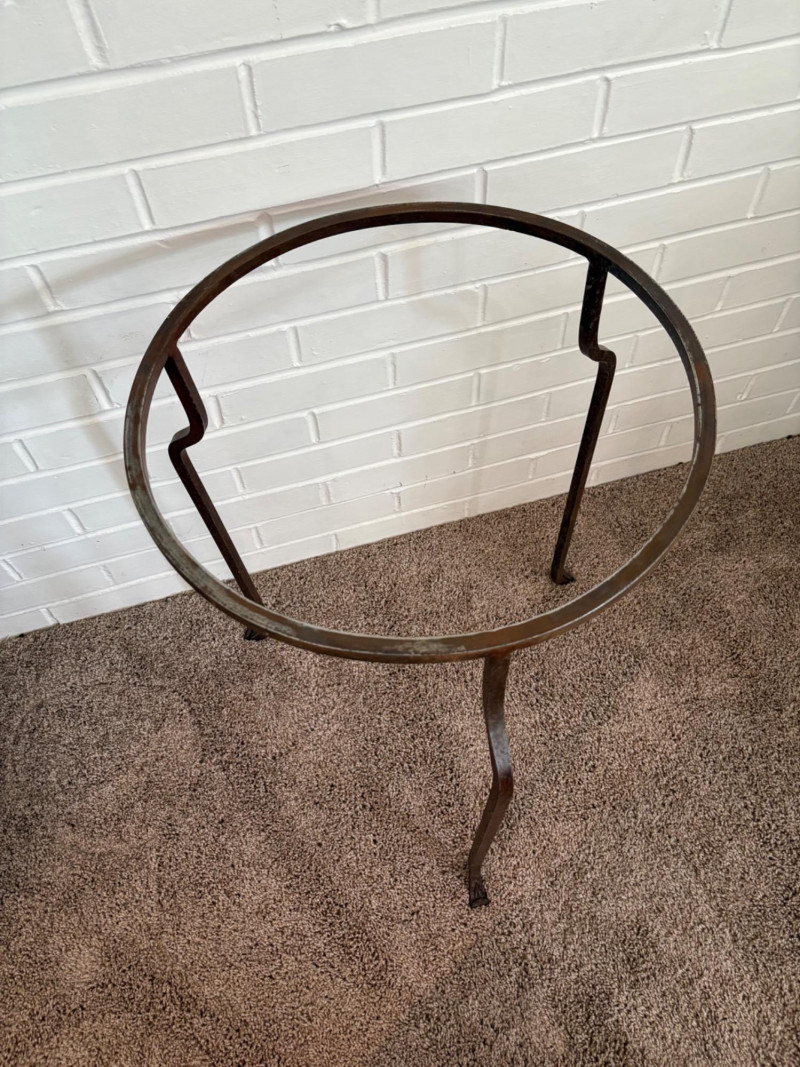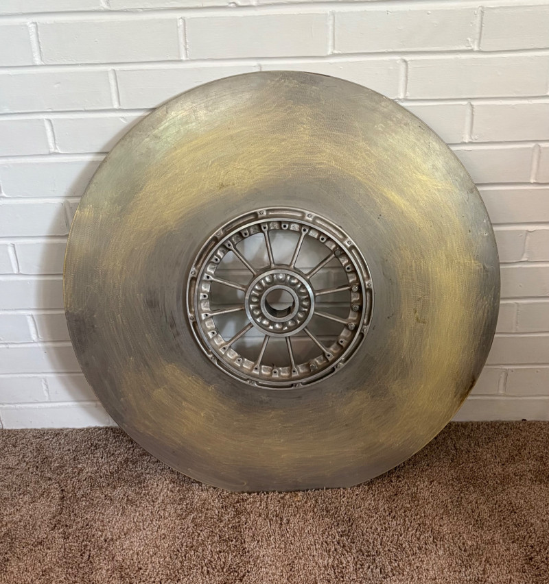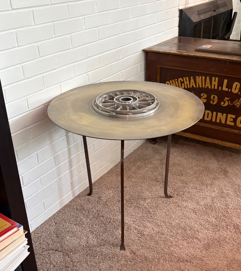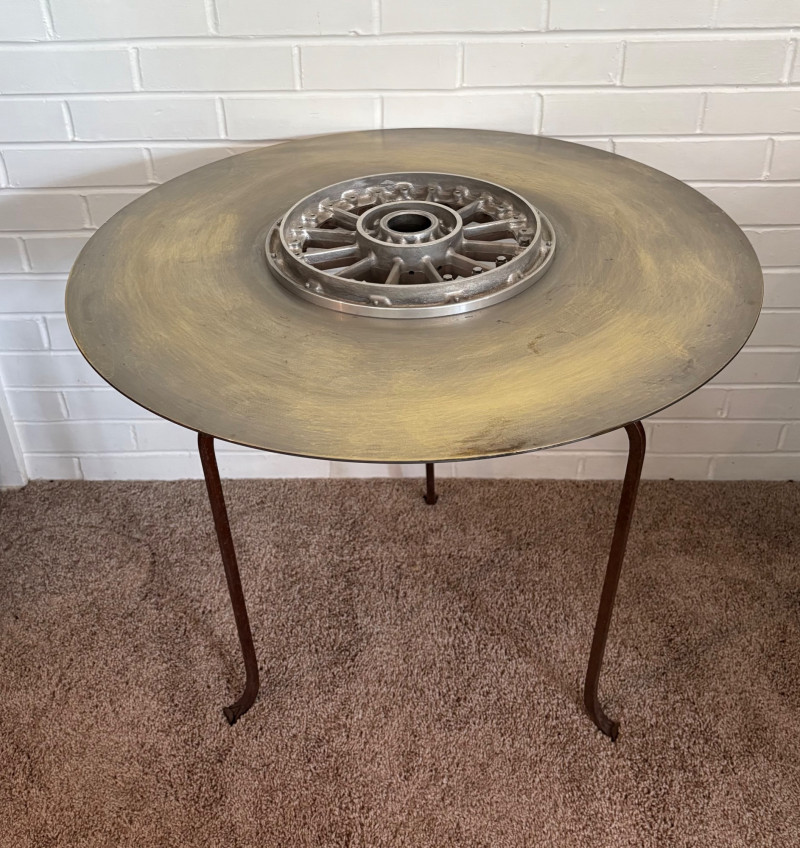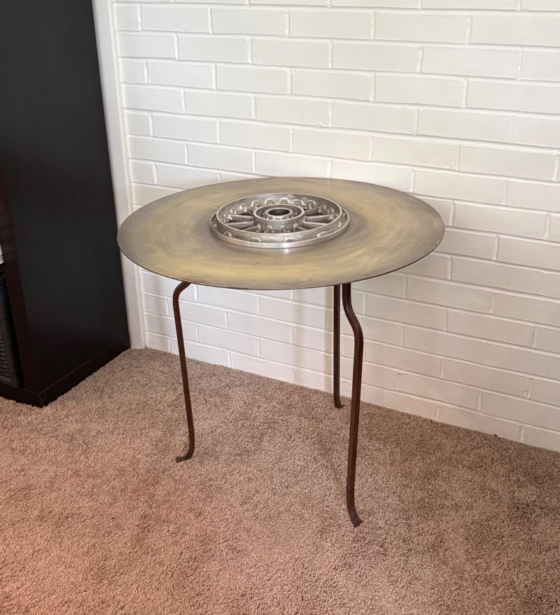 Table made from an early computer disk drive. This massive 1975 IBM disk platter once held a whopping 128 megabytes! Welded steel legs and circular support. Table measures just under 24" H and the disc drive on top measures approximately 27" in diameter. The top of the disk is the same as the bottom and about 1/8" thick.
