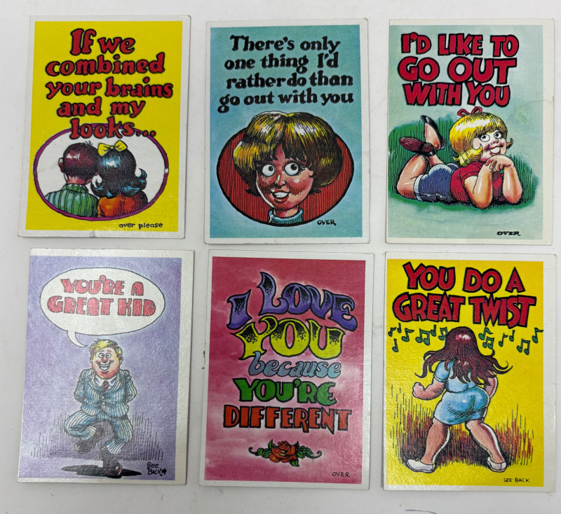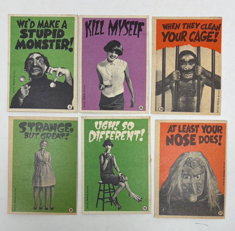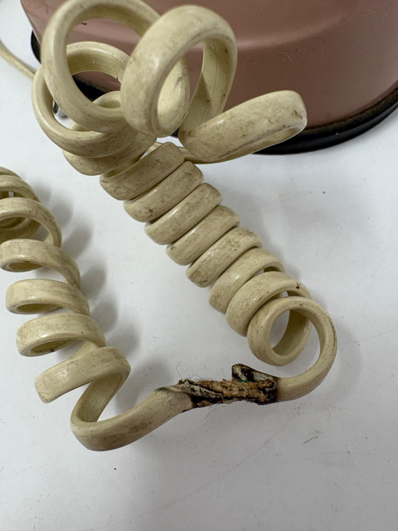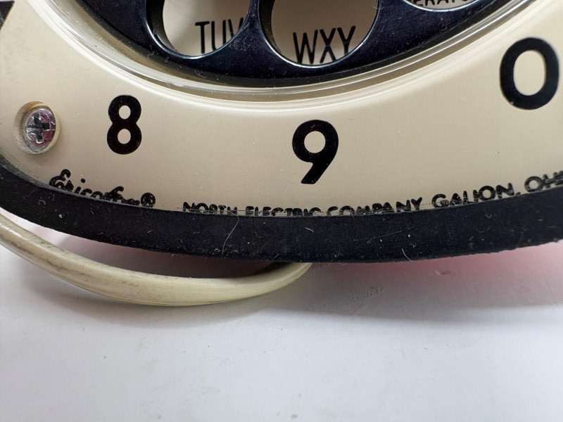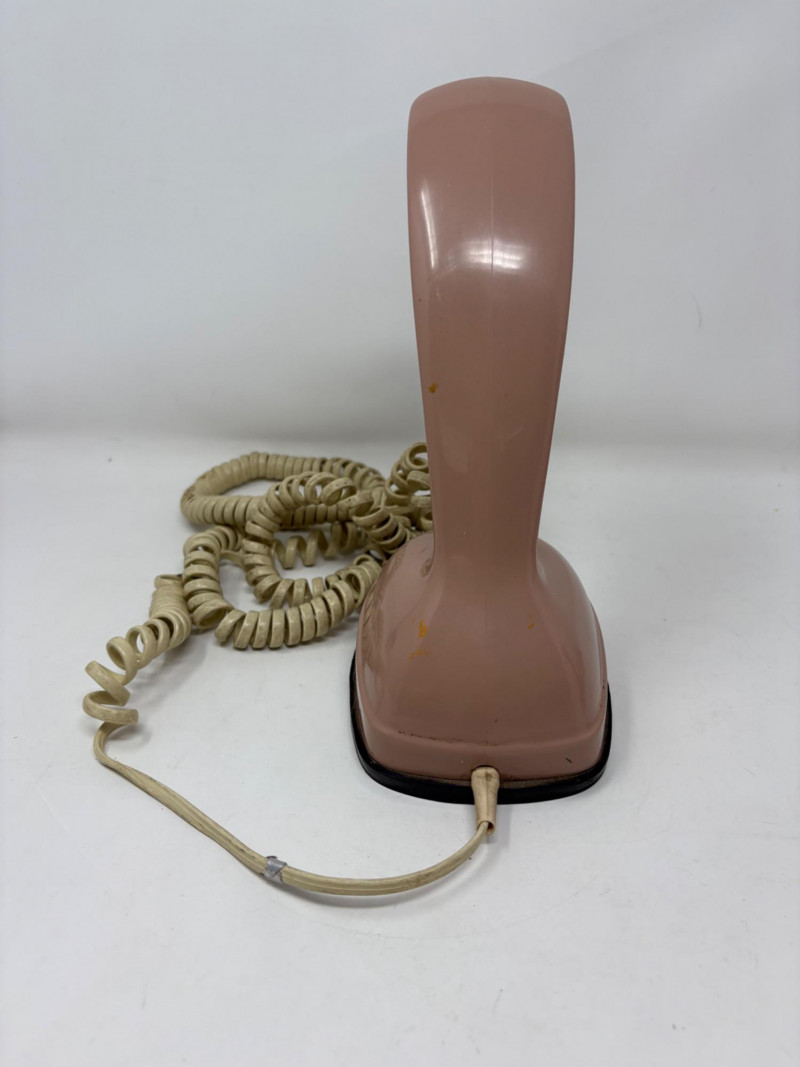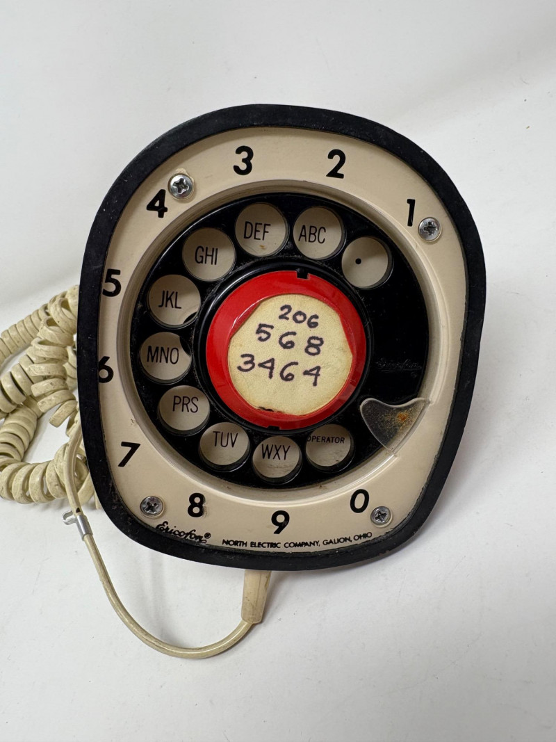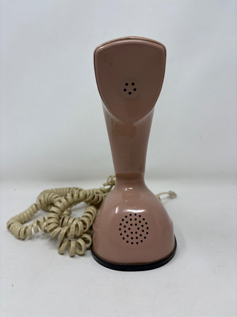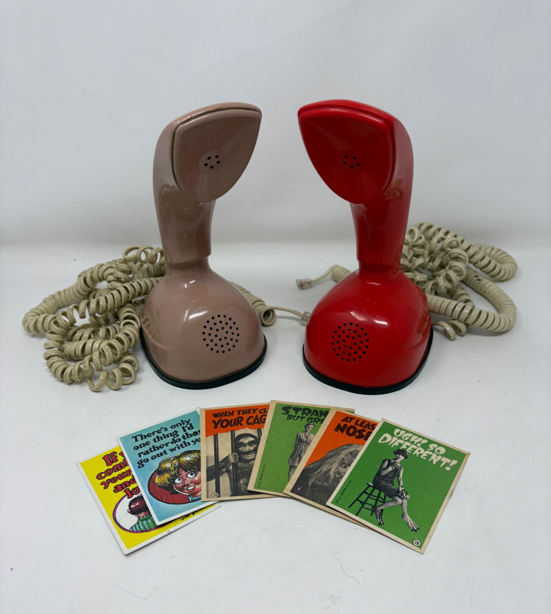 Two Swedish-designed/American-produced Ericofons with intact cords. Originally designed in the 1950s, these were the first phones to have an integrated headset and dial. We believe these are from the late 1960s. We were unable to test them since we don’t have a landline right now, but client says they were working when she last used them in her home. The chords could use some cleanup and the beige one's cord has one iffy area - see last photo. Both phones have a few flaws here and there and could use a very thorough cleaning, but display really well. Phones measure approx. 8" H x 4" W x 5" D. For more Ericofon info/comps, check out https://www.ericofon.com/catalog/ericofons.htm Also included are some very strange yet fun cards produced during the same time period from Topps Chewing Gum Co.