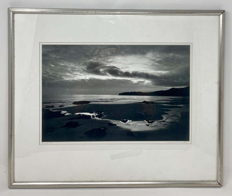 "August 1984" ("Makah Bay") from Pacific Northwest photographer Mary Randlett. Though best known for her portraiture of Northwest artistic figures such as Mark Tobey and Tom Robbins, her oeuvre also included dramatic landscapes. This photo falls into the latter category & shows the sun setting over the ocean at the far Northwest tip of Washington State where the Makah tribe lives. Regarding the photo she stated, "I saw a wonderful molten river-like form on the sandy beach and the beautiful clouds and forms dancing in the light...everywhere I saw a photograph." Sound Estate Company does not appraise art or guarantee authenticity.