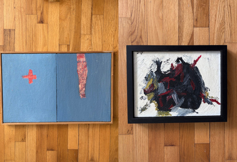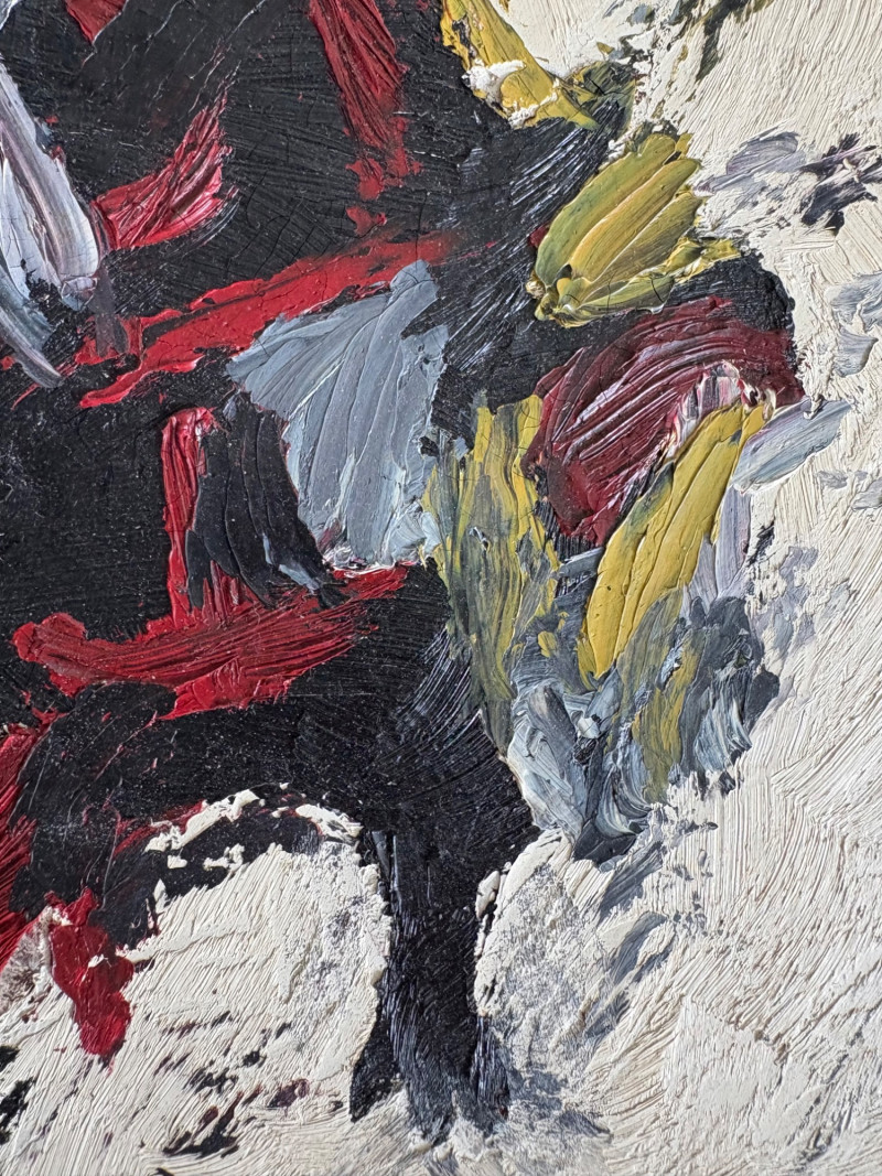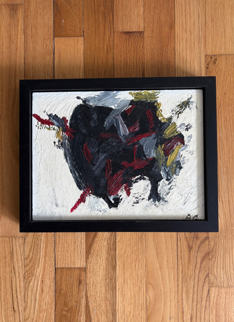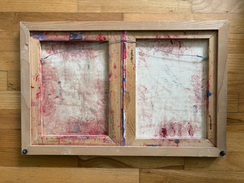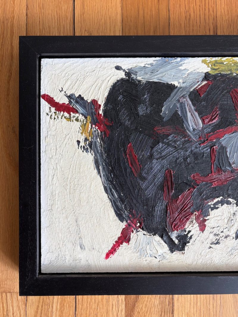 Two original paintings in oil with heavy brushstrokes. Note that the lead picture is deceptive - the Deitz is approx. twice the size of the Garon. "Untitled" oil on Masonite by AJ Garon - undated but from the late 1960s to early 1970s. Measures 10.75” H x 13.5” W framed in a great black wood frame. "Untitled" oil on canvas by James Deitz from 1991. Measures 15" H x 22.75” W in natural wood frame. Note there is some slight paint loss on the right side - see last photo. James Deitz is one of the Northwest’s