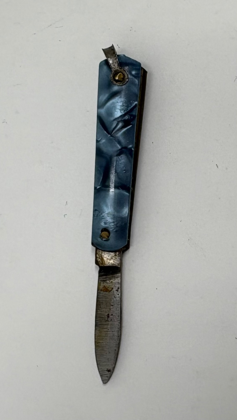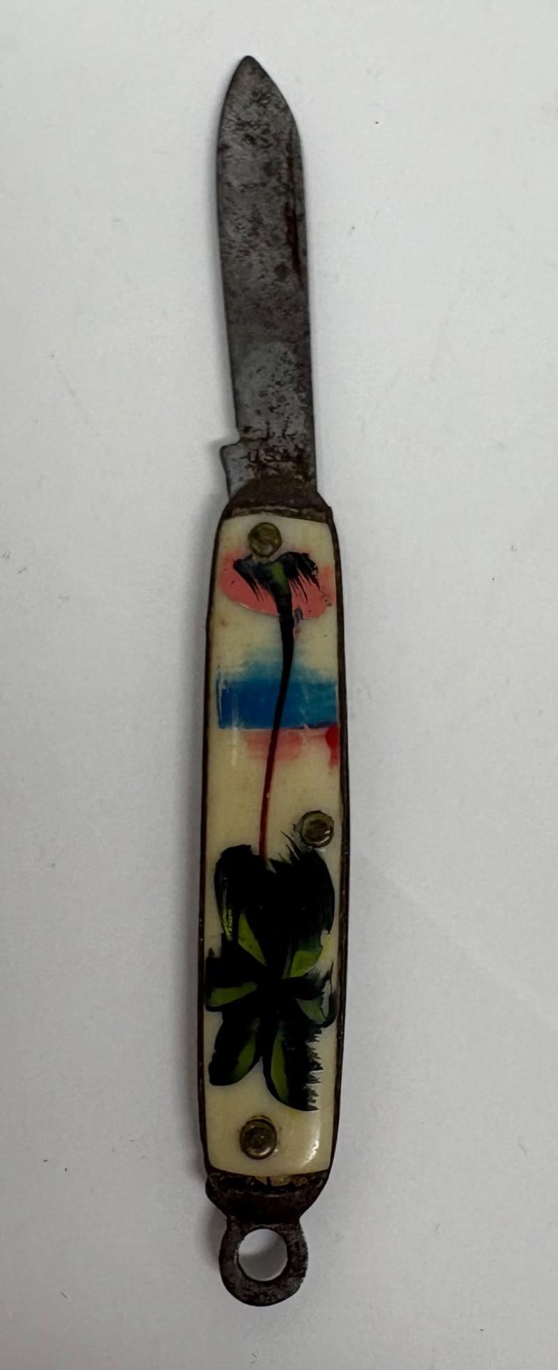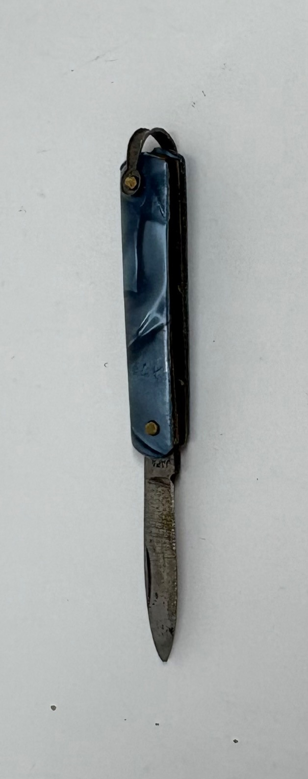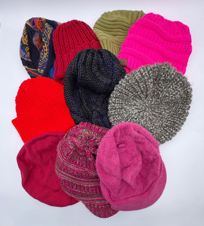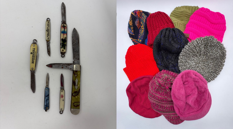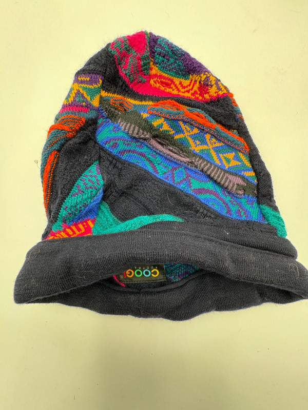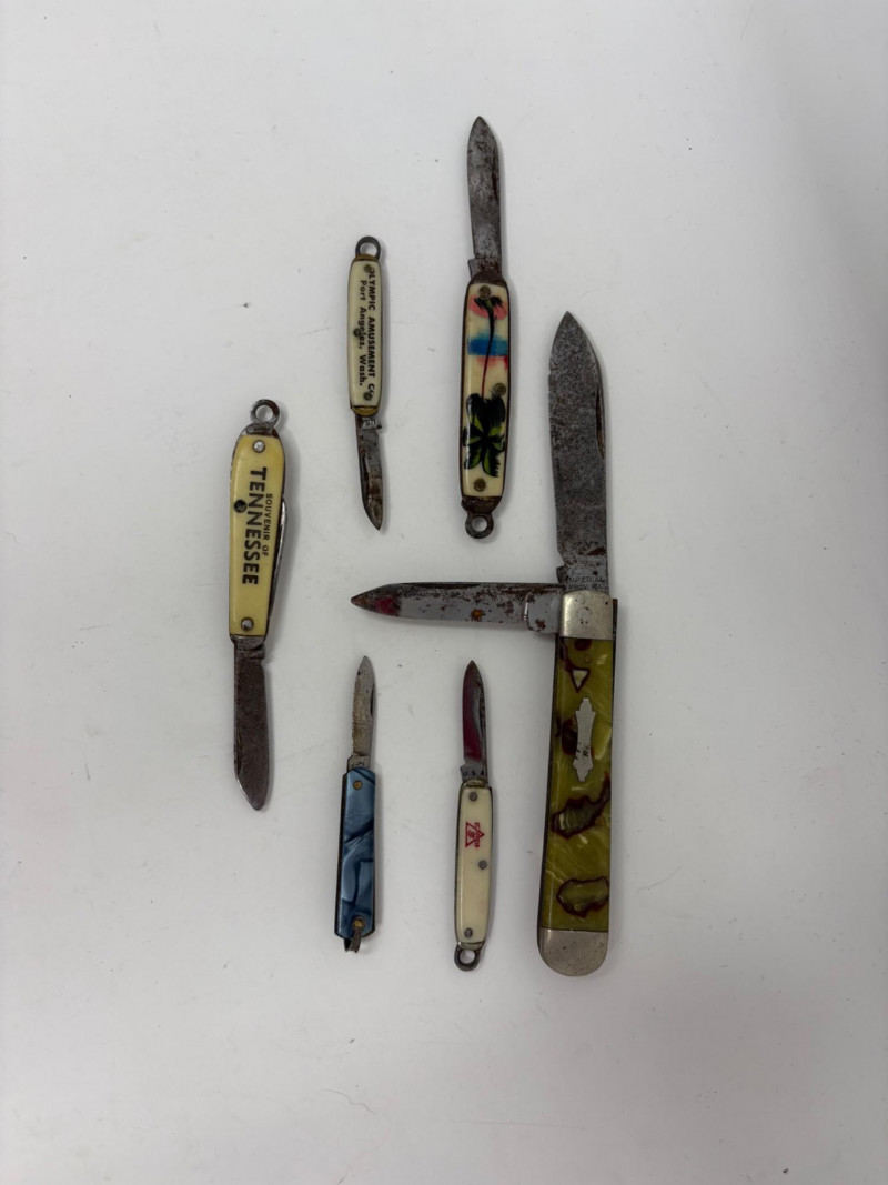Ok, so we know they don't really go together, but we gotta keep you guessing! Group of hats - homemade and commercial, includes a vintage Coogi knitted slouchy hat. 6 small vintage pocket knives from various sources in various materials from various time periods. Largest measures 3.25" closed while smallest measures just over 1.5".