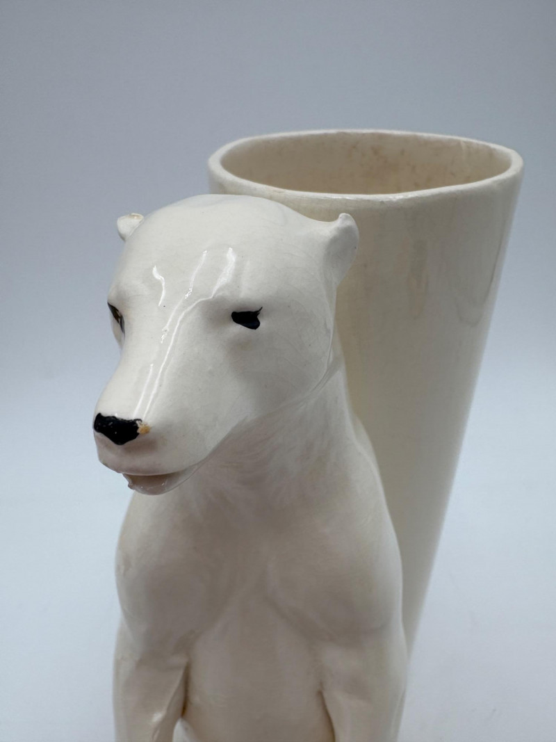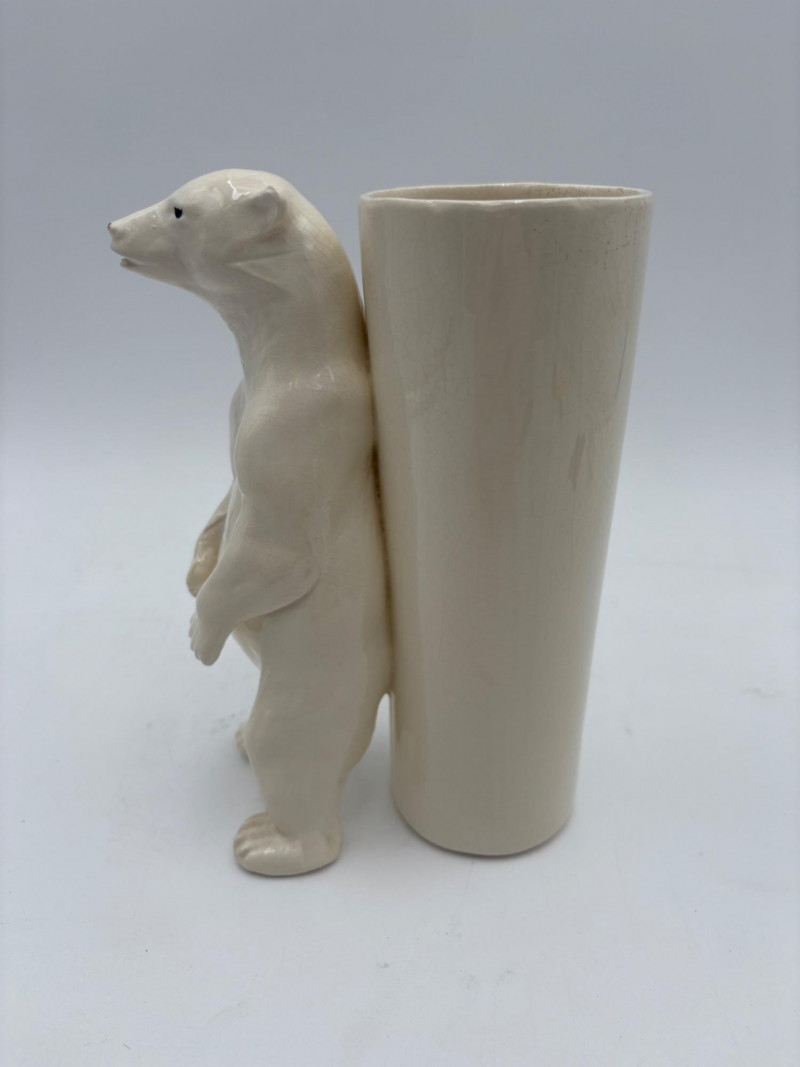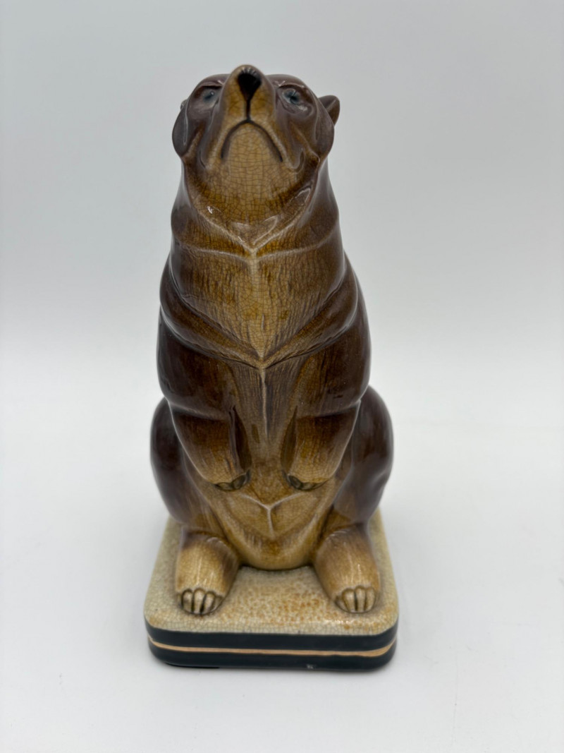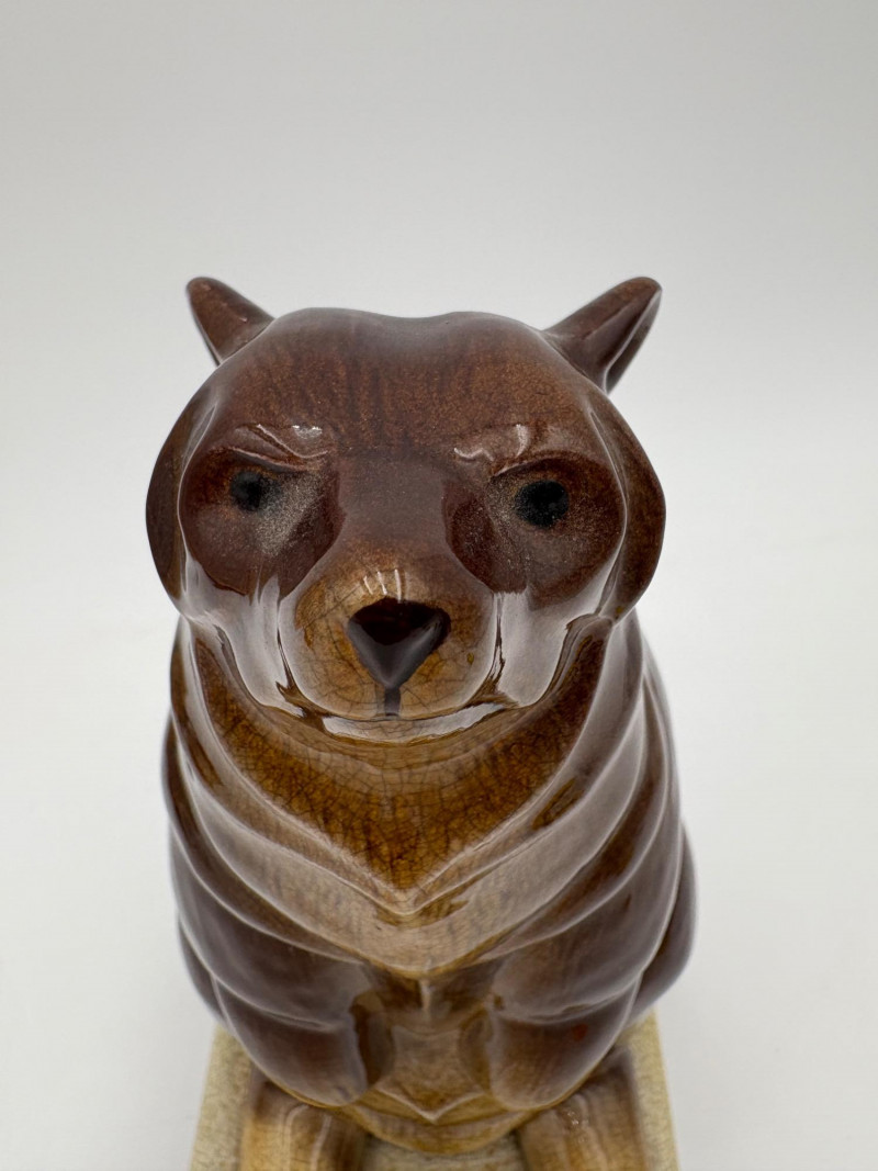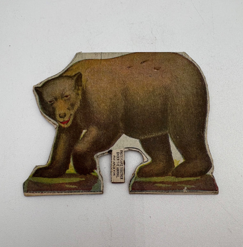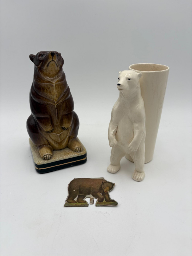 Three vintage bear figures - all in excellent condition. Brown ceramic bear made in Japan for San Francisco's Takahashi Trading Company*. He can be filled with sand to give him more heft as a weighted bookend, but he's gorgeous simply as a piece of art. He stands 9" H x 4" W x 4" D. The rearing polar bear from Seattle's John Todd Company is a ceramic vase with beautiful proportions - like the previous bear, he's alluring simply as a piece of art in addition to being functional. He stands 7" H x 3" W x 5" D. Vintage heavy paper cut-out of a brown bear that can be stood up on a shelf to be 3-D (never used). Measures approx. 4" L. *Henri & Tomoye Takahashi were forced into the Topaz Internment Camp during WW2. After the war they opened the Takahashi Trading Company in San Francisco specializing in post-war goods made in occupied Japan and had retail stores in San Francisco and New York. The business operated until 2019 after the death of both founders.