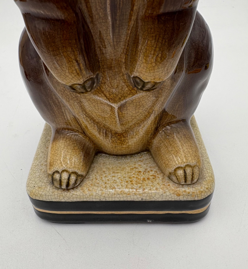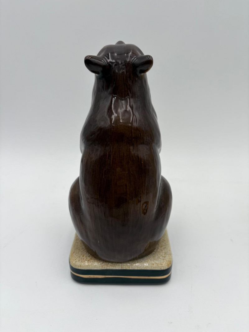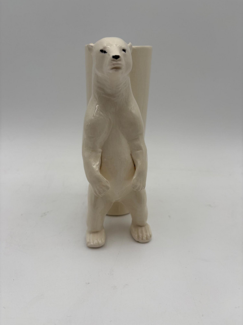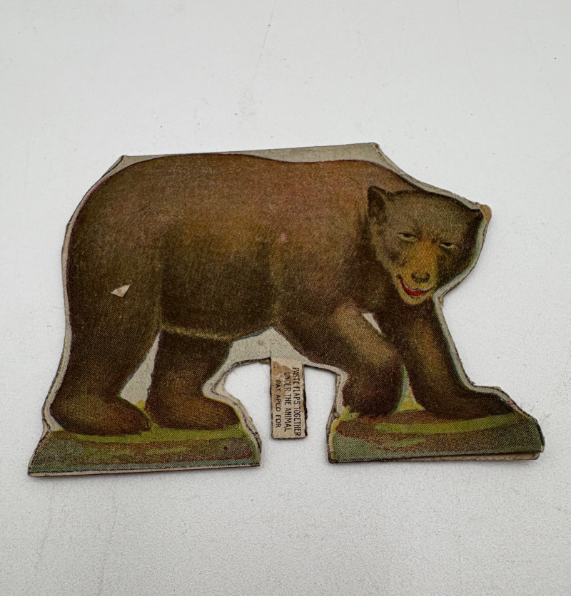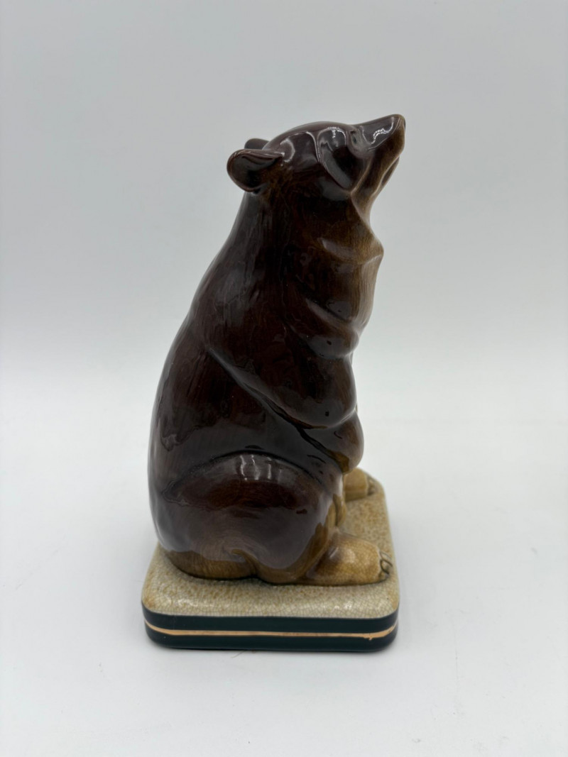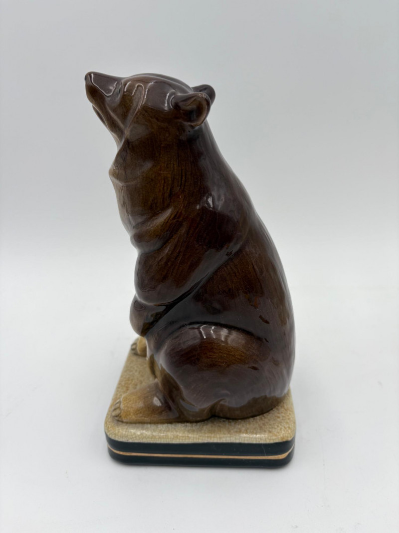 Three vintage bear figures - all in excellent condition. Brown ceramic bear made in Japan for San Francisco's Takahashi Trading Company*. He can be filled with sand to give him more heft as a weighted bookend, but he's gorgeous simply as a piece of art. He stands 9" H x 4" W x 4" D. The rearing polar bear from Seattle's John Todd Company is a ceramic vase with beautiful proportions - like the previous bear, he's alluring simply as a piece of art in addition to being functional. He stands 7" H x 3" W x 5" D. Vintage heavy paper cut-out of a brown bear that can be stood up on a shelf to be 3-D (never used). Measures approx. 4" L. *Henri & Tomoye Takahashi were forced into the Topaz Internment Camp during WW2. After the war they opened the Takahashi Trading Company in San Francisco specializing in post-war goods made in occupied Japan and had retail stores in San Francisco and New York. The business operated until 2019 after the death of both founders.
