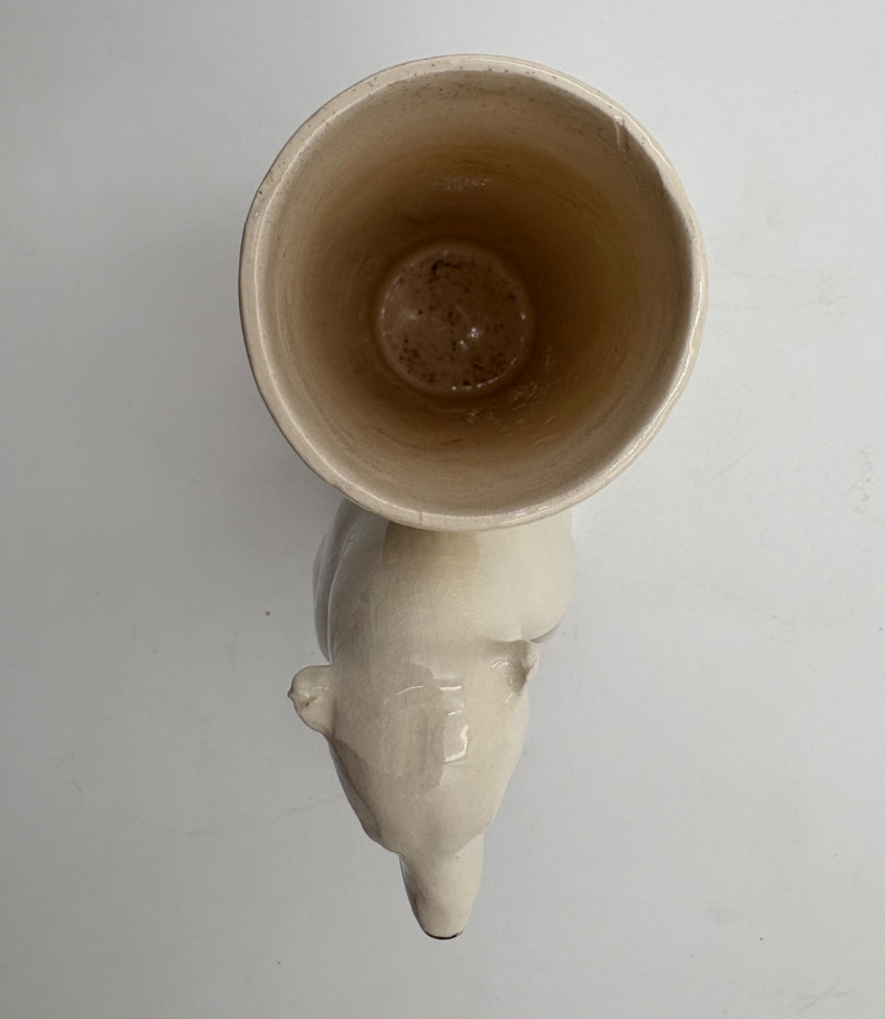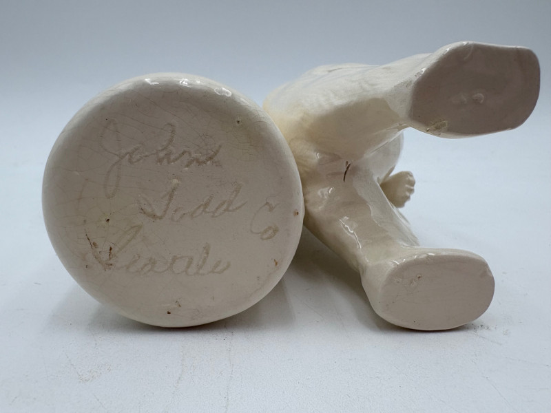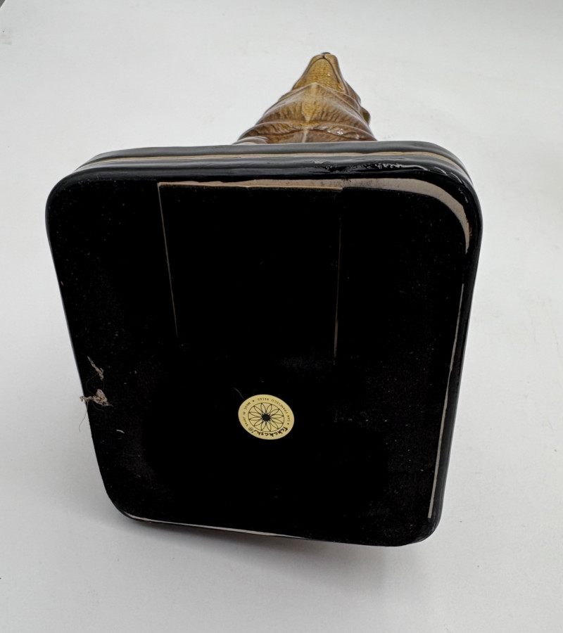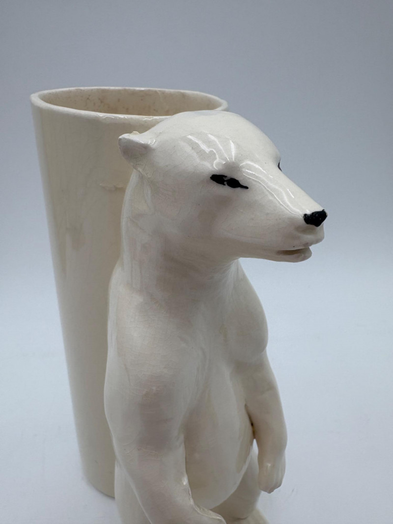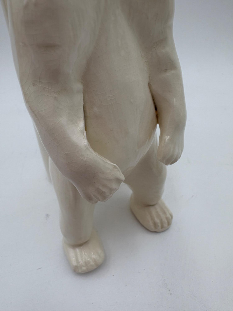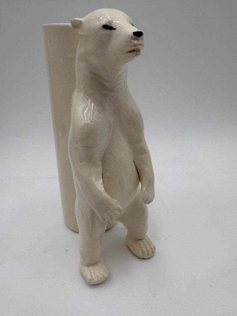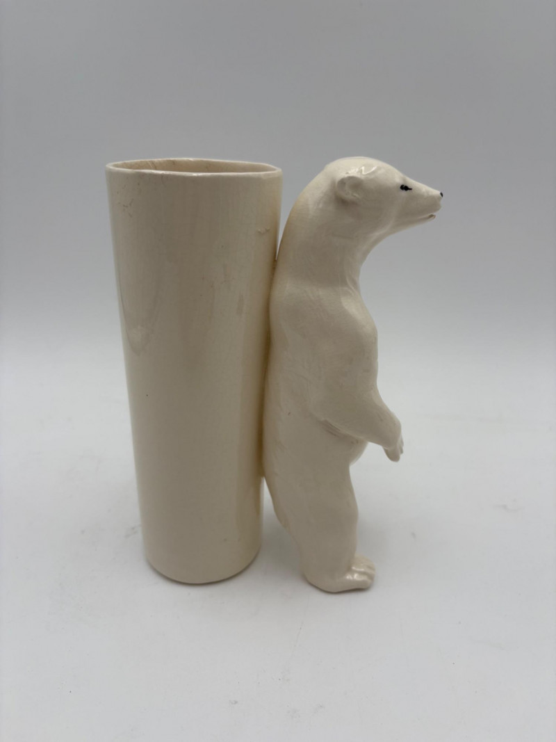 Three vintage bear figures - all in excellent condition. Brown ceramic bear made in Japan for San Francisco's Takahashi Trading Company*. He can be filled with sand to give him more heft as a weighted bookend, but he's gorgeous simply as a piece of art. He stands 9" H x 4" W x 4" D. The rearing polar bear from Seattle's John Todd Company is a ceramic vase with beautiful proportions - like the previous bear, he's alluring simply as a piece of art in addition to being functional. He stands 7" H x 3" W x 5" D. Vintage heavy paper cut-out of a brown bear that can be stood up on a shelf to be 3-D (never used). Measures approx. 4" L. *Henri & Tomoye Takahashi were forced into the Topaz Internment Camp during WW2. After the war they opened the Takahashi Trading Company in San Francisco specializing in post-war goods made in occupied Japan and had retail stores in San Francisco and New York. The business operated until 2019 after the death of both founders.