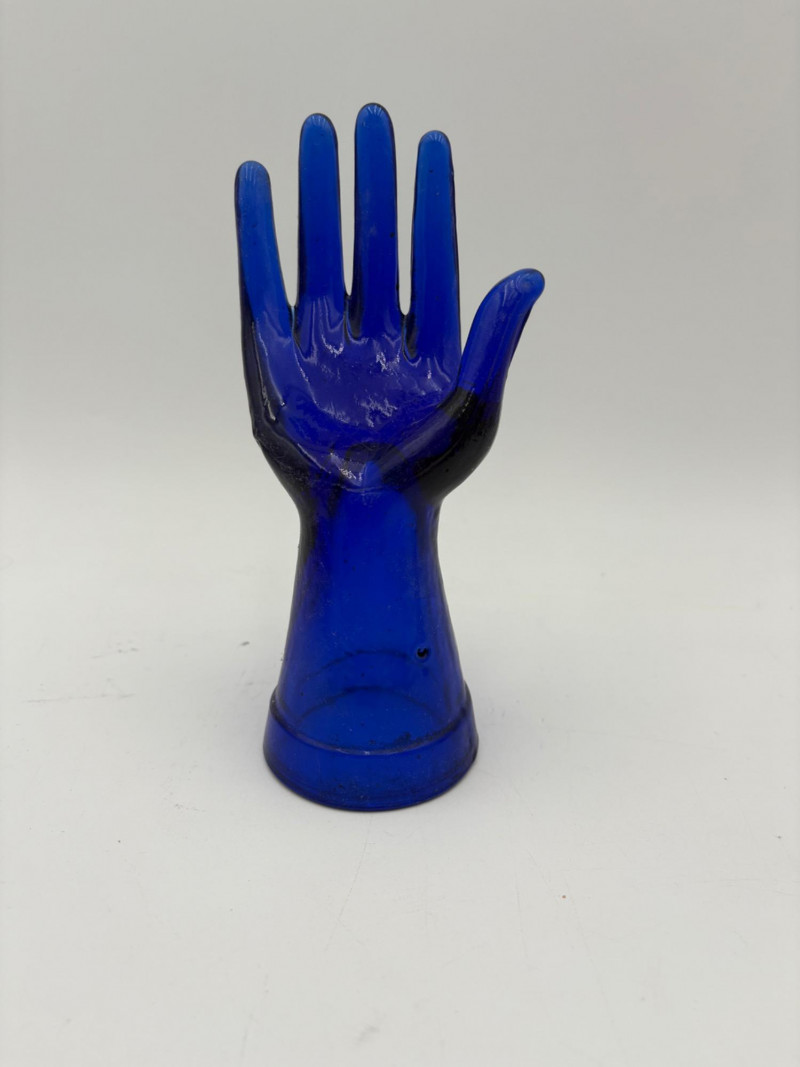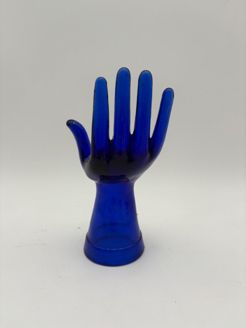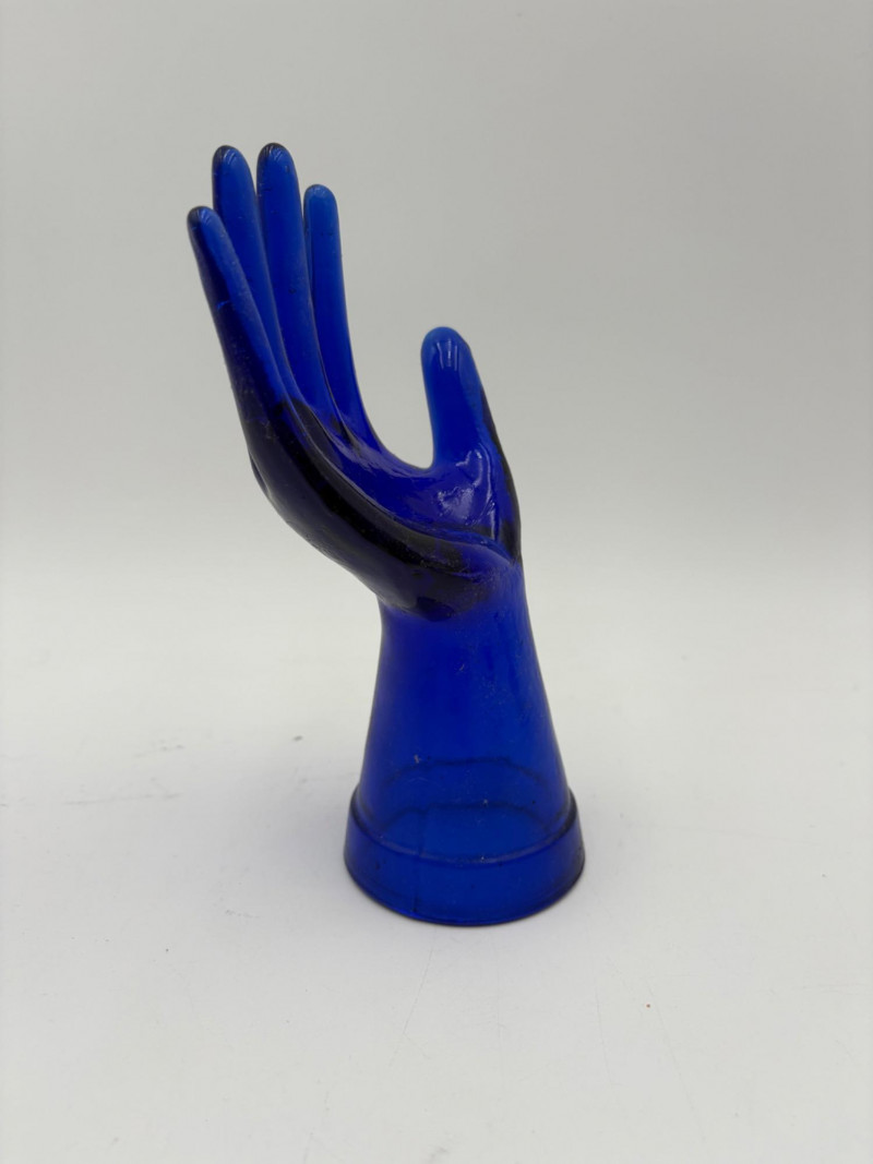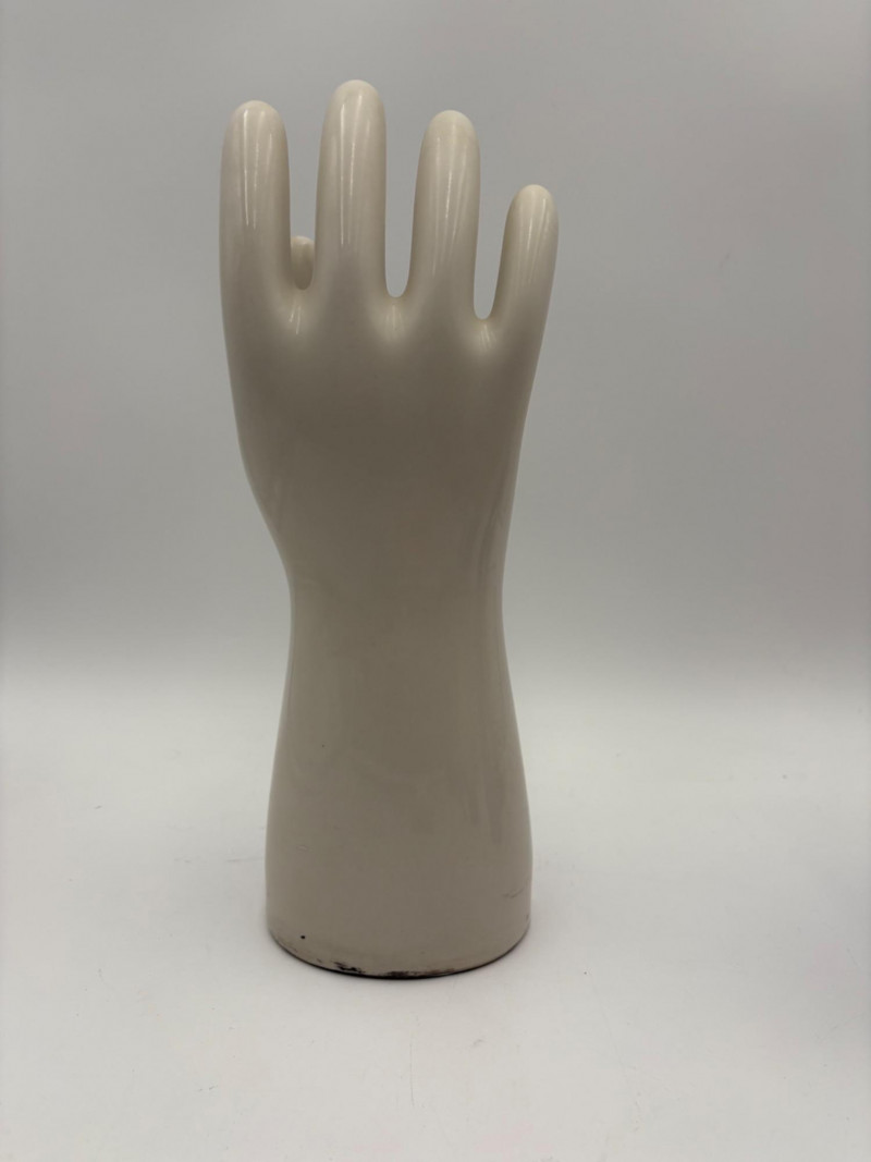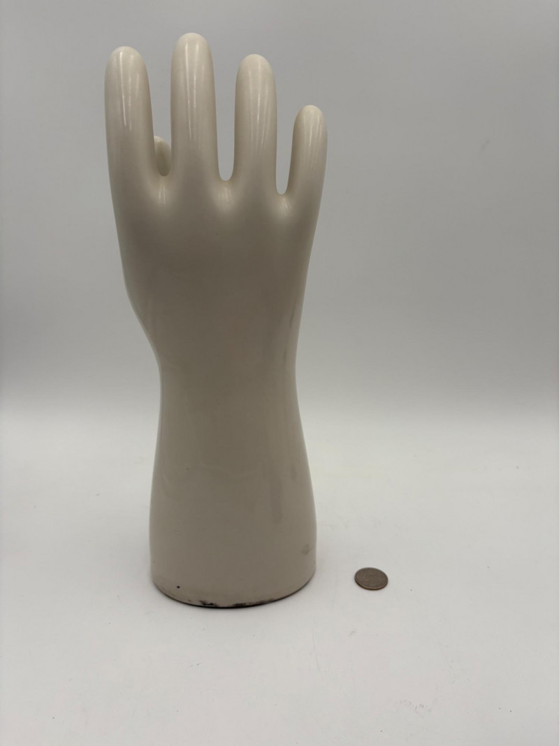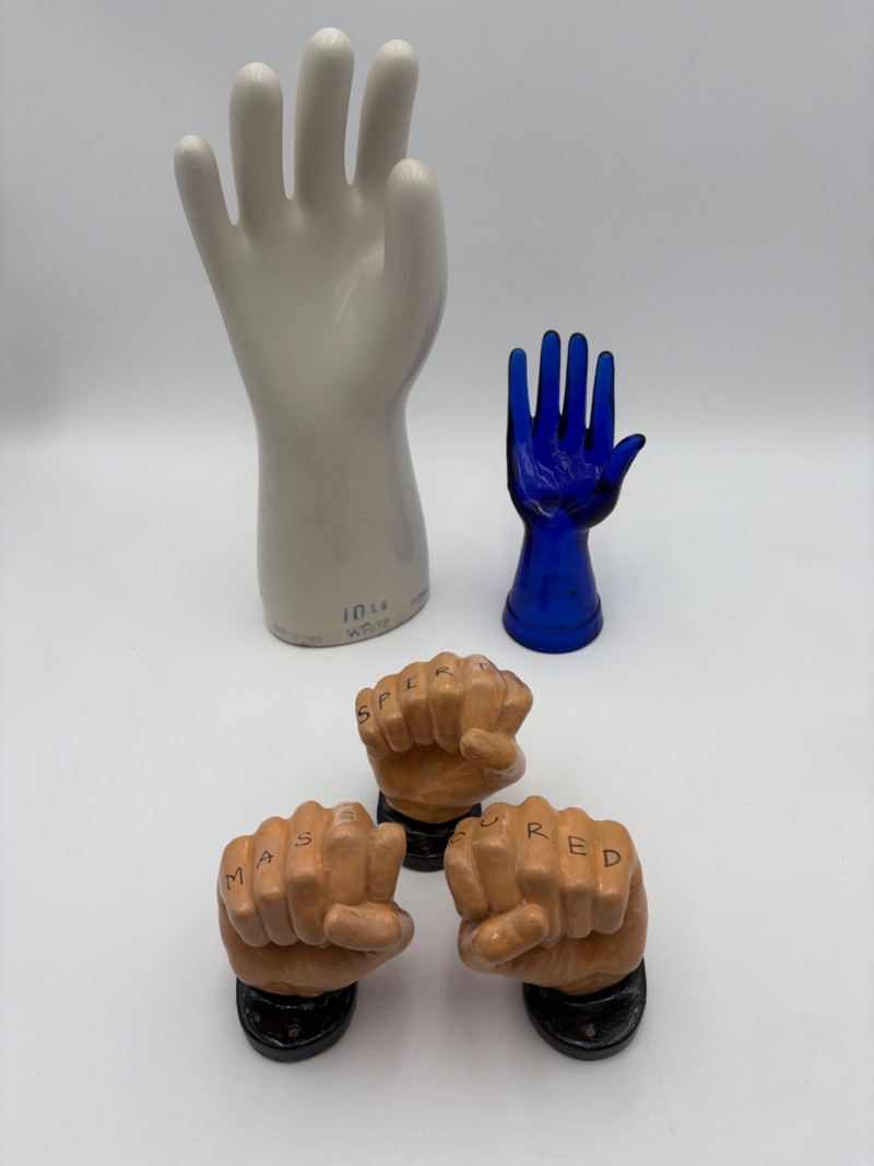 Several sets of hands in different forms. "Old Time Religion" art piece by Jena Scott from 2001 consisting of 3 ceramic hands making commentary on early American historical interaction between indigenous/enslaved folks & whites with regard to religion (play on "massa" "cured", and "massacured" [massacred]).. Fists measure about 5" H. Blue glass display hand for jewelry display/storage or just enjoying the great glass color. Measures 7.5" H. Large white porcelain glove mold - great conversation piece (who has a hand that size????) or to hang necklaces on. Measures 14" H.