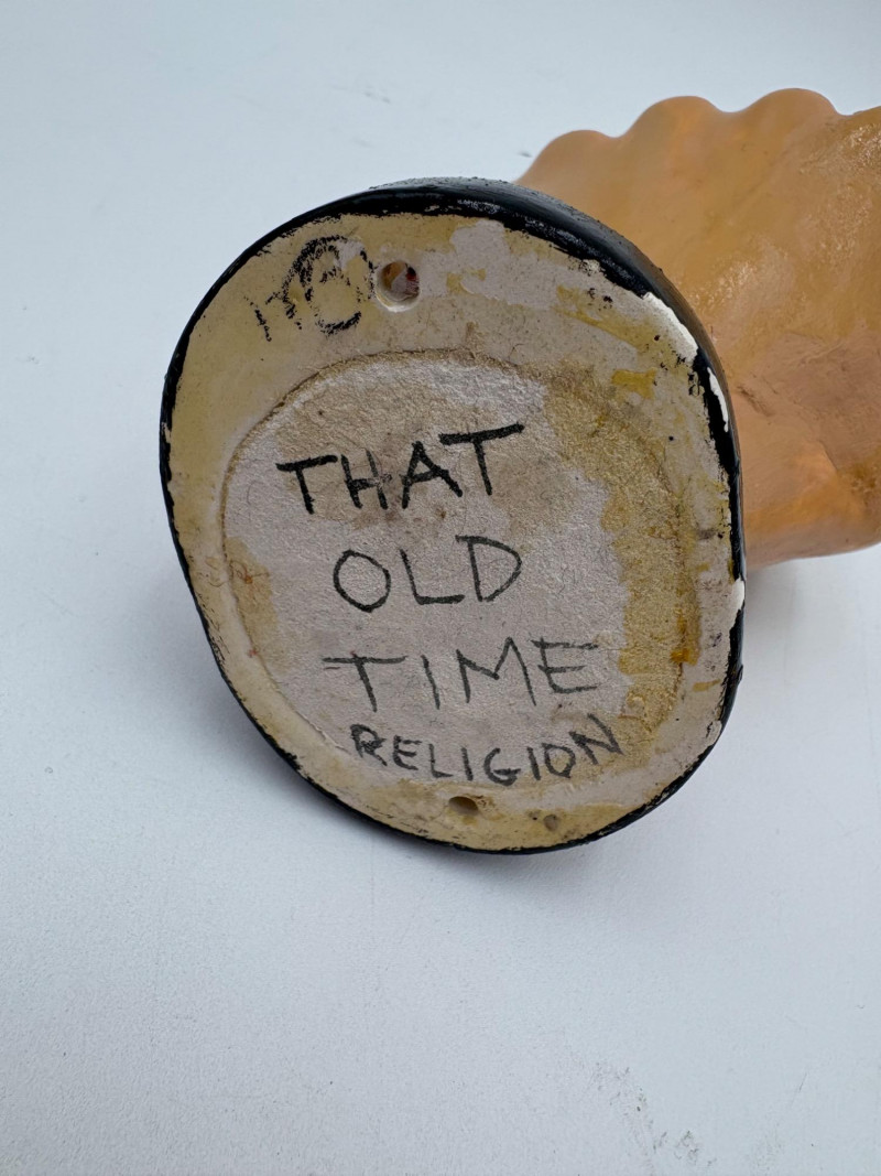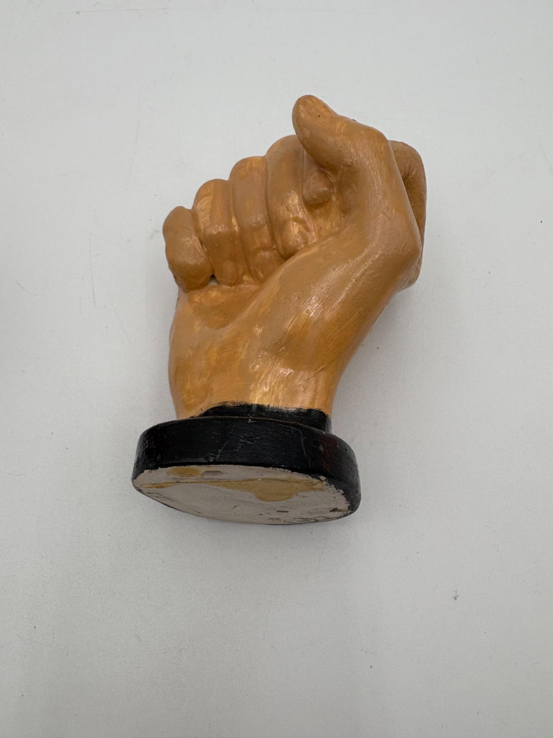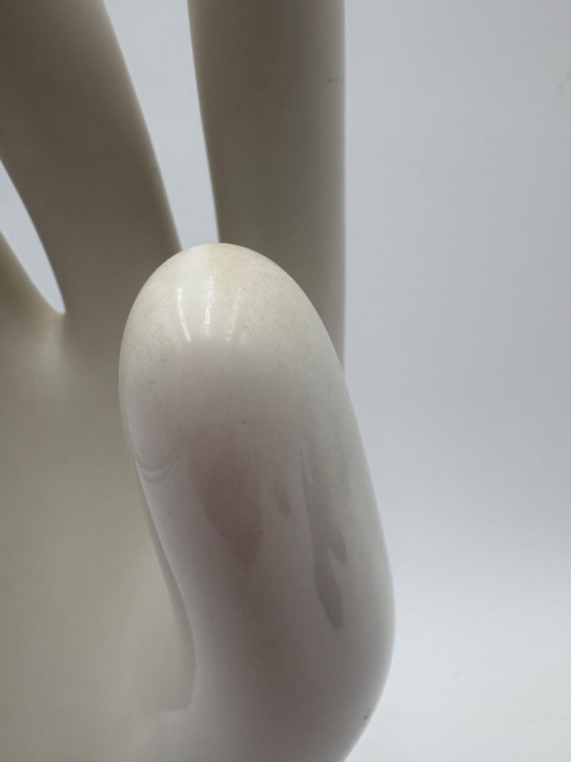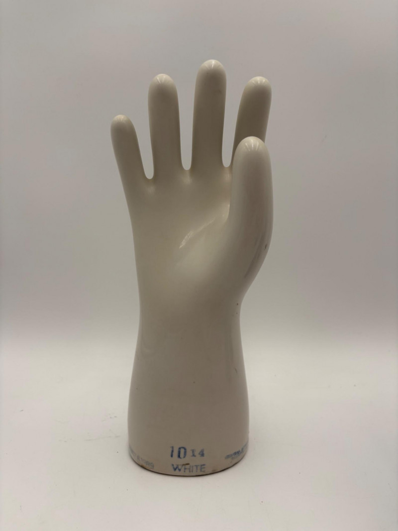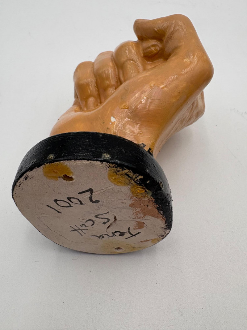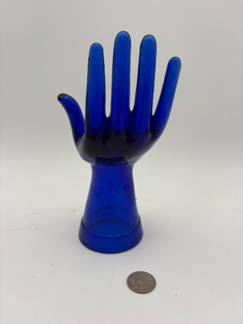 Several sets of hands in different forms. "Old Time Religion" art piece by Jena Scott from 2001 consisting of 3 ceramic hands making commentary on early American historical interaction between indigenous/enslaved folks & whites with regard to religion (play on "massa" "cured", and "massacured" [massacred]).. Fists measure about 5" H. Blue glass display hand for jewelry display/storage or just enjoying the great glass color. Measures 7.5" H. Large white porcelain glove mold - great conversation piece (who has a hand that size????) or to hang necklaces on. Measures 14" H.