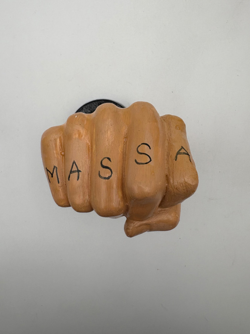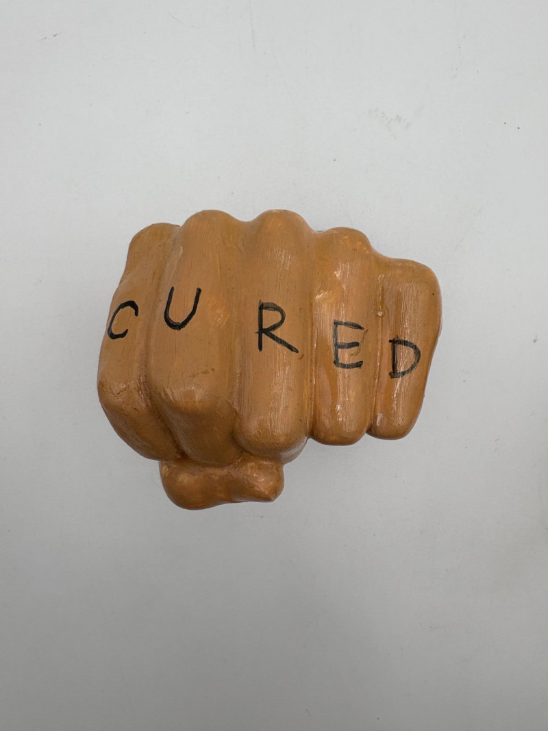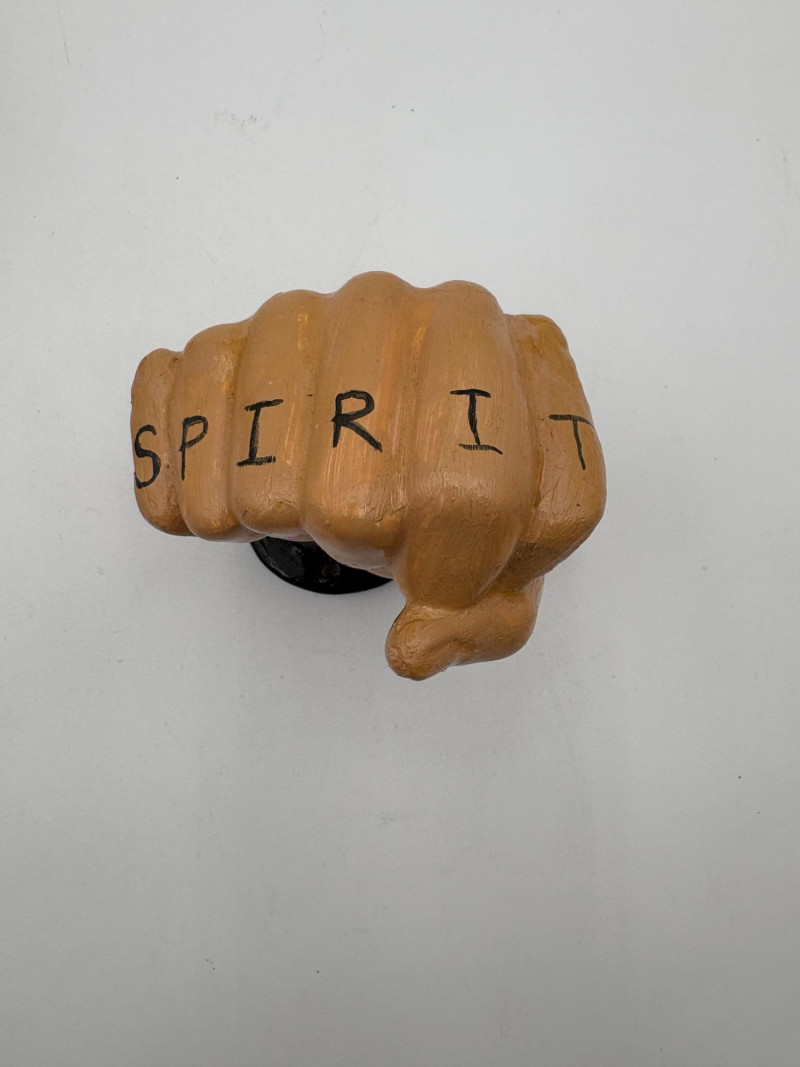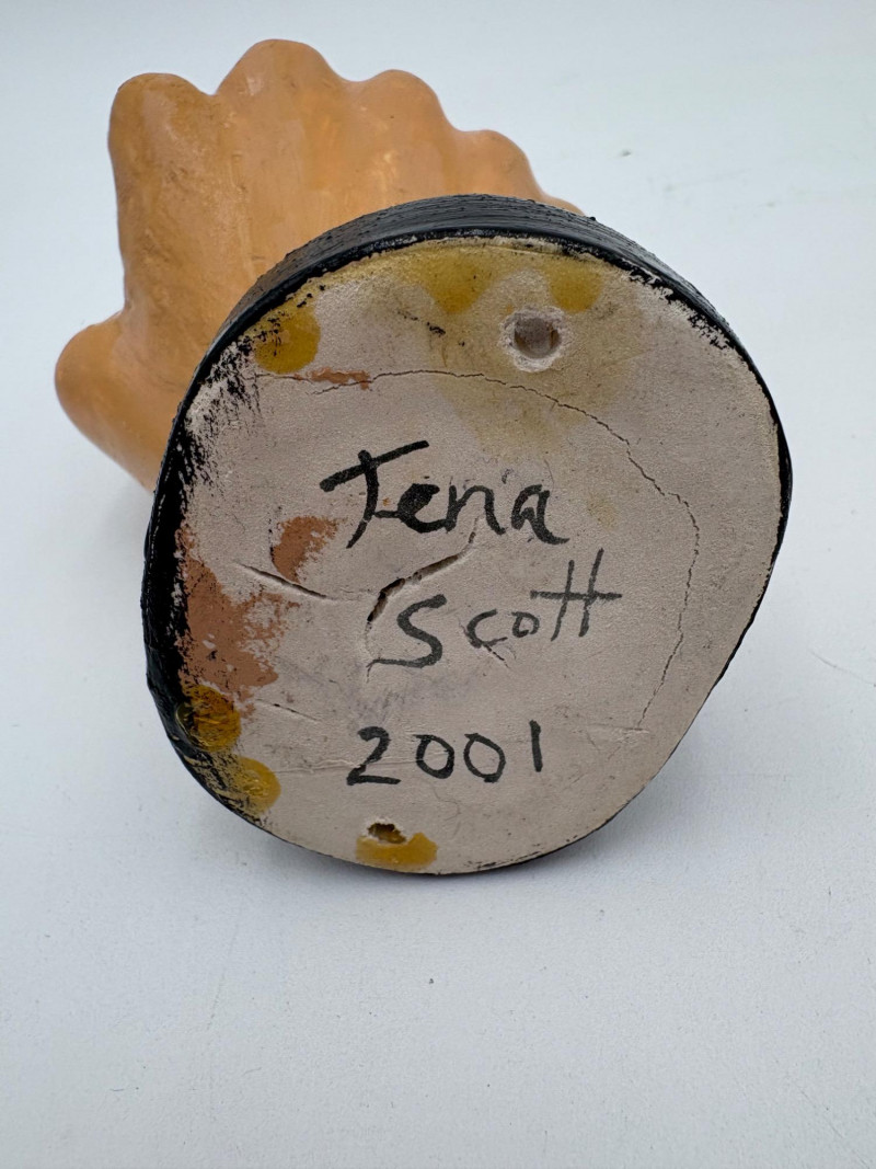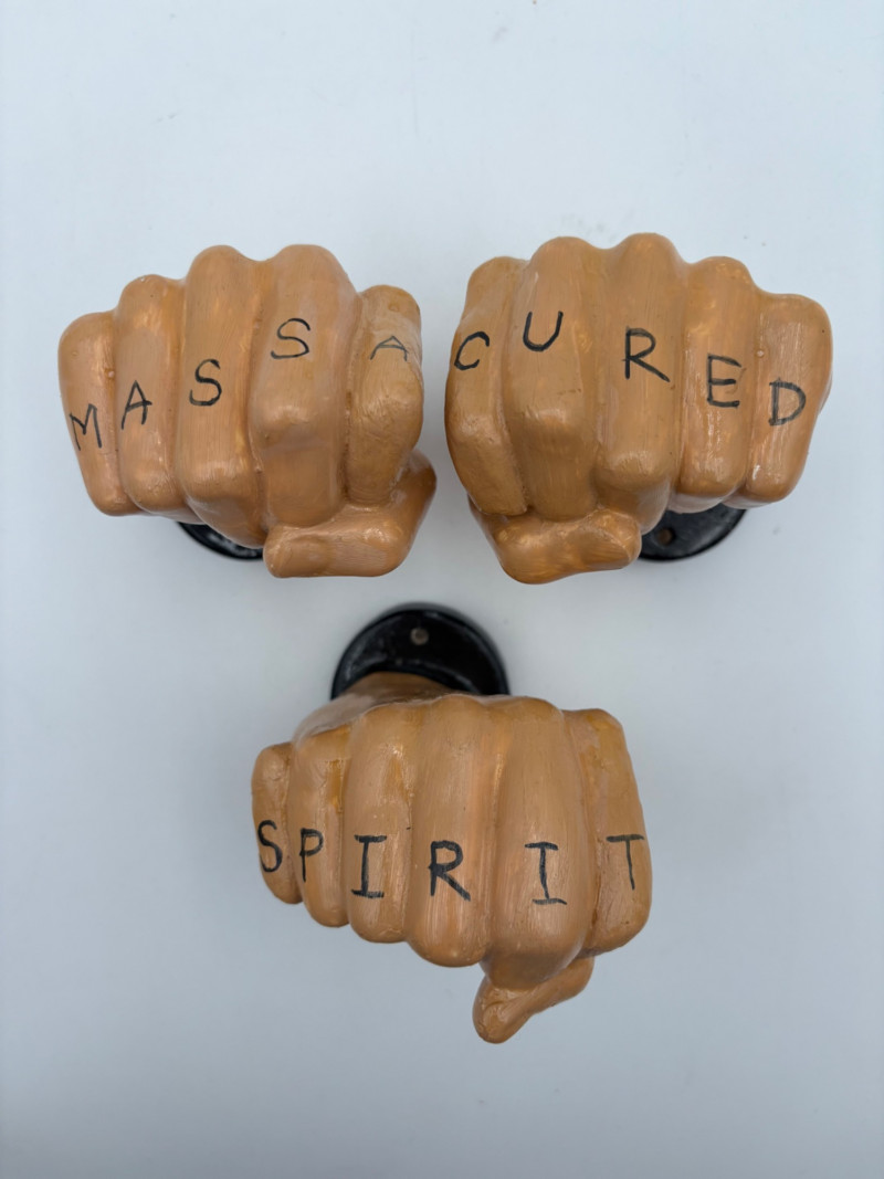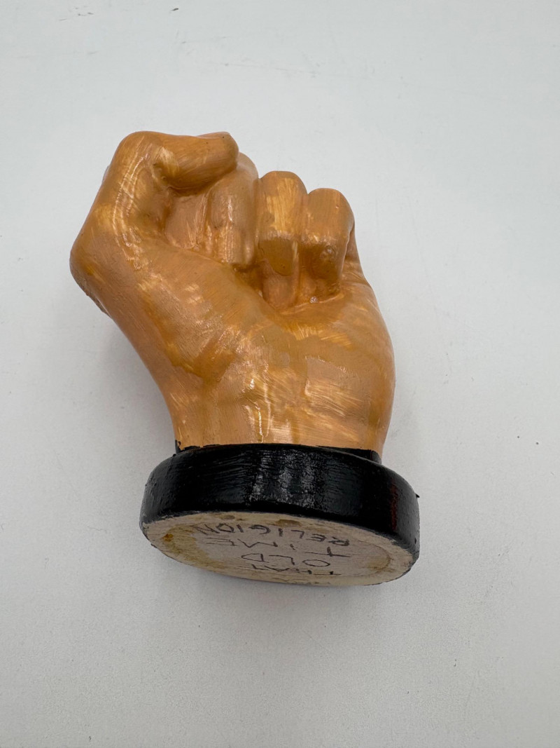Several sets of hands in different forms. "Old Time Religion" art piece by Jena Scott from 2001 consisting of 3 ceramic hands making commentary on early American historical interaction between indigenous/enslaved folks & whites with regard to religion (play on "massa" "cured", and "massacured" [massacred]).. Fists measure about 5" H. Blue glass display hand for jewelry display/storage or just enjoying the great glass color. Measures 7.5" H. Large white porcelain glove mold - great conversation piece (who has a hand that size????) or to hang necklaces on. Measures 14" H.