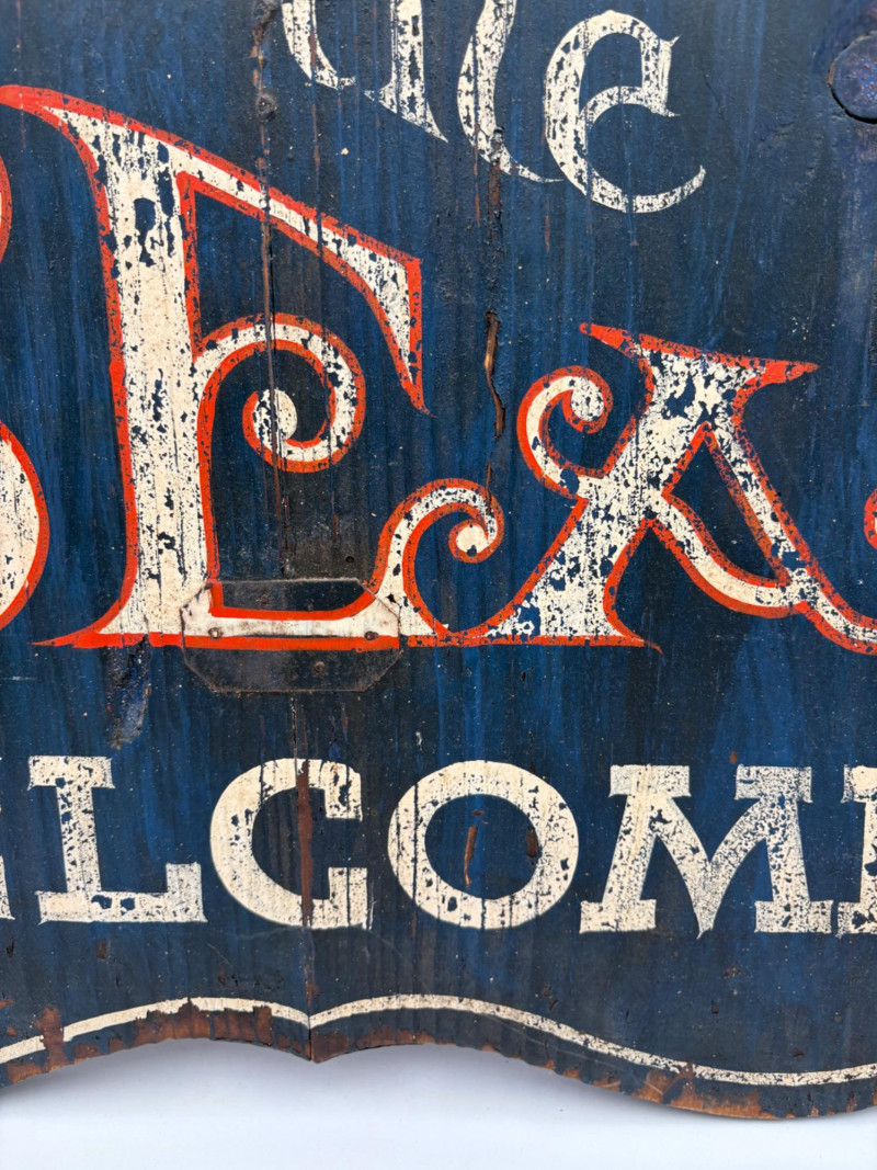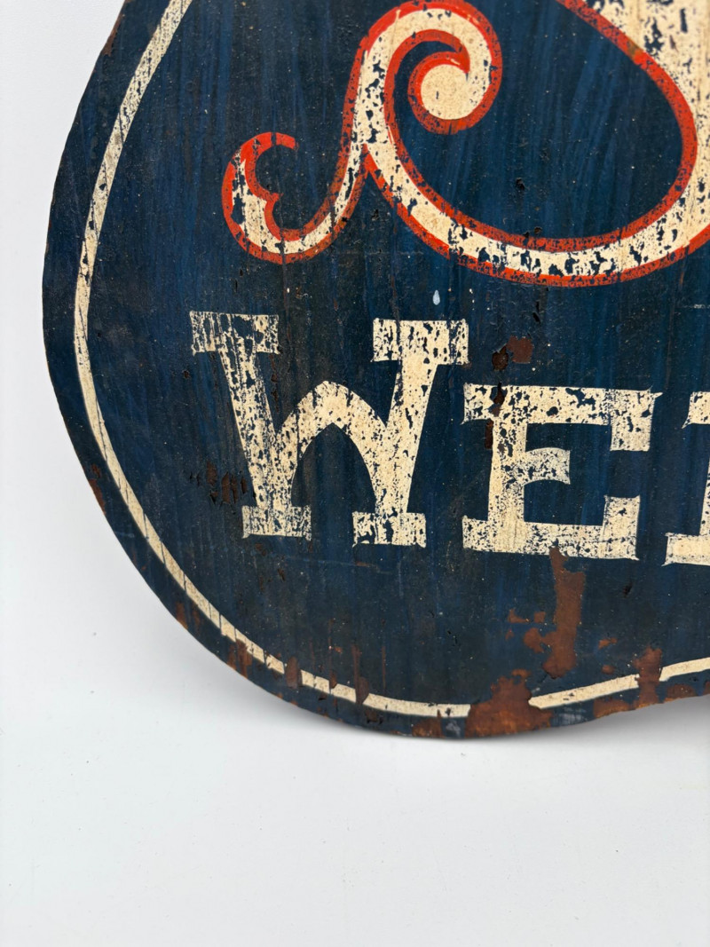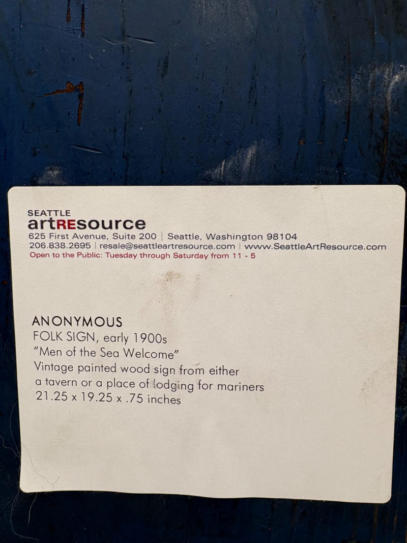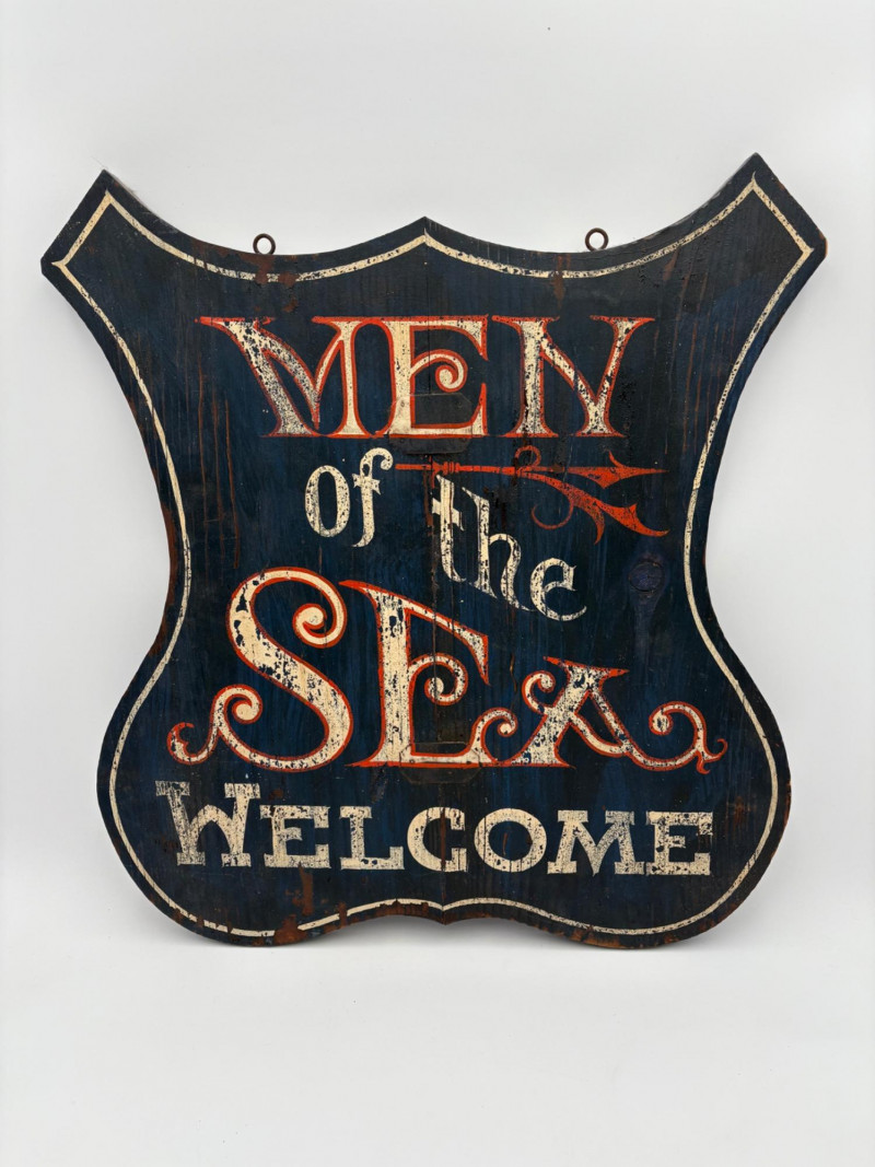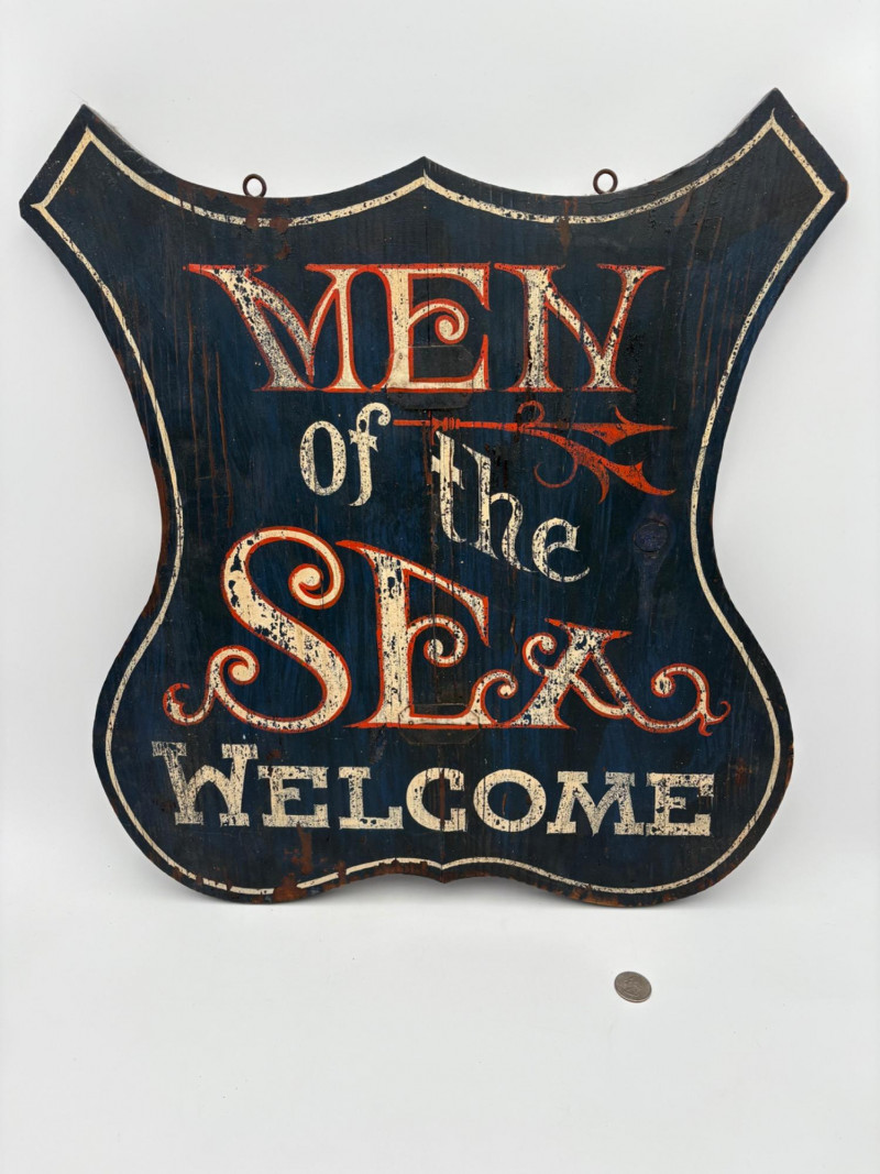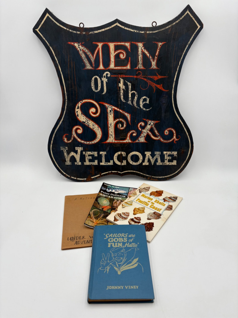 Sea-themed lot includes an antique sign and 4 books. "Men of the Sea Welcome" antique wooden sign in a shield shape from the early 1900s. This is probably from a tavern or a lodging house. Measures 21.25" H x 19.25" W x 3/4" thick. Purchased from the late great Art Resource Gallery in Seattle. Has two hanging loops at the top. Solidly constructed with terrific weathered surface "Under Water Adventure" art book by A. Roiters. On natural colored paper from 1993. "Guide to the Point Defiance Aquarium" Tacoma venue animal/plant guide from 1968. "Marine Shells of the Pacific Coast" by Tom Rice. 1972 field guide with color photos. "Sailors are Gobs of Fun, Hattie" by Johnny Viney. 1943 fictional tale.