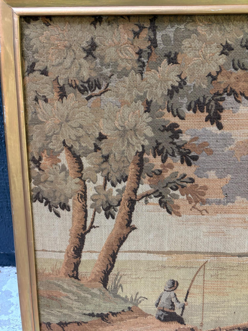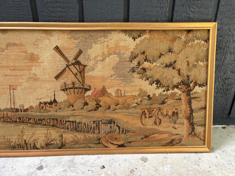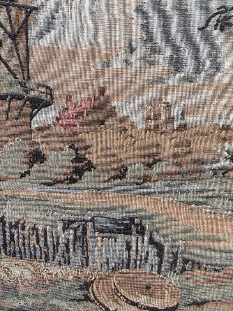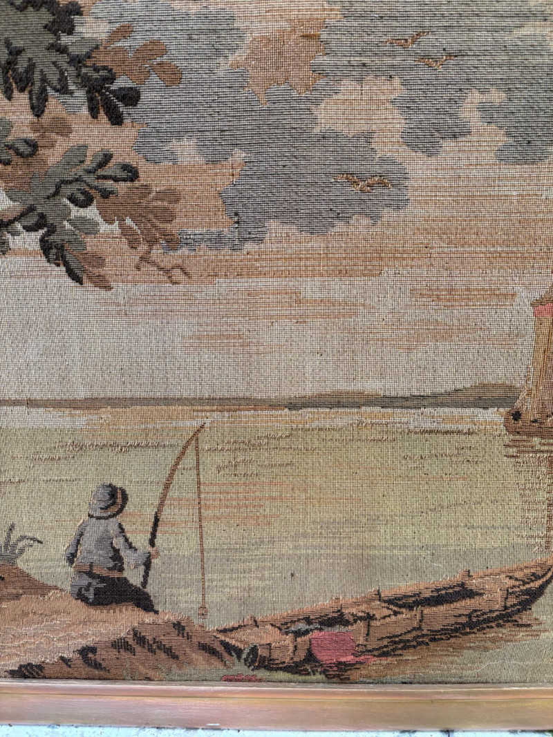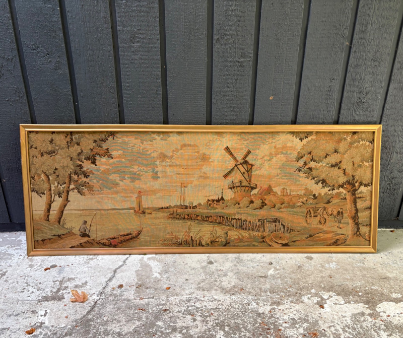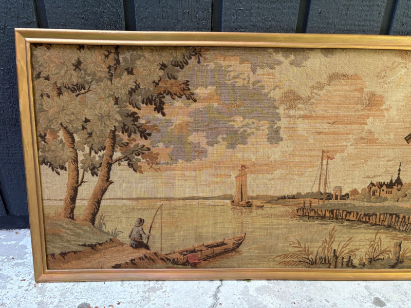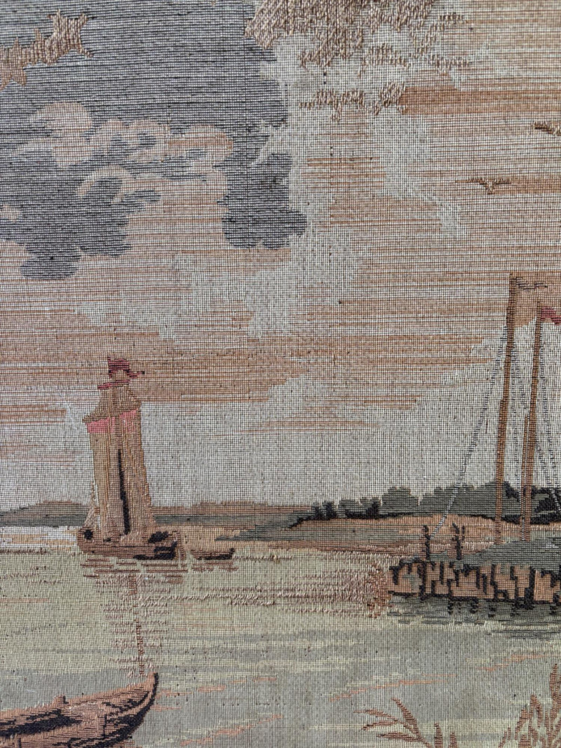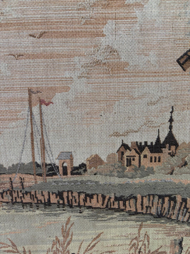 Client purchased this tapestry from another collector several years ago who told her the tapestry belonged to her parents and was from Antwerp, Belgium, circa 1830. The Belgians have been known to produce the high quality tapestries for hundreds of years, so that probably explains why this piece is in such terrific condition for its age if the previous owner dated it accurately (and the fact that its owners were fastidious about caring for it). The tapestry is in neutral colors - they may have been more brilliant when first woven, but today they are subtle and muted. The scene is one of a typical landscape in the Lowlands (today's Belgium & the Netherlands). Windmills, fishers, sailboats, and ever-present water dominate the landscape. Wonderful detail with no noticeable flaws. Mounted on wood backing - appears to have been laid on the wood and then the frame attached on top to "sandwich" the tapestry - as far as we can tell, it is not glued to the board. Frame is tired - a new frame would probably show this piece in a whole new light. #belgiantapestry #belgiumfabric #antiquetapestry Measures 26" H x 70.5" W framed. Sound Estate Company does not appraise art or guarantee authenticity.