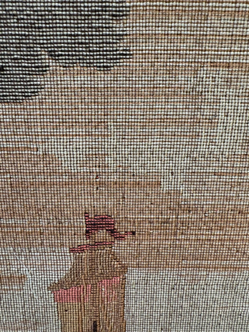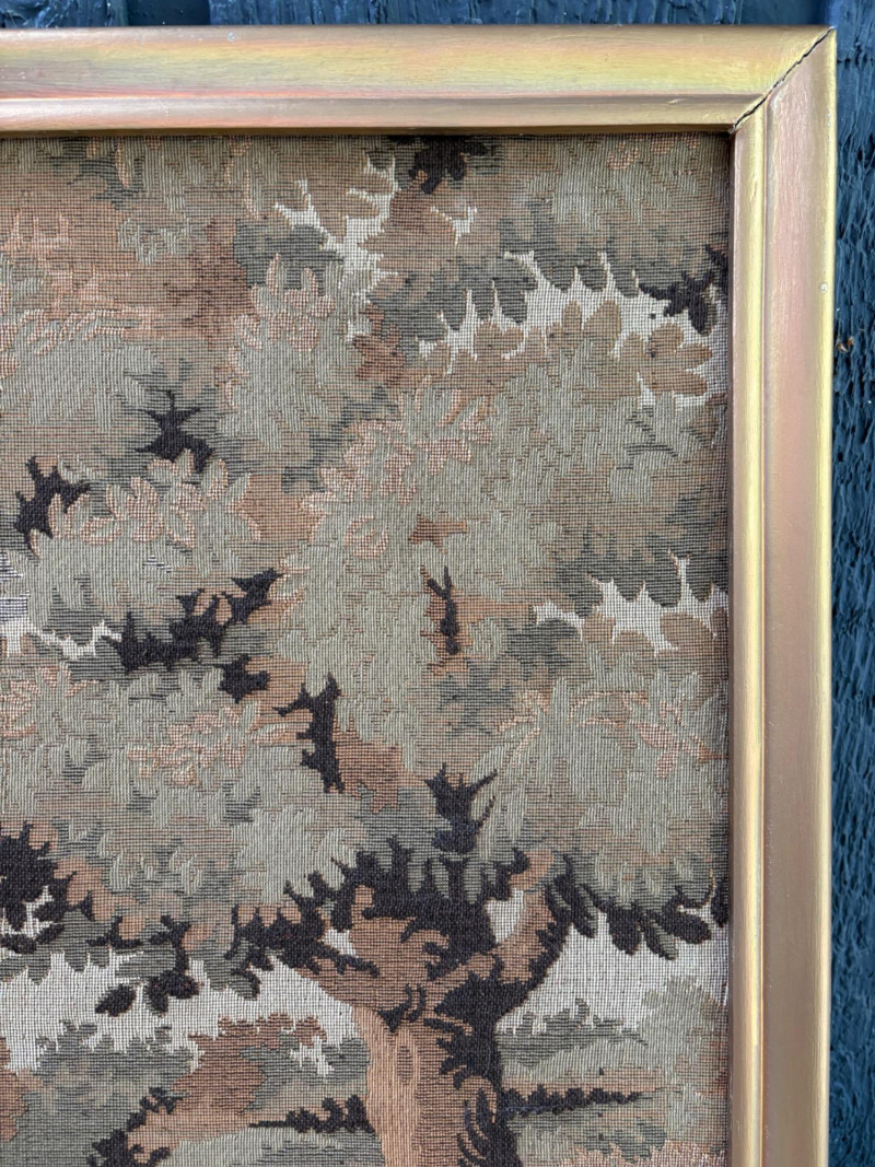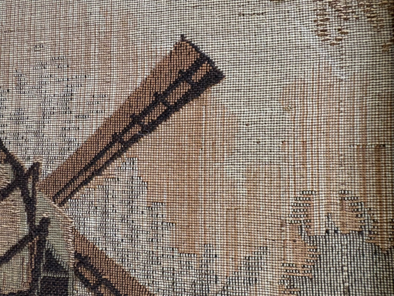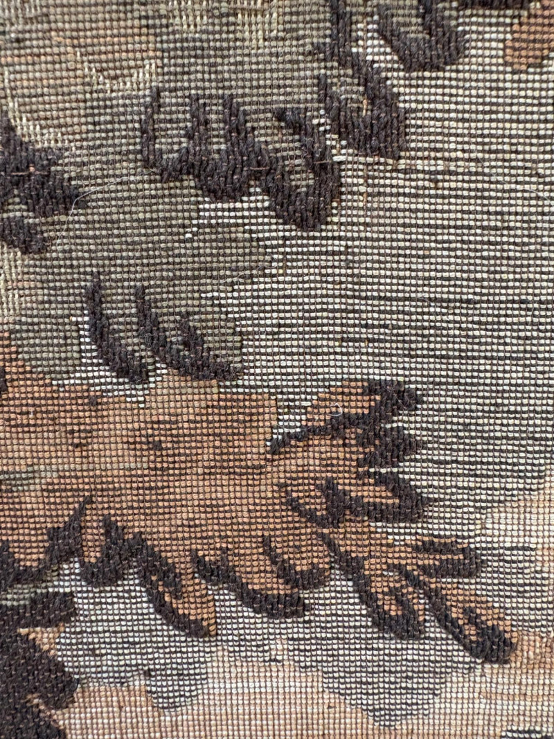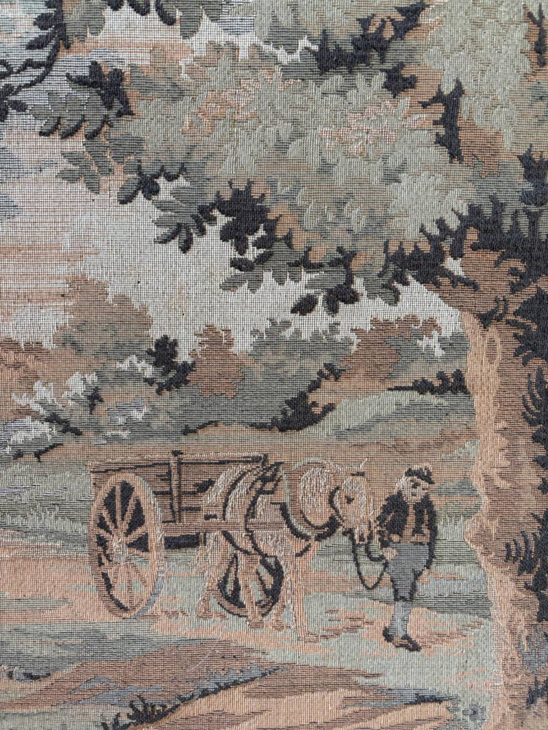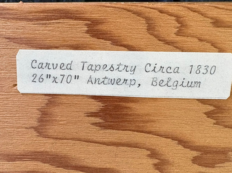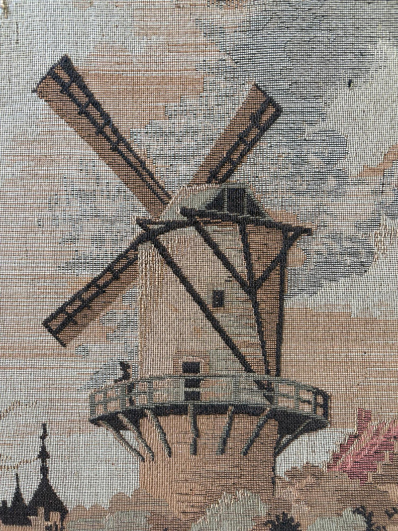 Client purchased this tapestry from another collector several years ago who told her the tapestry belonged to her parents and was from Antwerp, Belgium, circa 1830. The Belgians have been known to produce the high quality tapestries for hundreds of years, so that probably explains why this piece is in such terrific condition for its age if the previous owner dated it accurately (and the fact that its owners were fastidious about caring for it). The tapestry is in neutral colors - they may have been more brilliant when first woven, but today they are subtle and muted. The scene is one of a typical landscape in the Lowlands (today's Belgium & the Netherlands). Windmills, fishers, sailboats, and ever-present water dominate the landscape. Wonderful detail with no noticeable flaws. Mounted on wood backing - appears to have been laid on the wood and then the frame attached on top to "sandwich" the tapestry - as far as we can tell, it is not glued to the board. Frame is tired - a new frame would probably show this piece in a whole new light. #belgiantapestry #belgiumfabric #antiquetapestry Measures 26" H x 70.5" W framed. Sound Estate Company does not appraise art or guarantee authenticity.
