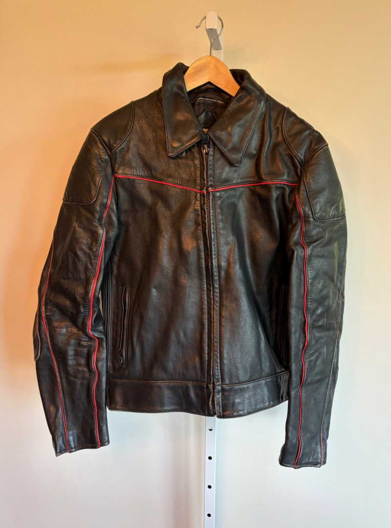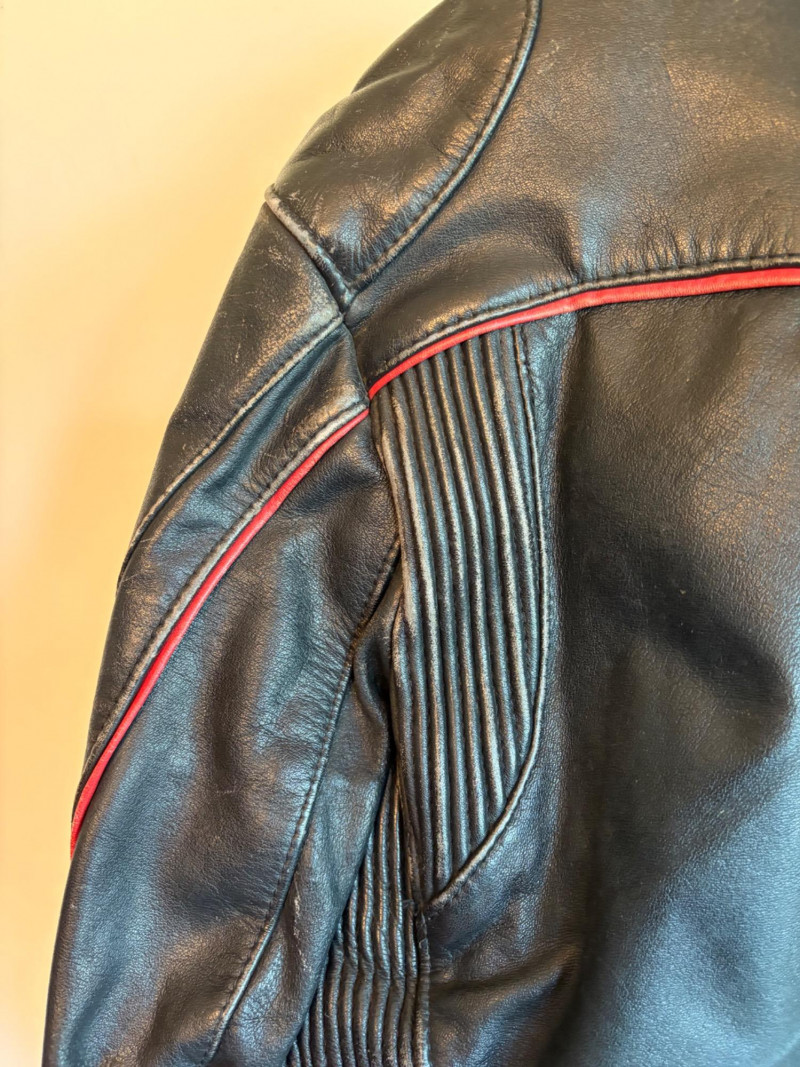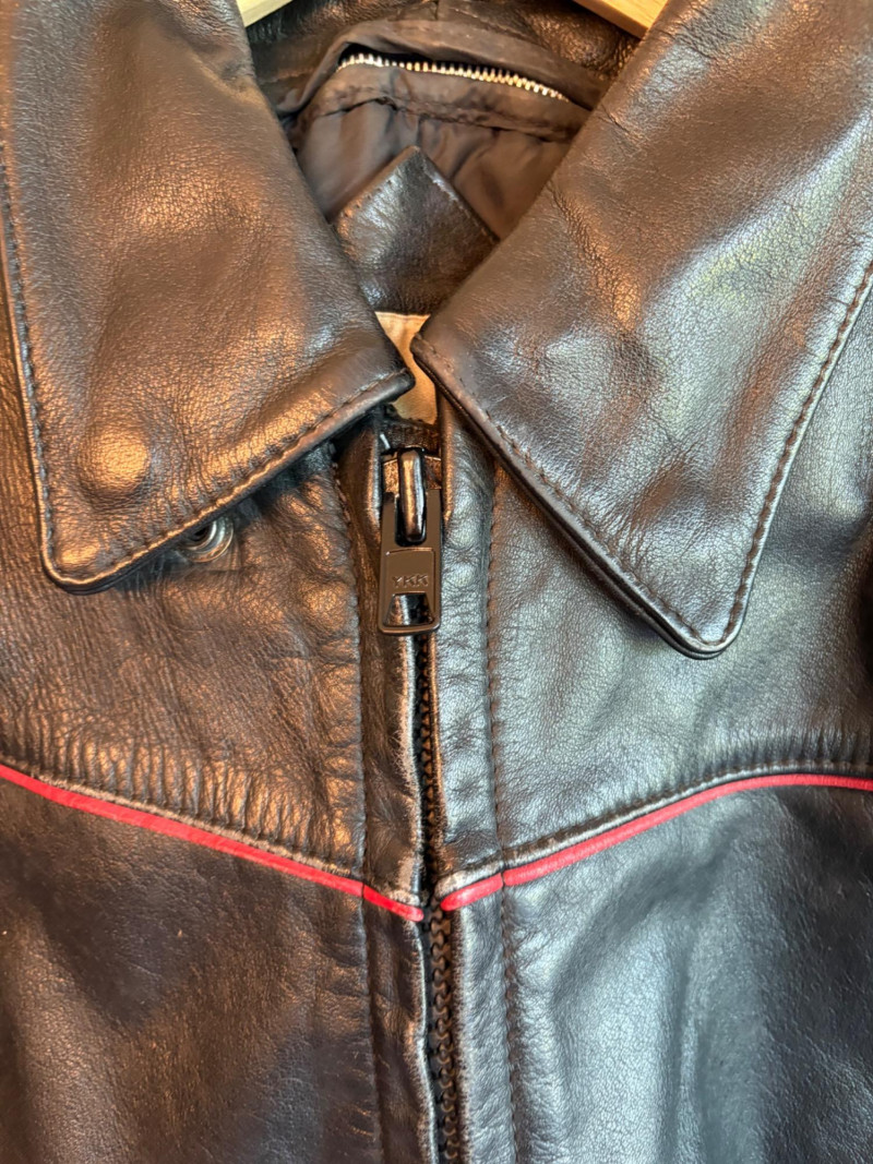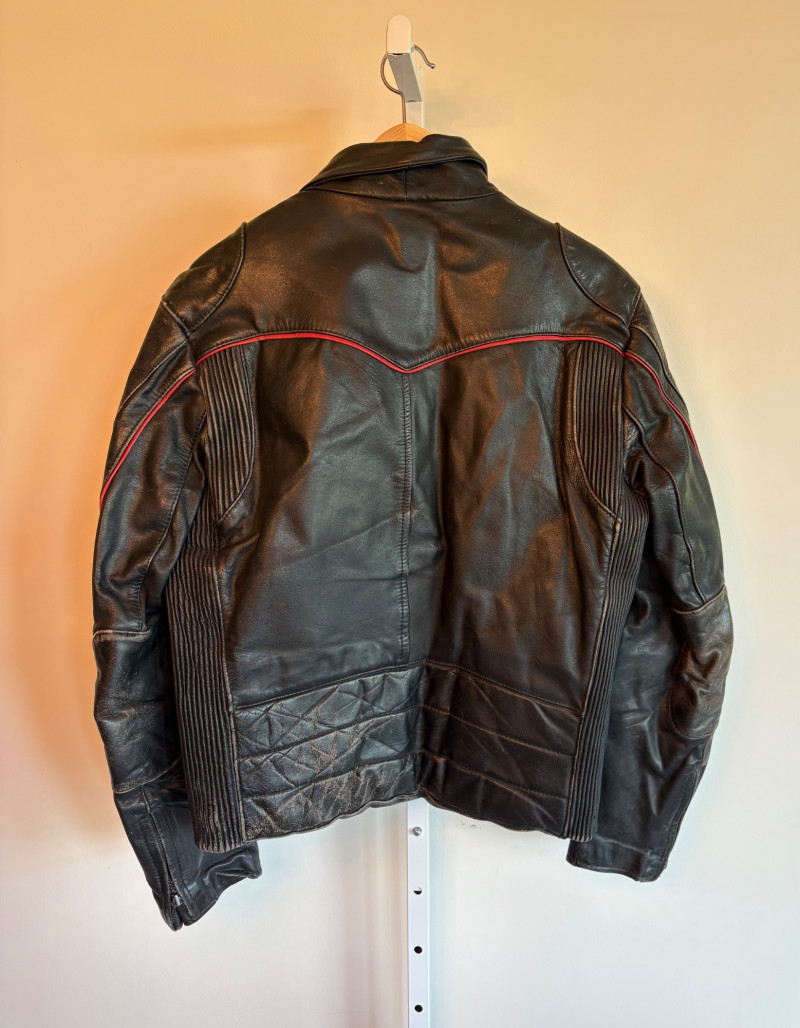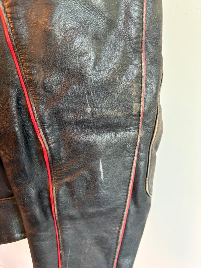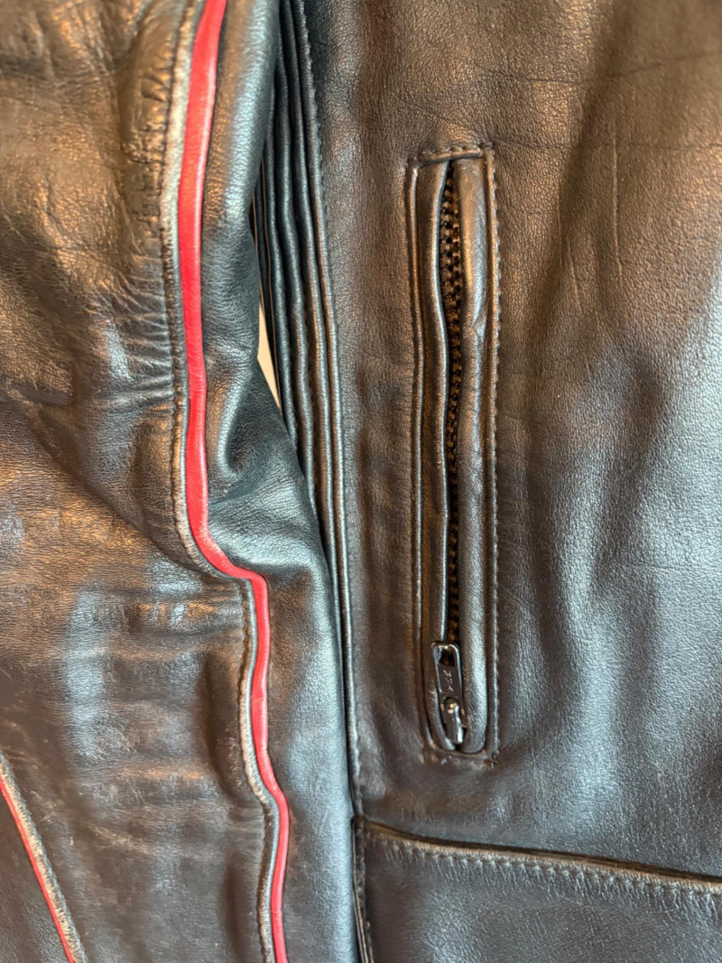Heavy black leather Moto coat from Berman's with red piping, elasticated leather sections at sides and shoulders, and layering on shoulders & elbows. Padded back waist. Zip closures on front with placket, waist front pockets, and wrists (note that the wrist zippers work, but need new pull tabs to make them zip easier). Quilted inside with two breast pockets and a removable zip-out back liner. Measures 22" pit to pit and 25" from back neckline seam to bottom back hem. Berman's tag is a bit loose at the top point. Also in this lot is a pair of stylish red/black/white riding gloves. They are padded on the palm. Size tag says 8 & they seem fairly true to size.