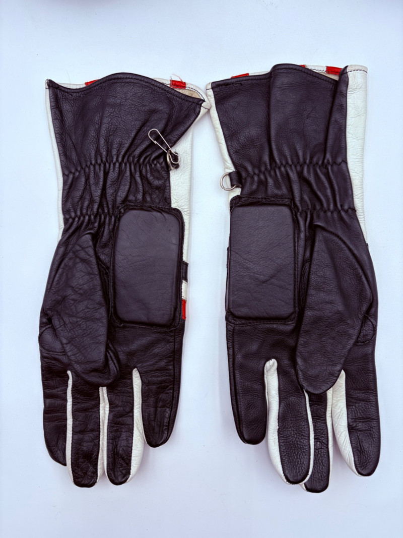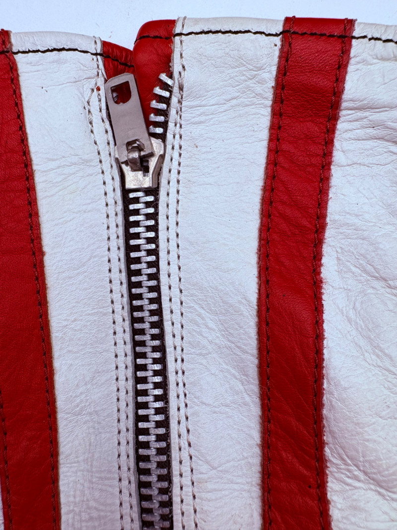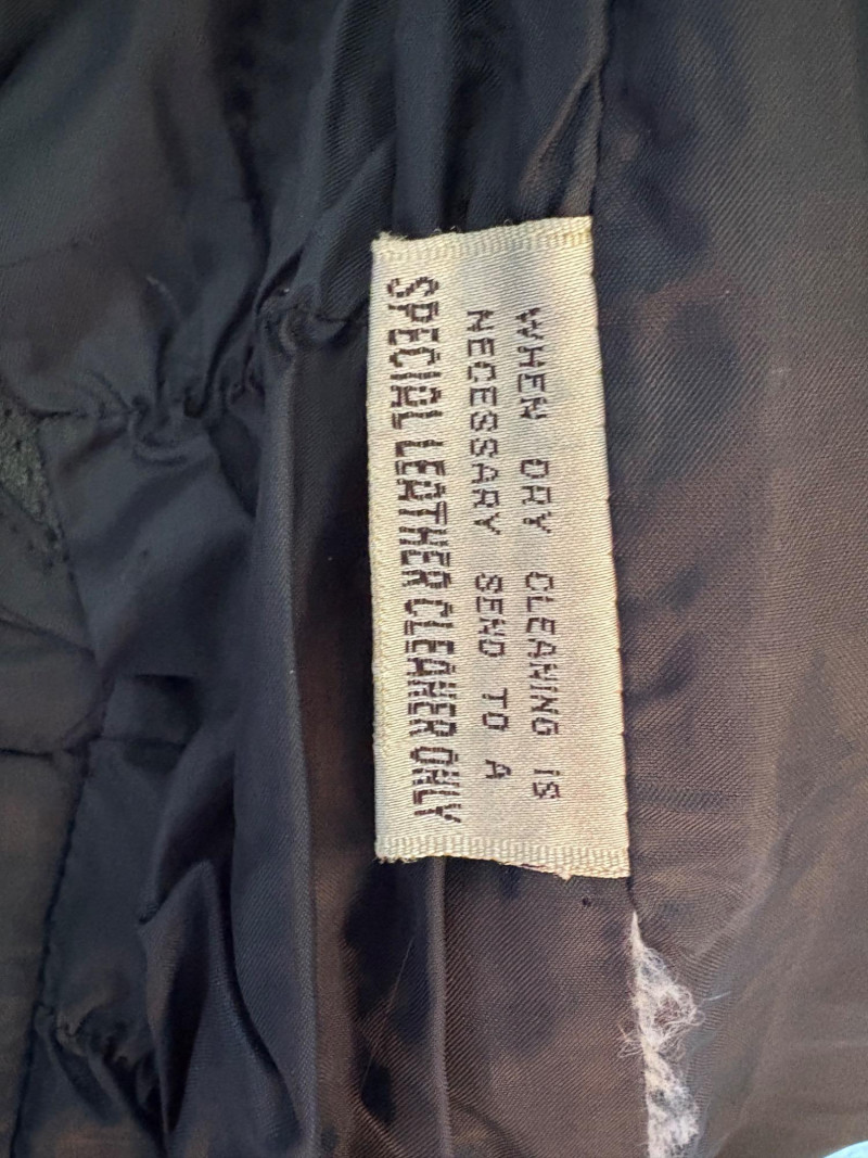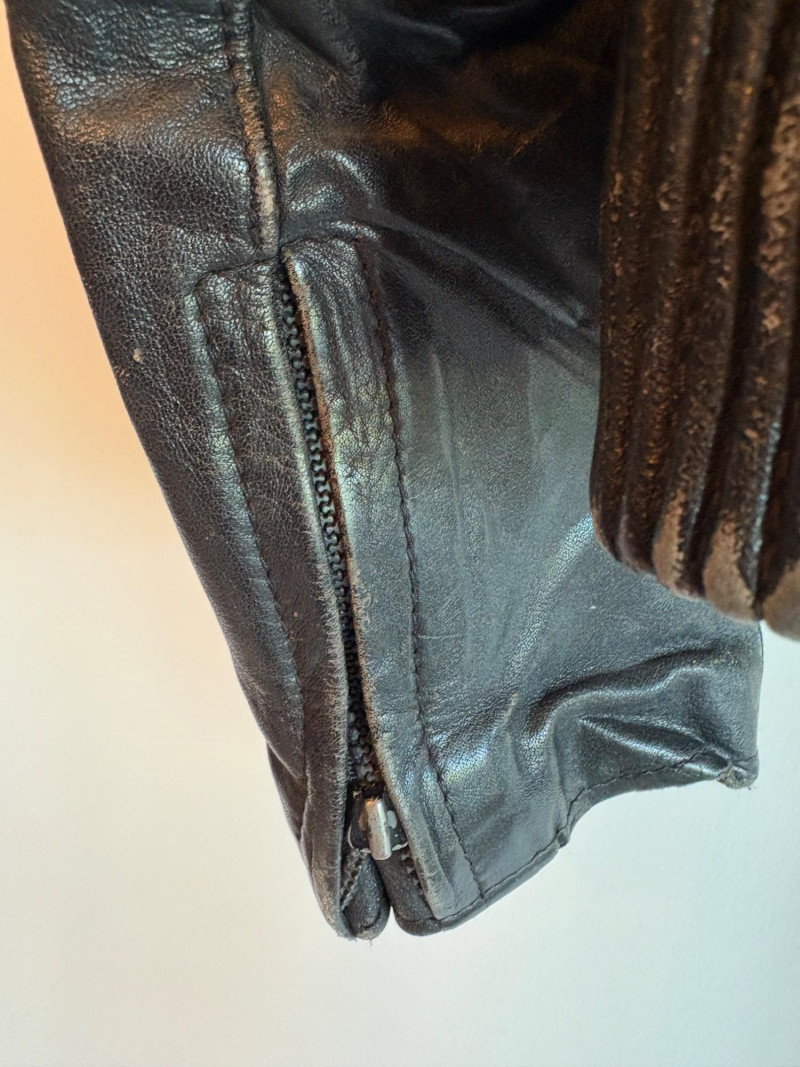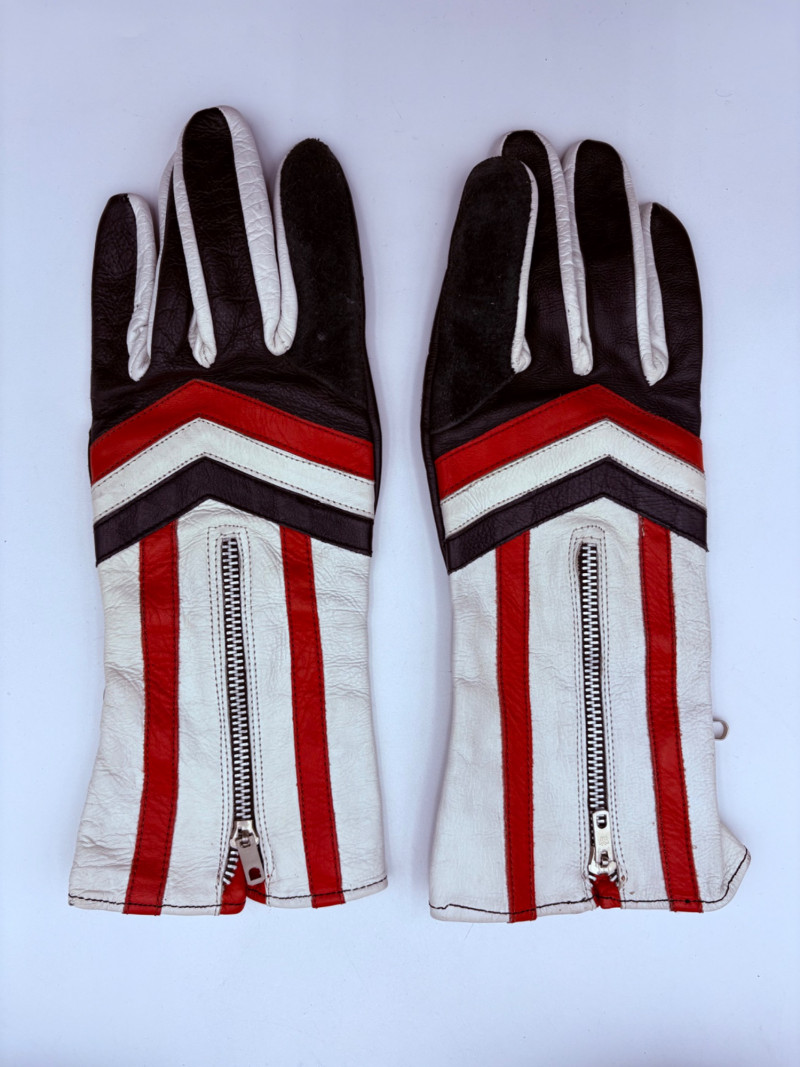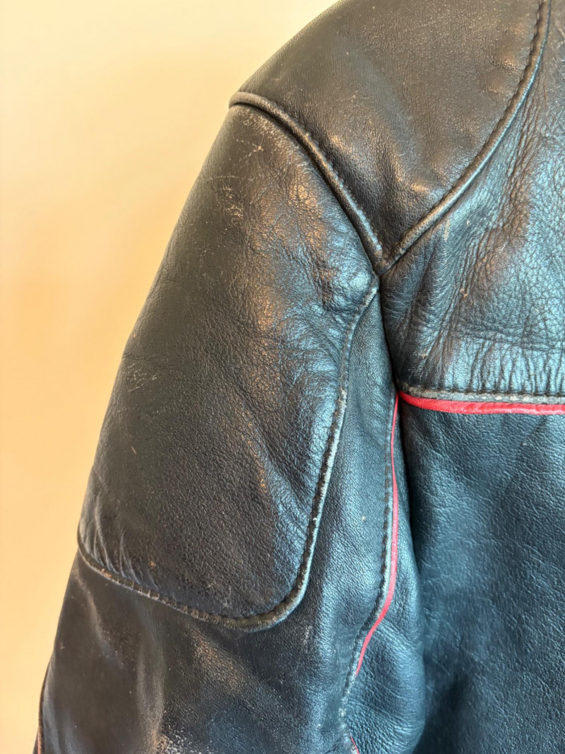 Heavy black leather Moto coat from Berman's with red piping, elasticated leather sections at sides and shoulders, and layering on shoulders & elbows. Padded back waist. Zip closures on front with placket, waist front pockets, and wrists (note that the wrist zippers work, but need new pull tabs to make them zip easier). Quilted inside with two breast pockets and a removable zip-out back liner. Measures 22" pit to pit and 25" from back neckline seam to bottom back hem. Berman's tag is a bit loose at the top point. Also in this lot is a pair of stylish red/black/white riding gloves. They are padded on the palm. Size tag says 8 & they seem fairly true to size.