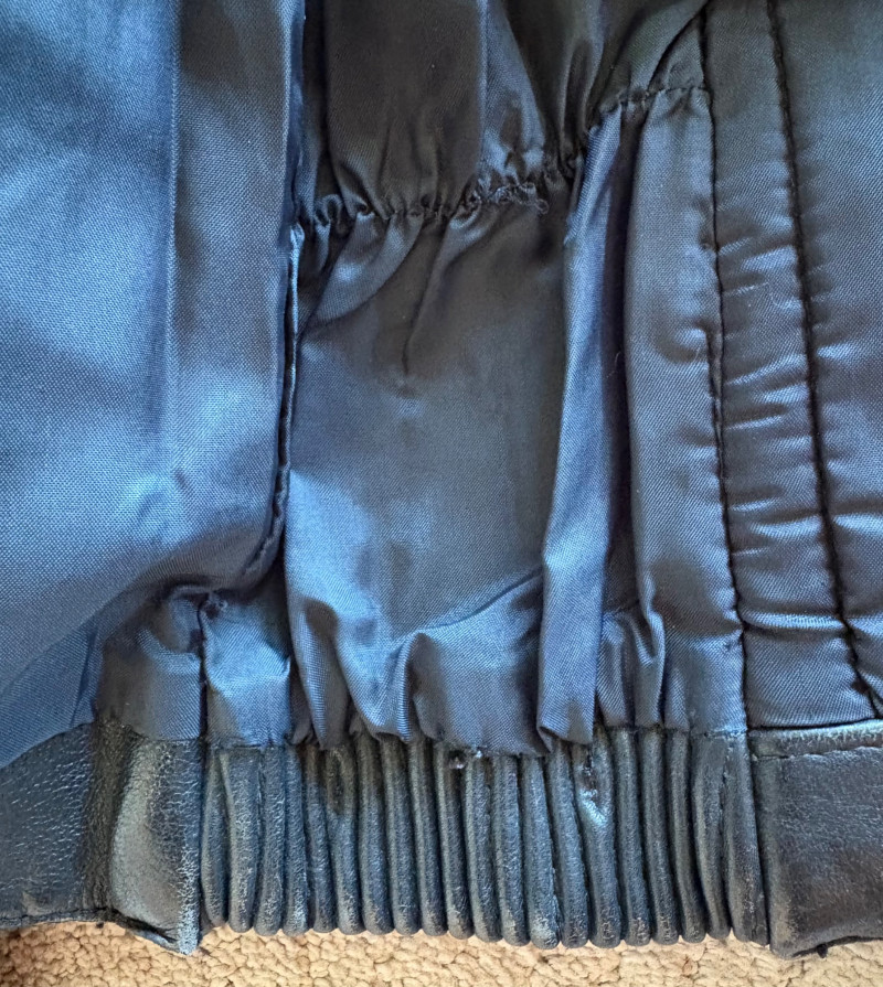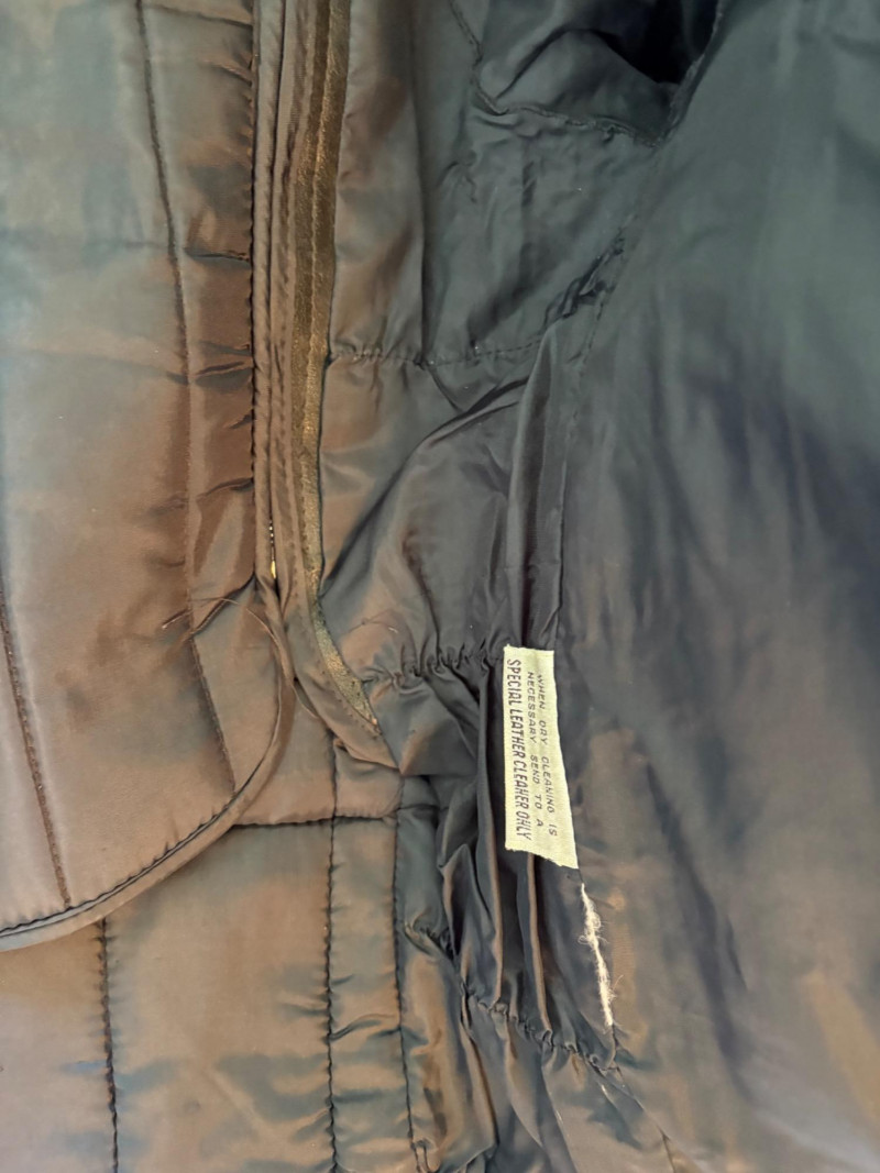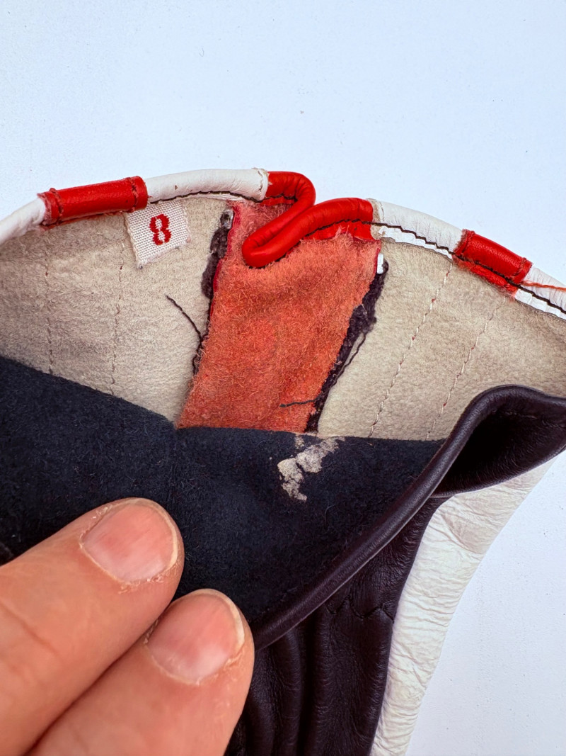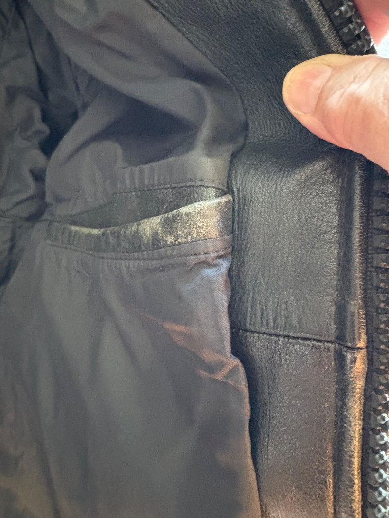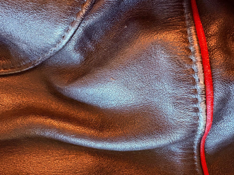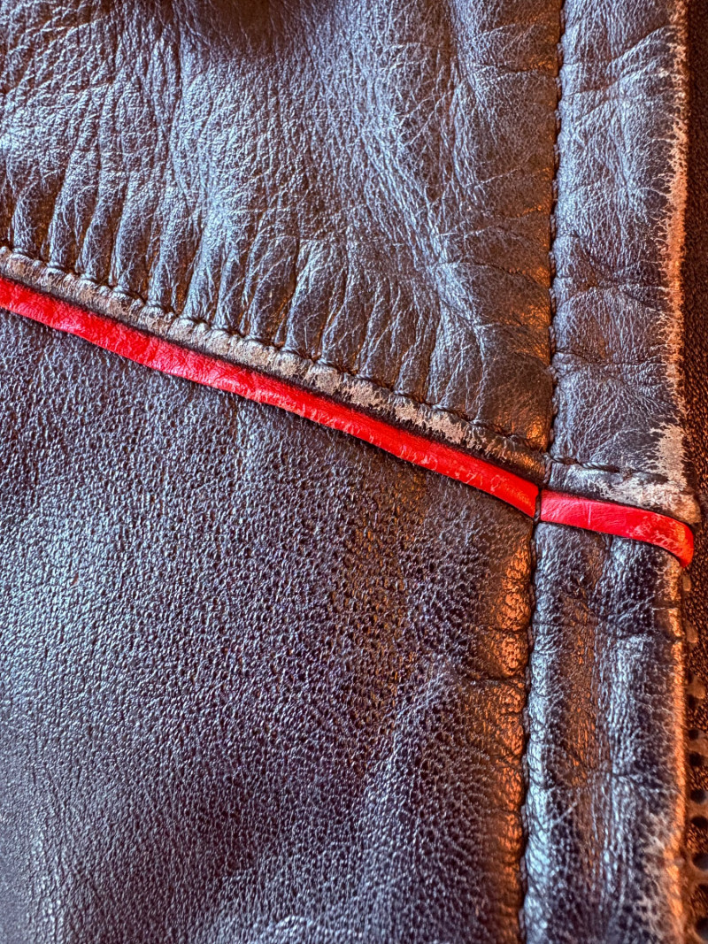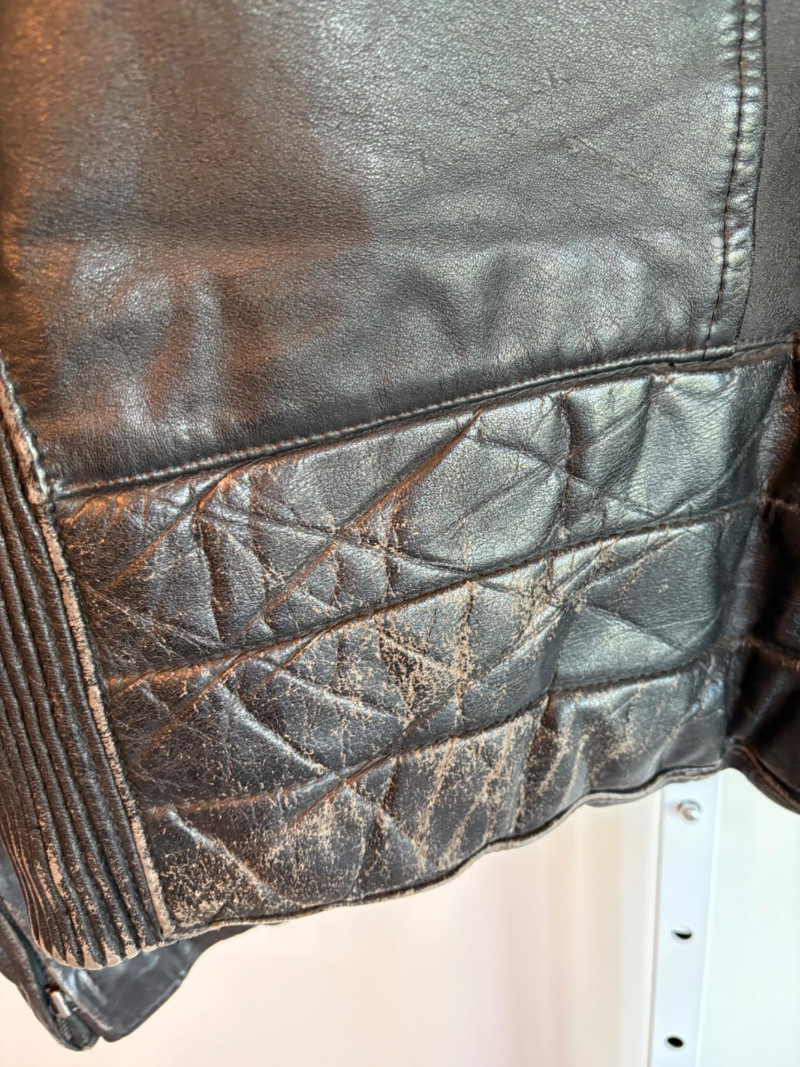 Heavy black leather Moto coat from Berman's with red piping, elasticated leather sections at sides and shoulders, and layering on shoulders & elbows. Padded back waist. Zip closures on front with placket, waist front pockets, and wrists (note that the wrist zippers work, but need new pull tabs to make them zip easier). Quilted inside with two breast pockets and a removable zip-out back liner. Measures 22" pit to pit and 25" from back neckline seam to bottom back hem. Berman's tag is a bit loose at the top point. Also in this lot is a pair of stylish red/black/white riding gloves. They are padded on the palm. Size tag says 8 & they seem fairly true to size.