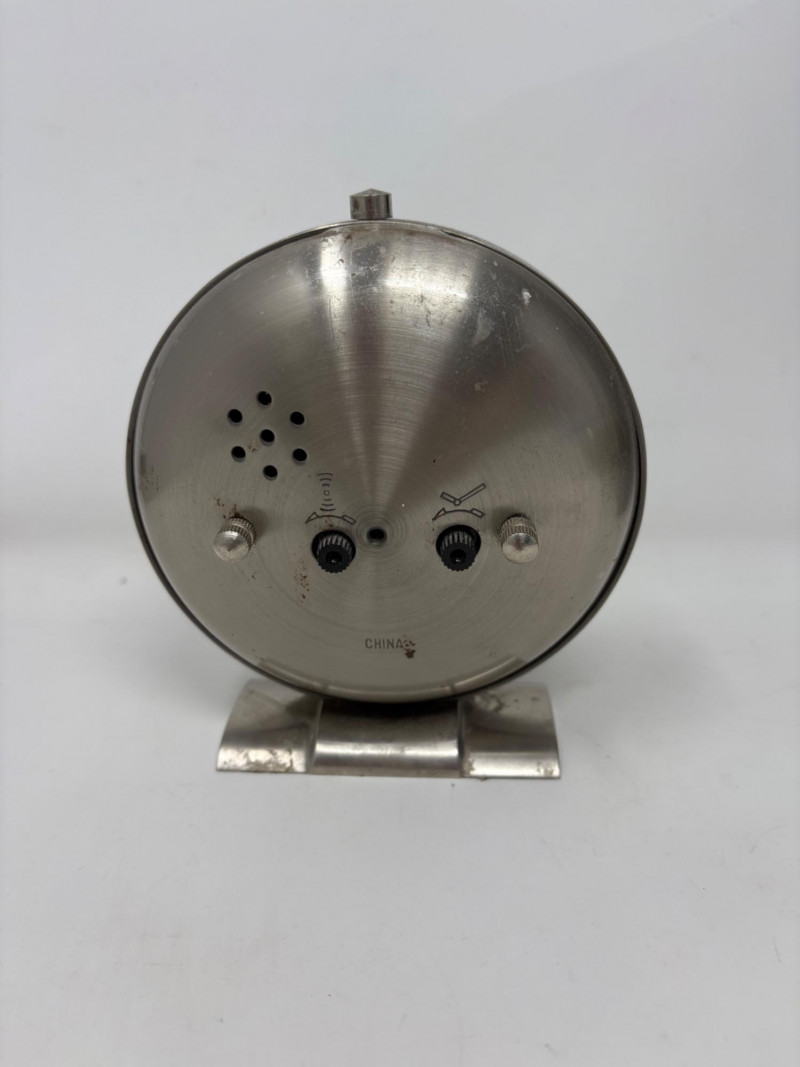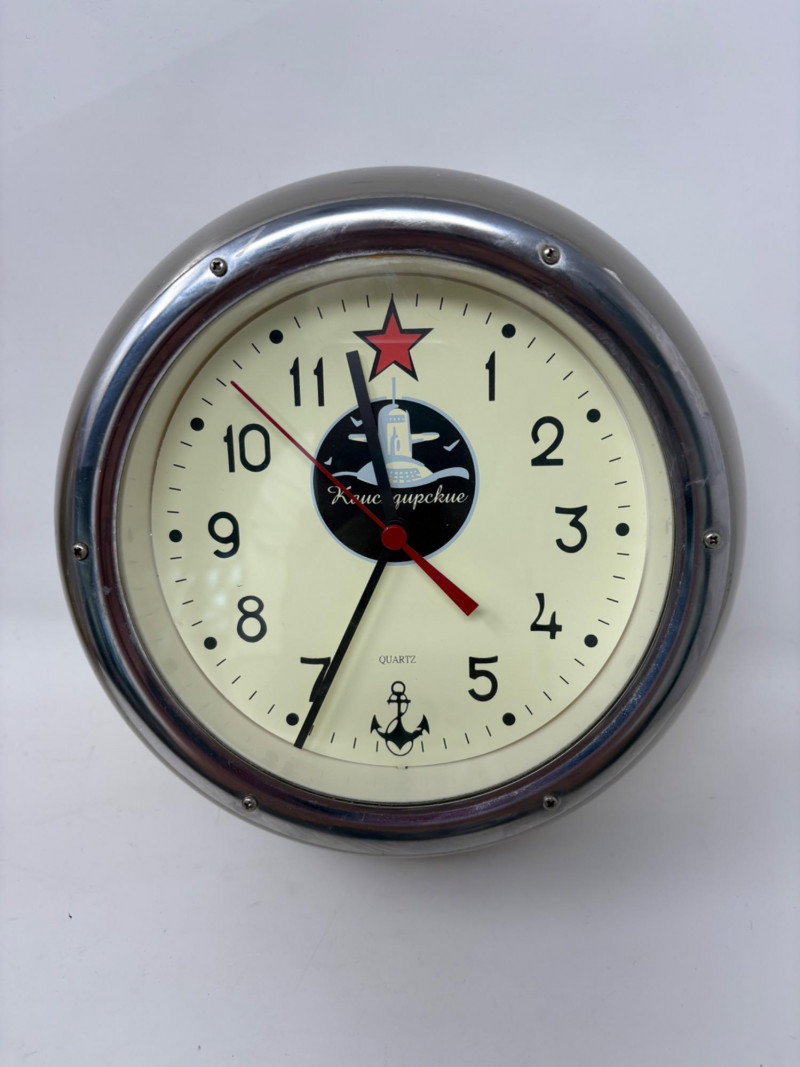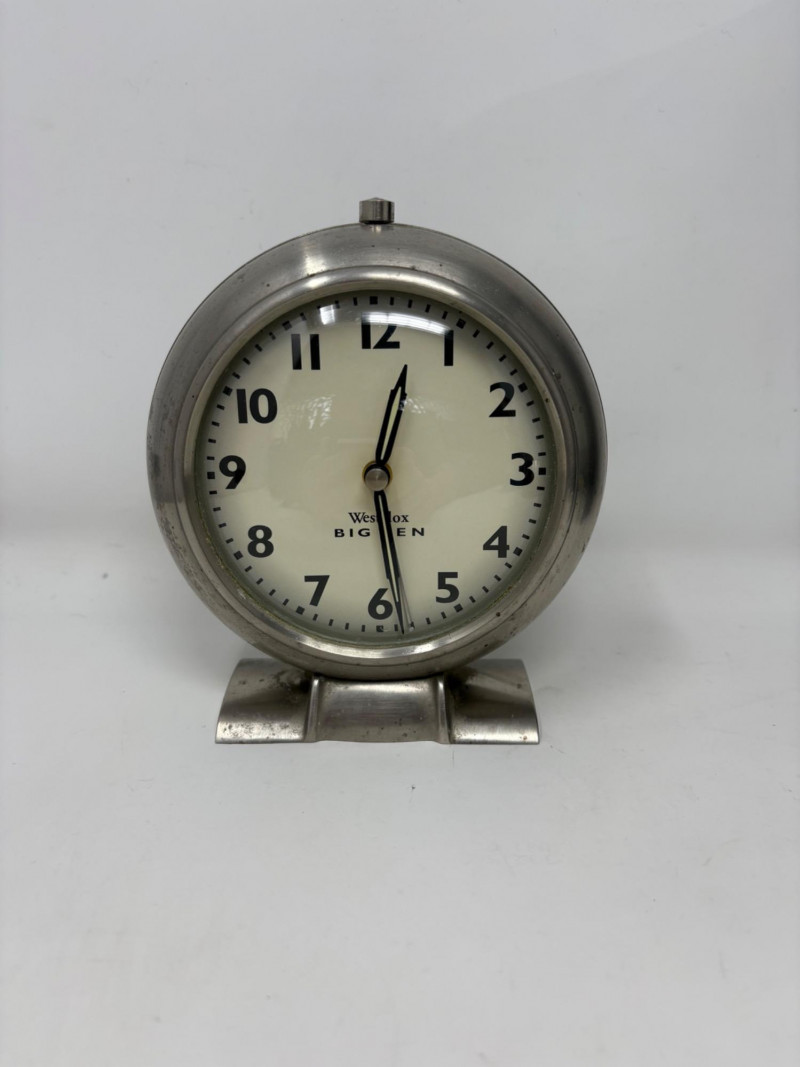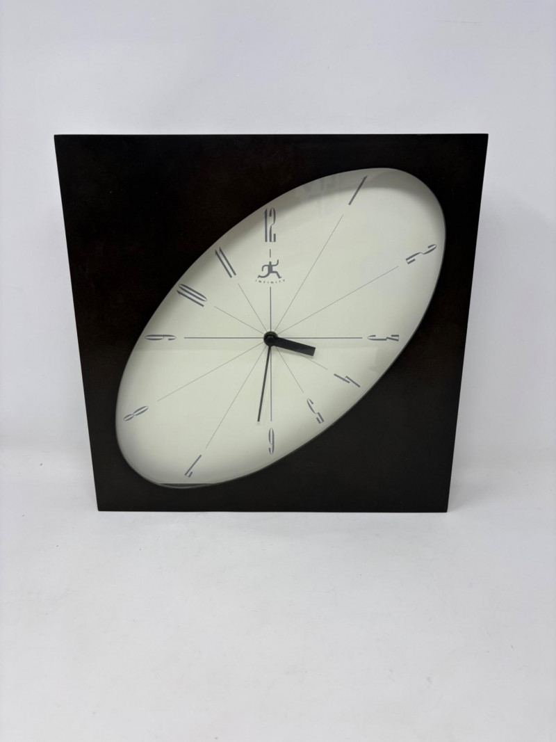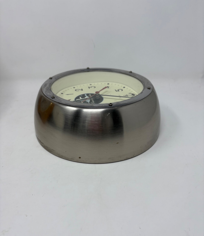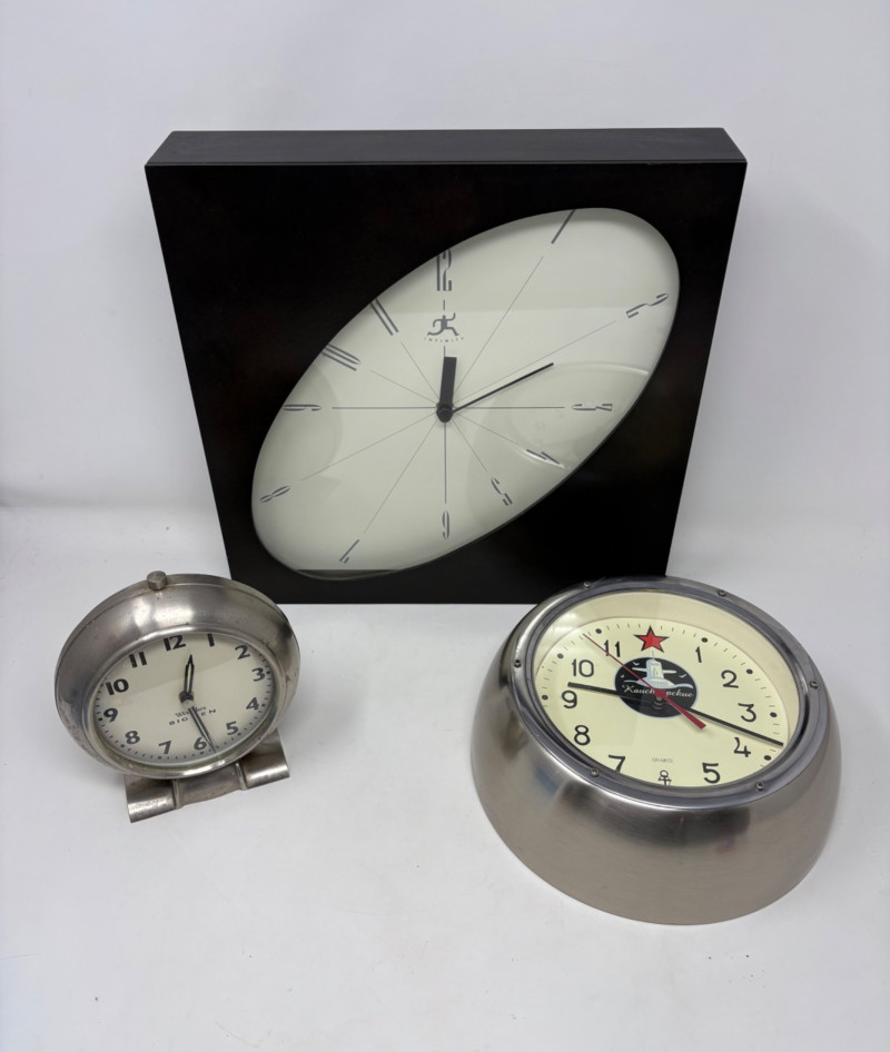 Trio of very different clocks. All are battery driven and all work (although we didn't test them for accurate time=keeping, client says they are all fine). Black oval-faced clock in wood casing from Infinity measures 12“ x 12“ x 2.5" D. Chrome standup desktop clock from Westclox BIGEEN is vintage and shows its age, but still appears to do its job well. Approximately 6" H with a face diameter of about 5". Chrome surround clock with a submarine, anchor, and KAUCHQUPCKUE printed on the paper clock face. Measures approximately 7" diameter x 3" D.