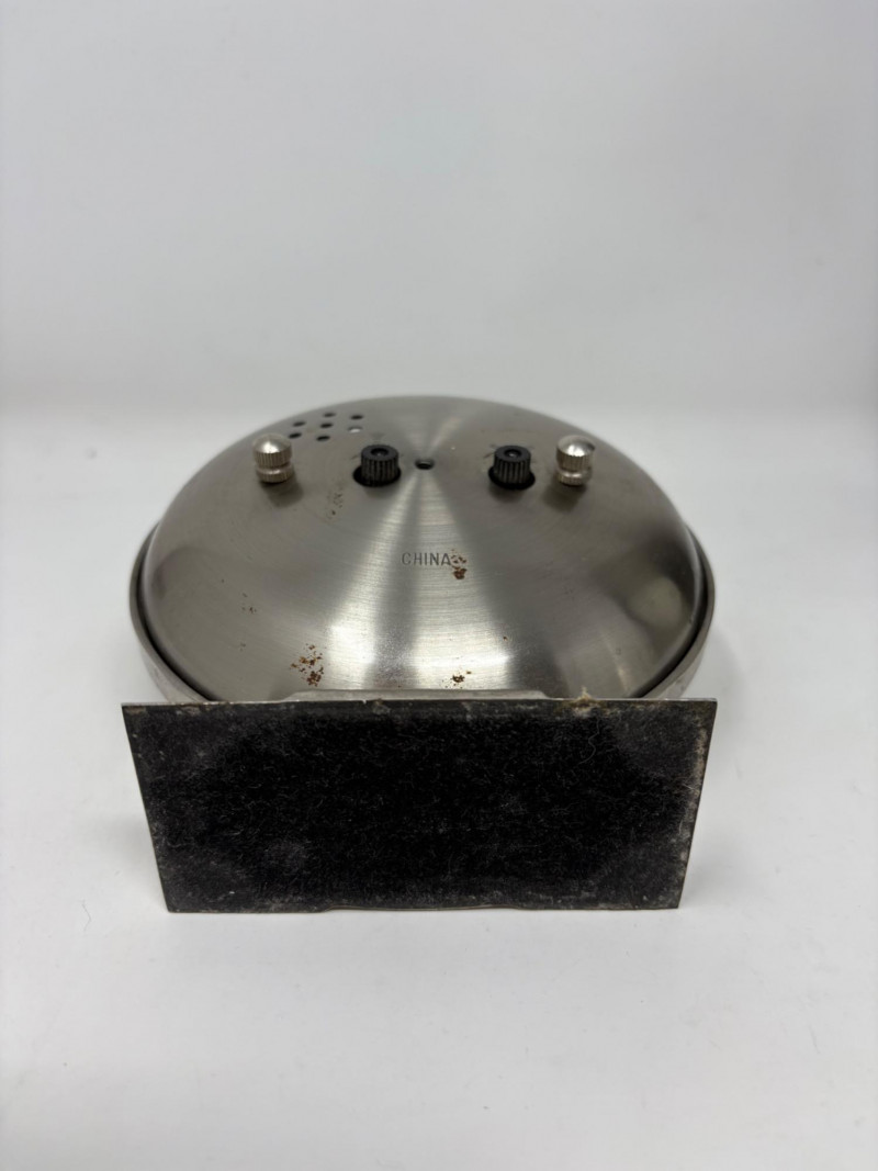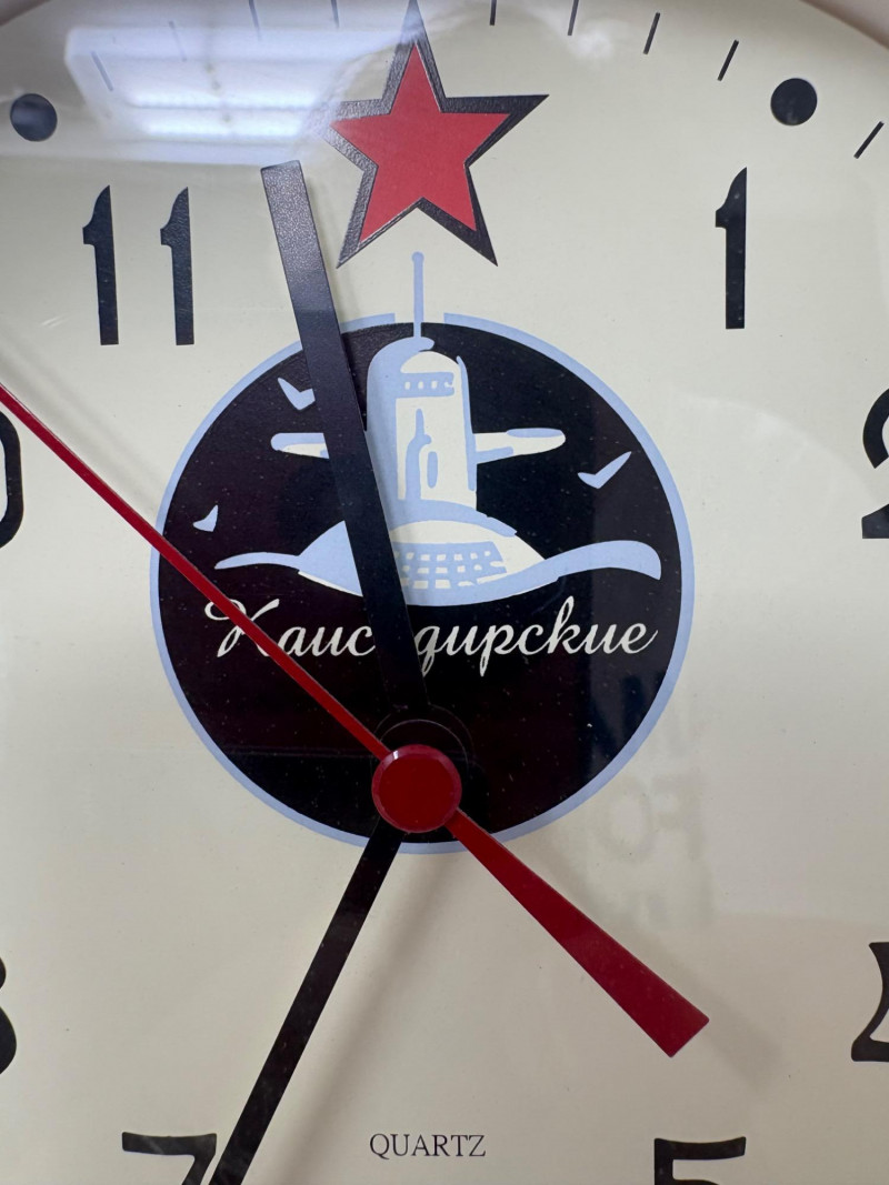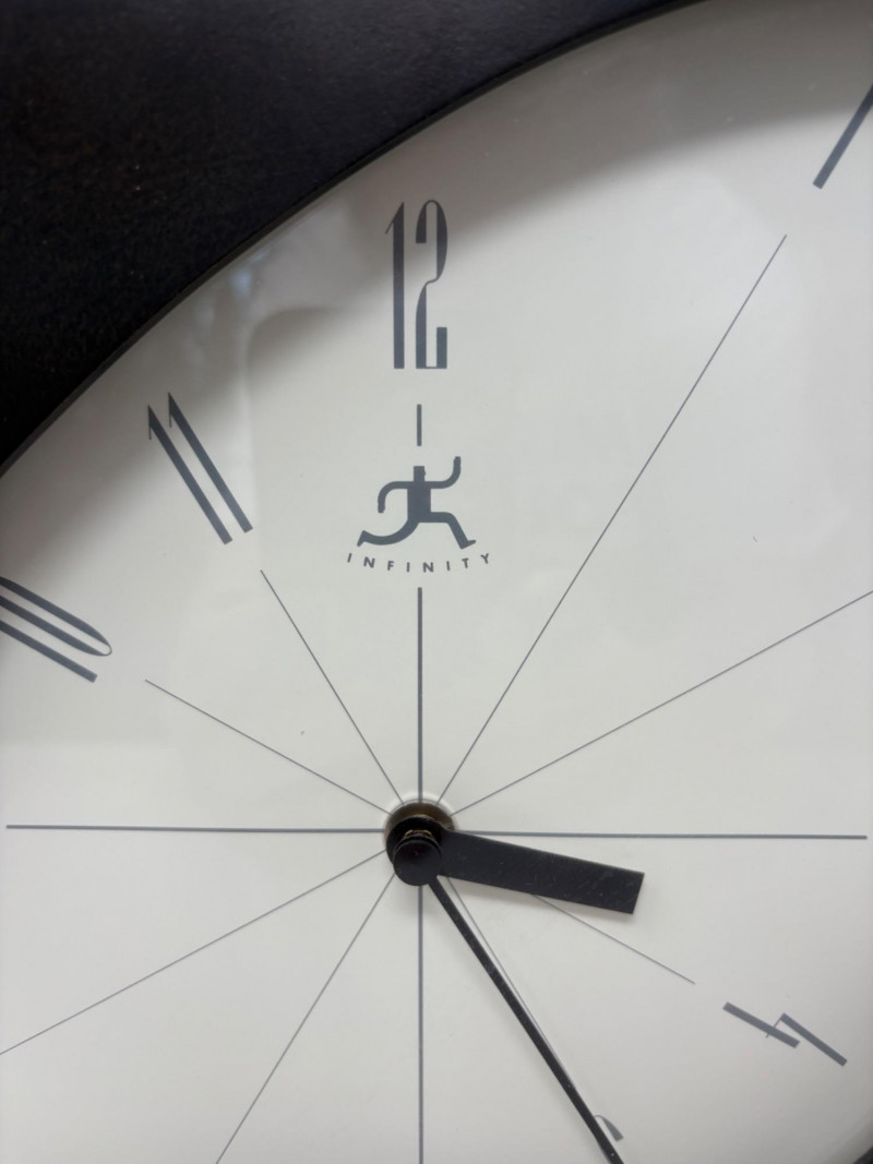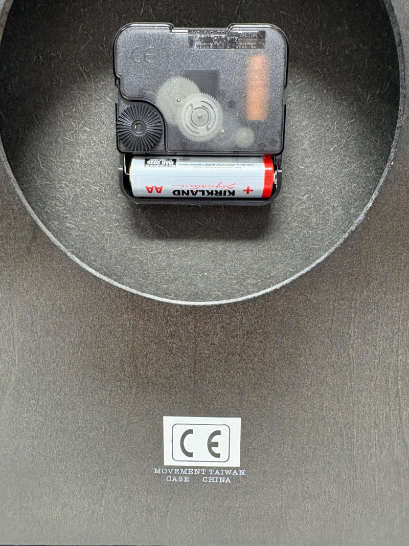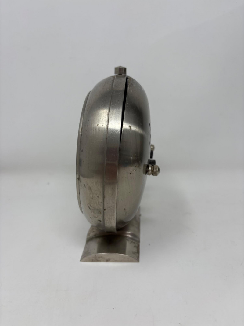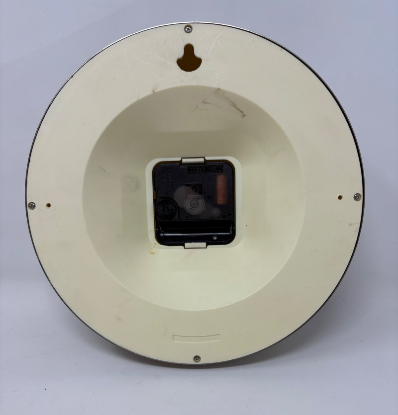 Trio of very different clocks. All are battery driven and all work (although we didn't test them for accurate time=keeping, client says they are all fine). Black oval-faced clock in wood casing from Infinity measures 12“ x 12“ x 2.5" D. Chrome standup desktop clock from Westclox BIGEEN is vintage and shows its age, but still appears to do its job well. Approximately 6" H with a face diameter of about 5". Chrome surround clock with a submarine, anchor, and KAUCHQUPCKUE printed on the paper clock face. Measures approximately 7" diameter x 3" D.