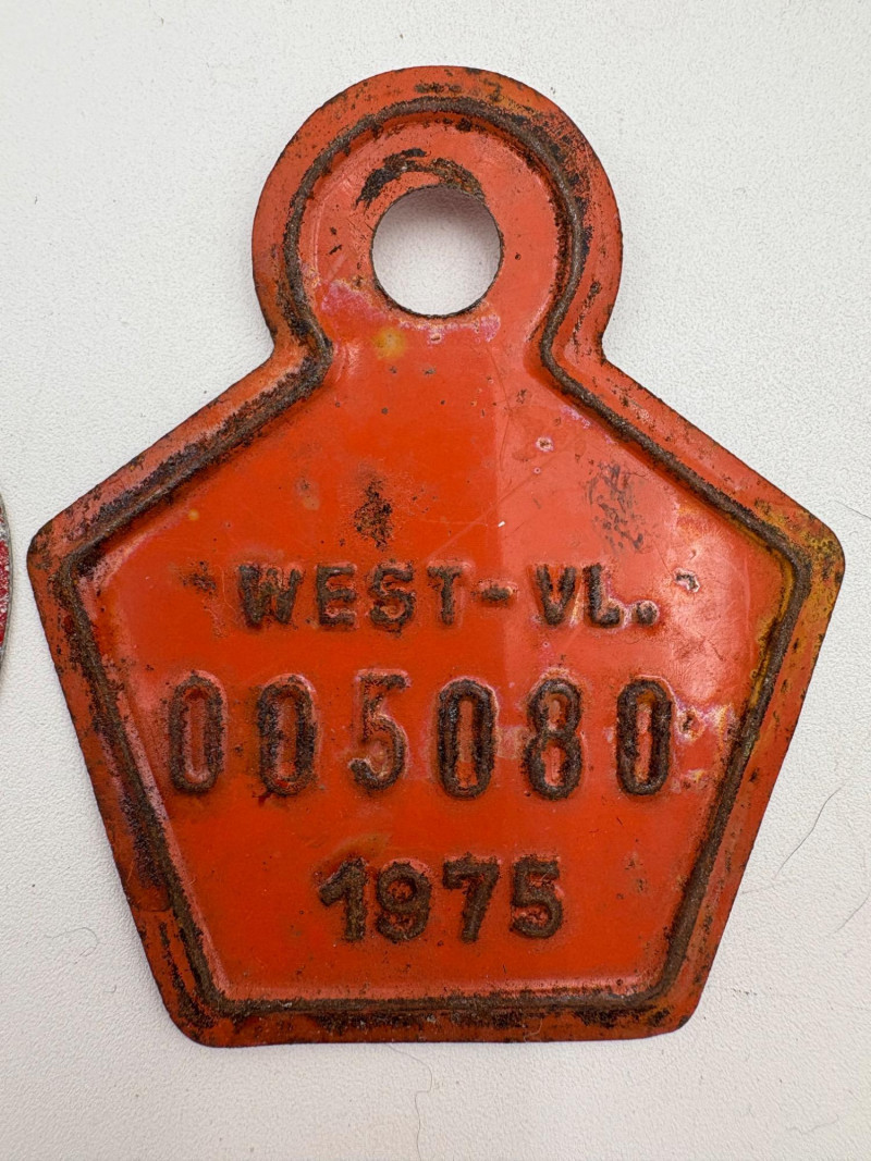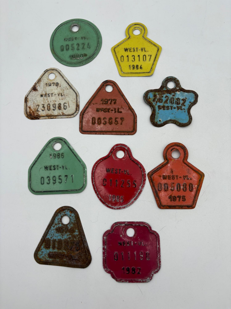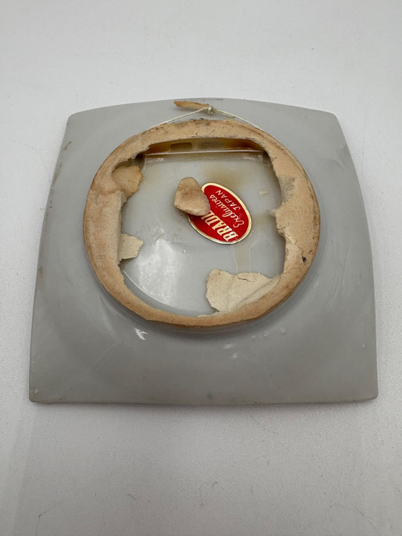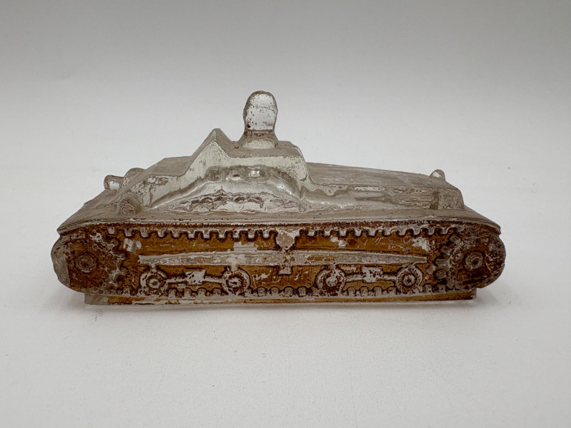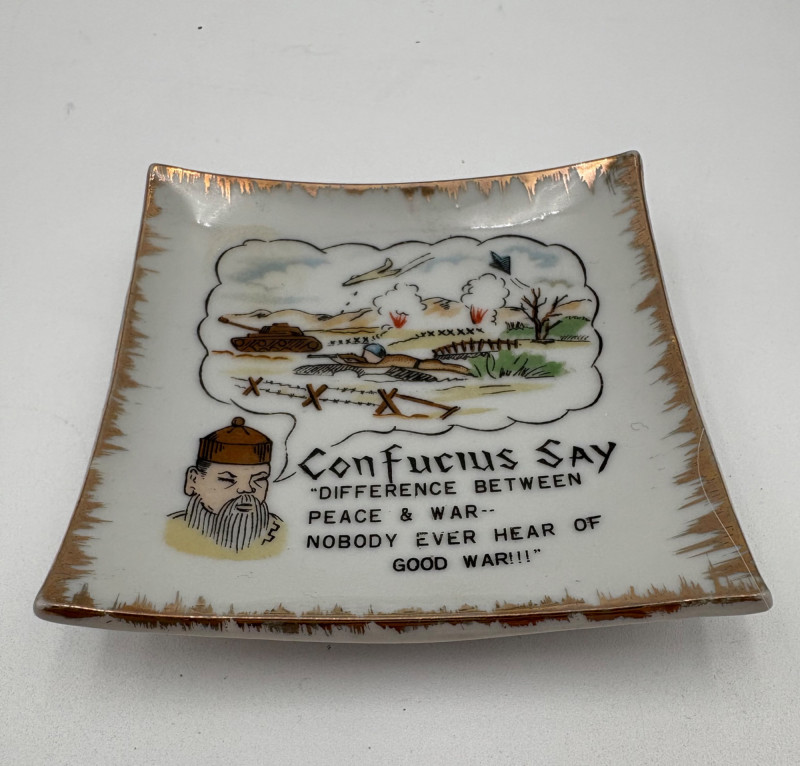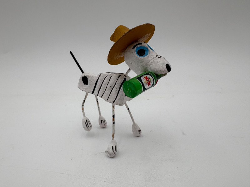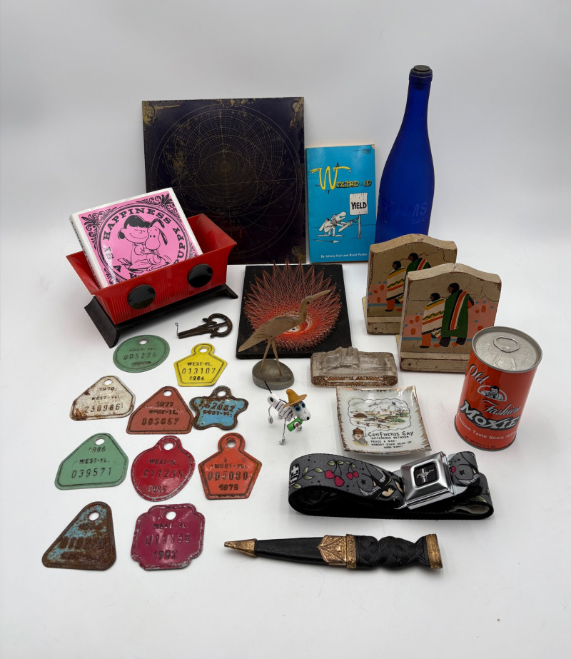 Mixed oddities that don’t have a relationship, but are sort of cool. Most are vintage. 10 metal license plates from the 70s and 80s We believe these are for bicycles - most measure around 3" H. "Happiness is a Warm Puppy" classic Peanuts book from Charles Schulz. 1962, Cider Mill Press. Blue bottle with the phrase "Dreams – Drink Deeply and Believe“. Measures approximately 12" H with lots of small scratches; looks like the dreams got a bit battered. Modern Mexican Dos Muertos (Day of the Dead) dog holding a Dos Equis beer bottle. Measures 3" H. Vintage mouth harp - measures approx. 3" L. USA-made uni-sex fashion belt. Made from seatbelt webbing with tattoo print and Ford Mustang buckle closure. Adjustable from very small to very large. If you can click your airline seatbelt, you can operate this belt. Vintage ceramic “Confucius say” trinket tray. From Bradley Exclusives Japan - measures 3.75" square. Vintage Moxie soda can with the original pop top still intact. Measures just under 5" H. Small bird sculpture made from horn - measures approximately 5.5" H and very delicate. Missing his left eye, which isn’t noticeable if you turn him to the right! 2 antique vintage bookends that client’s grandfather obtained many years ago - they are hand-painted (slight variations) and measure 5" H x 4.5" W. Client's grandfather told her they were given to him by an associate of the Navajo Nation. Vintage heavy glass paperweight of a WW2 tank. Measures approx. 4" L. Black & red vintage Bakelite planter from client's grandmother. No maker mark, but in great condition - measures 4" H x 8" L x 4" D. Small black knife with scabbard. Belonged to client’s father during World War II. Measures approximately 8" L. Made in Great Britain. "Wizard of Id" classic comic book from Brant Parker & Johnny Hart. 1974, Fawcett Gold Medal Books. 1970s string art from client's sister when in 3rd grade. Measures 8" H x 6" W. Old metal star chart of some kind. Printed on both sides. We are not sure what it was part of, but it's definitely vintage. Measures approximately 10" square.