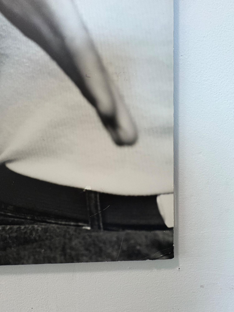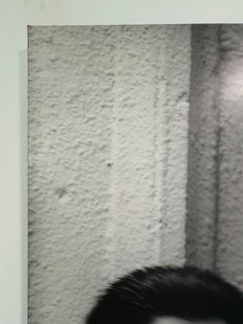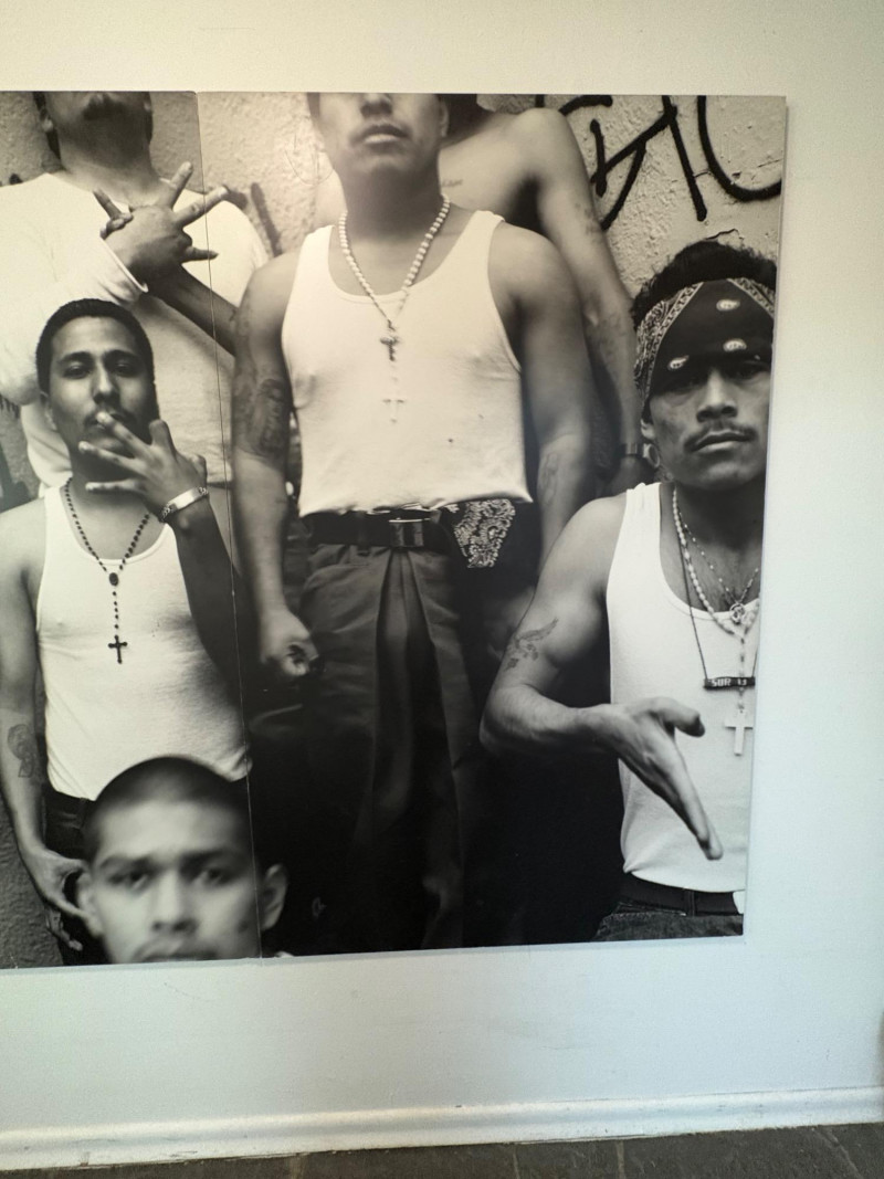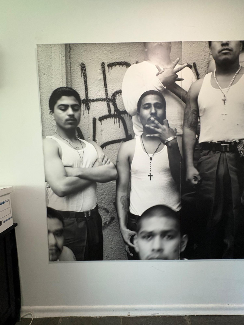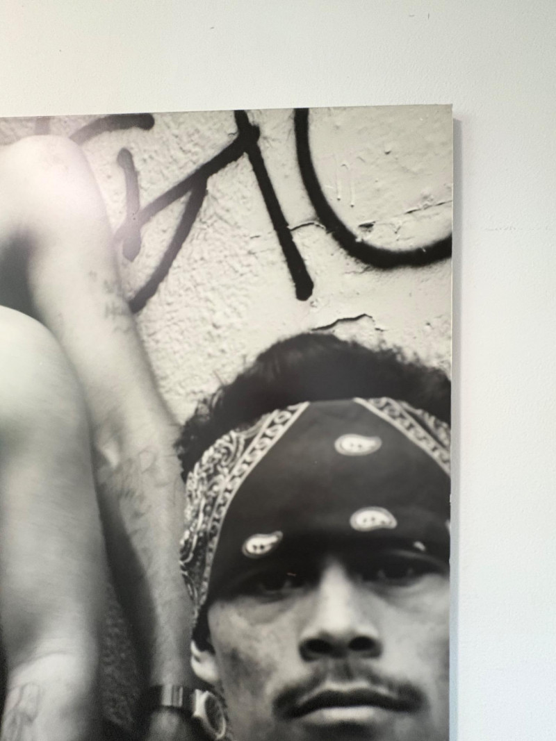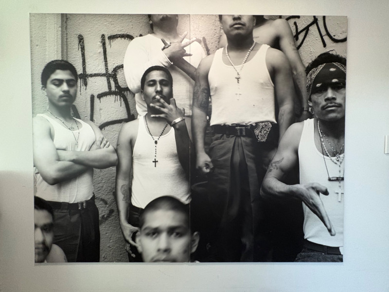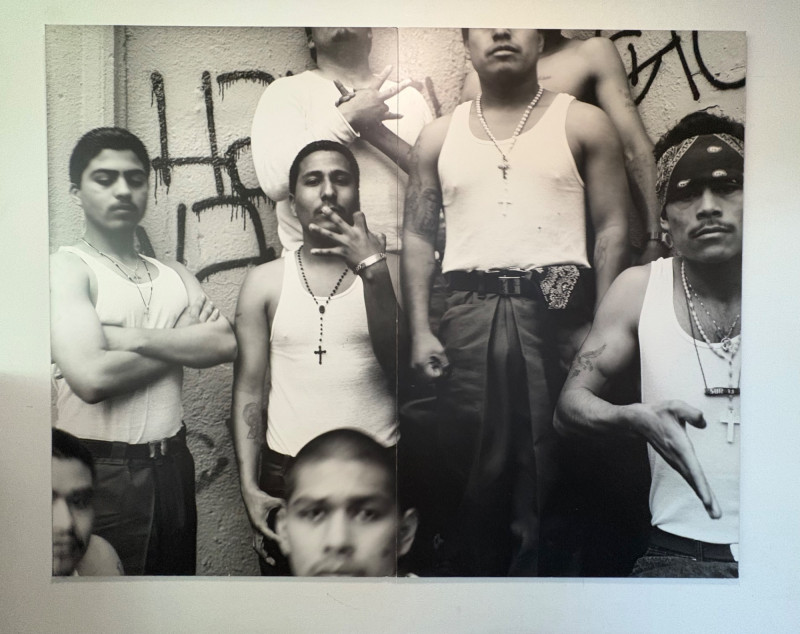 Large scale - over 6' wide - one of a kind black and white photo print by artist Lyn McCracken. The figures are life-size. From 1994-95 show "Company, Claiming, Espejo" at the Zeitgeist Gallery in Seattle. This is one of only two large scale photos to come from her series with East LA gangs and is the only print made of this image to the client's knowledge; client managed a well-known gallery in Seattle for many years, so we believe this is accurate. Photo is mounted on 2 panels of foam core. Measures 59" H x 75" across both panels (currently hung with Velcro tabs). Please note that there is some very slight damage to the photo - see close-ups; the most egregious are shown in the last 2 photos. Sound Estate Company does not appraise art or guarantee authenticity.