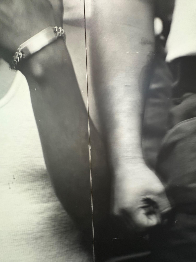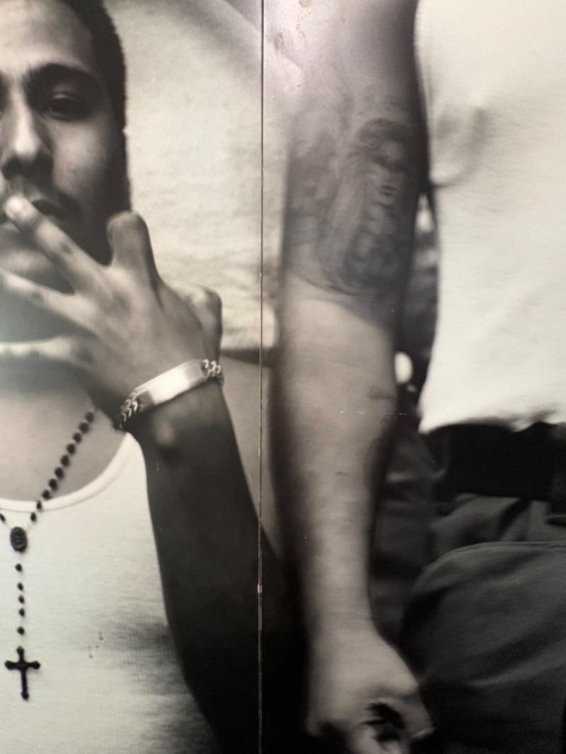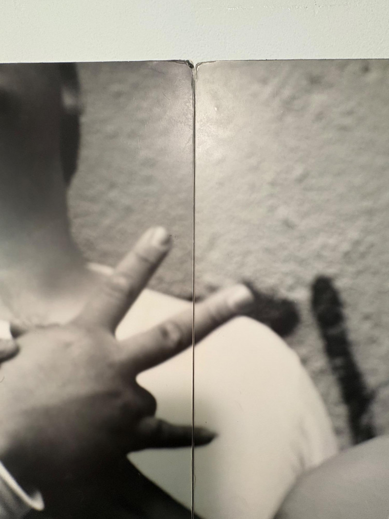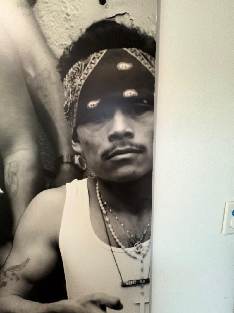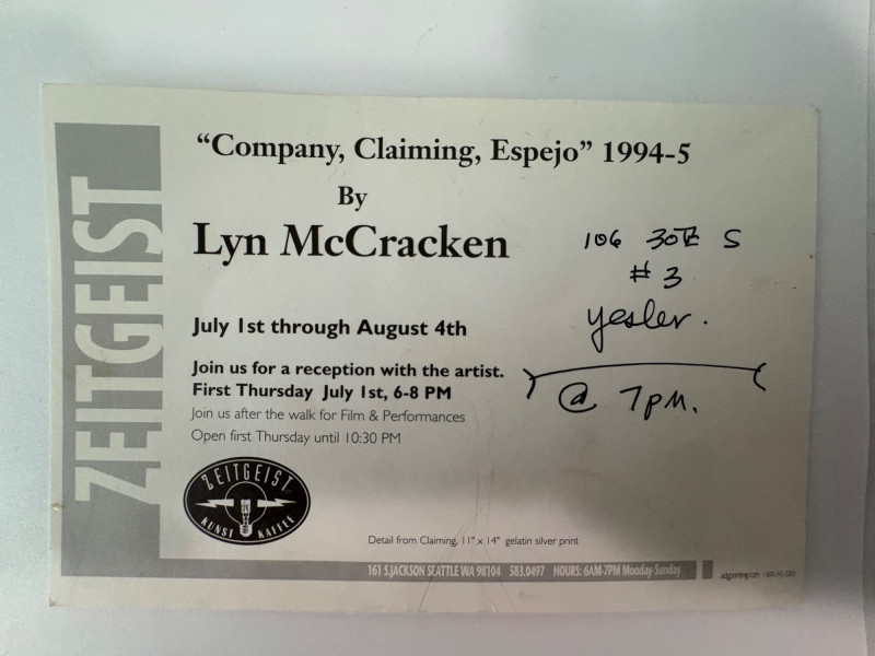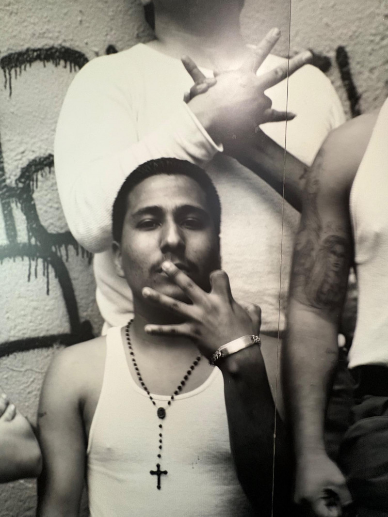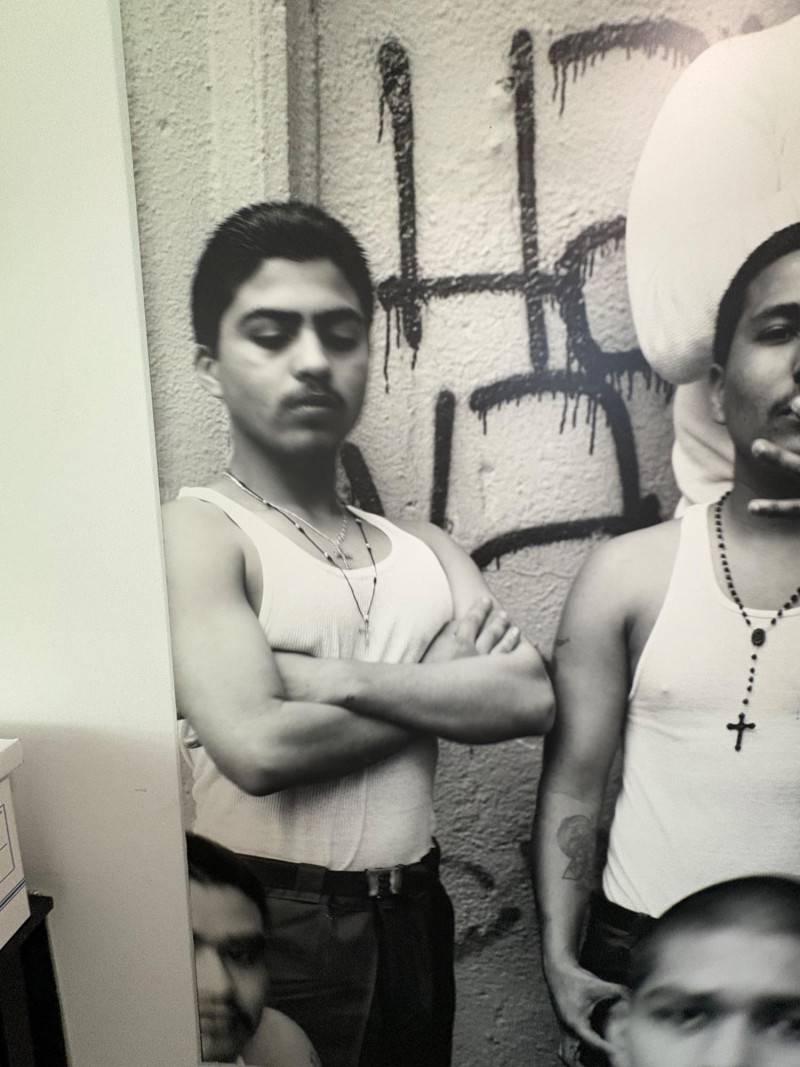 Large scale - over 6' wide - one of a kind black and white photo print by artist Lyn McCracken. The figures are life-size. From 1994-95 show "Company, Claiming, Espejo" at the Zeitgeist Gallery in Seattle. This is one of only two large scale photos to come from her series with East LA gangs and is the only print made of this image to the client's knowledge; client managed a well-known gallery in Seattle for many years, so we believe this is accurate. Photo is mounted on 2 panels of foam core. Measures 59" H x 75" across both panels (currently hung with Velcro tabs). Please note that there is some very slight damage to the photo - see close-ups; the most egregious are shown in the last 2 photos. Sound Estate Company does not appraise art or guarantee authenticity.