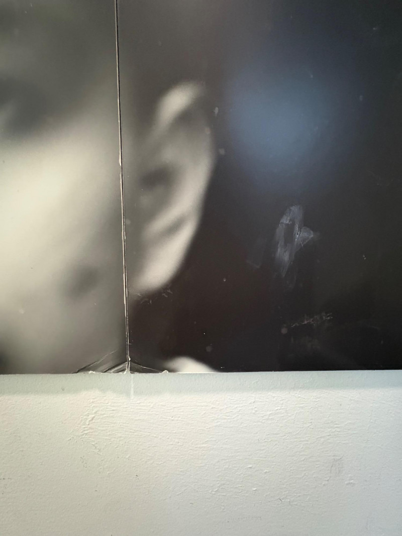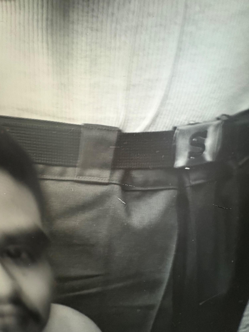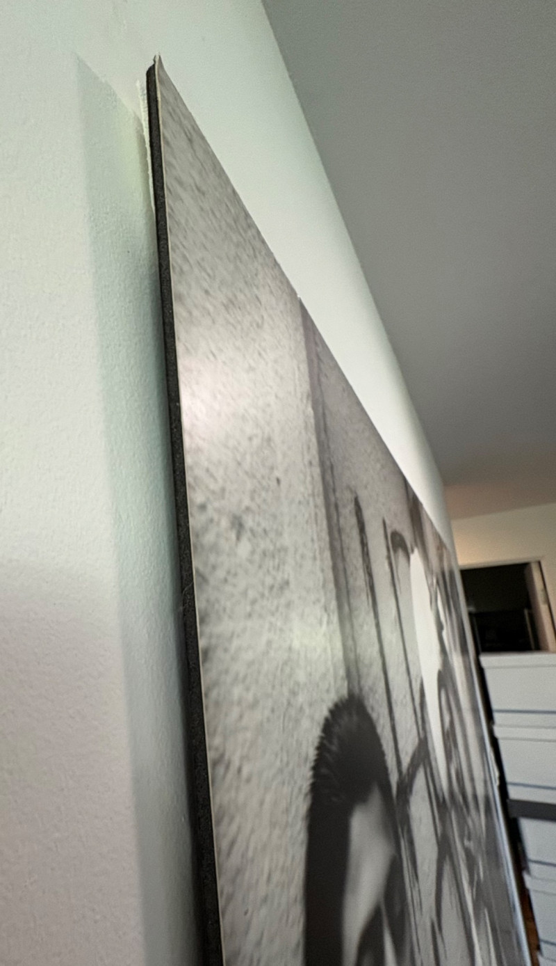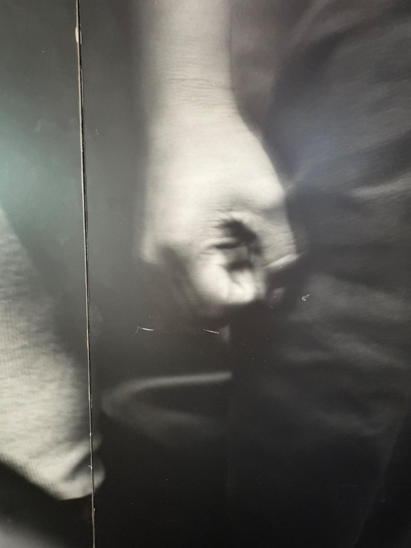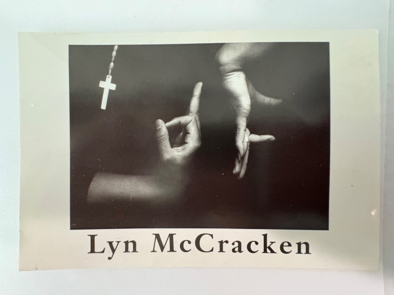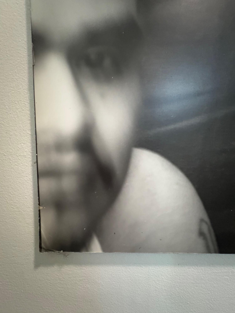 Large scale - over 6' wide - one of a kind black and white photo print by artist Lyn McCracken. The figures are life-size. From 1994-95 show "Company, Claiming, Espejo" at the Zeitgeist Gallery in Seattle. This is one of only two large scale photos to come from her series with East LA gangs and is the only print made of this image to the client's knowledge; client managed a well-known gallery in Seattle for many years, so we believe this is accurate. Photo is mounted on 2 panels of foam core. Measures 59" H x 75" across both panels (currently hung with Velcro tabs). Please note that there is some very slight damage to the photo - see close-ups; the most egregious are shown in the last 2 photos. Sound Estate Company does not appraise art or guarantee authenticity.