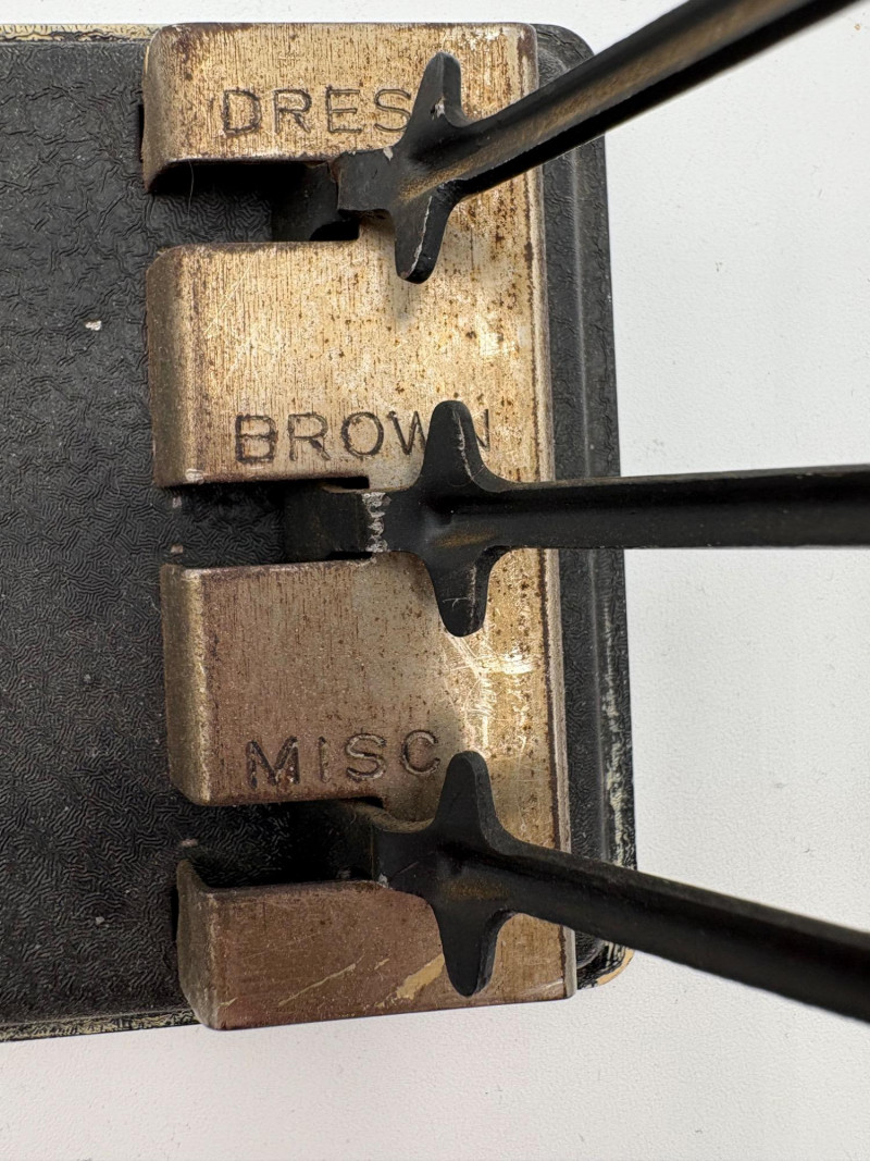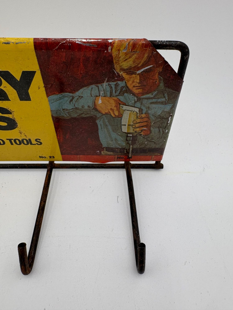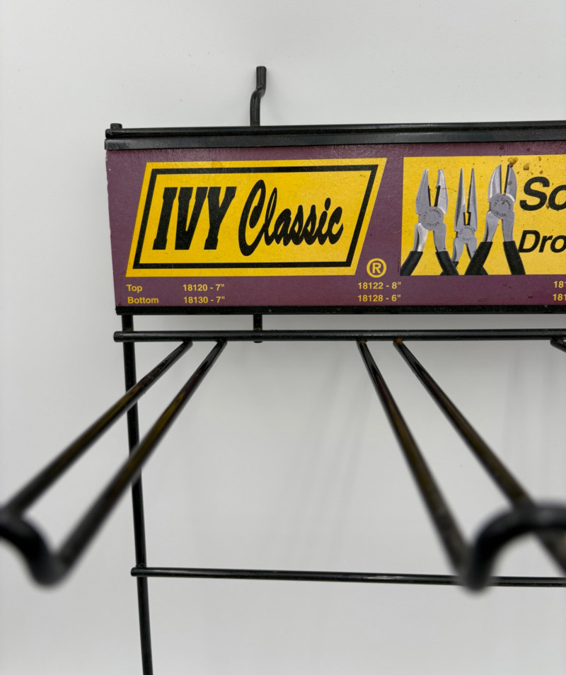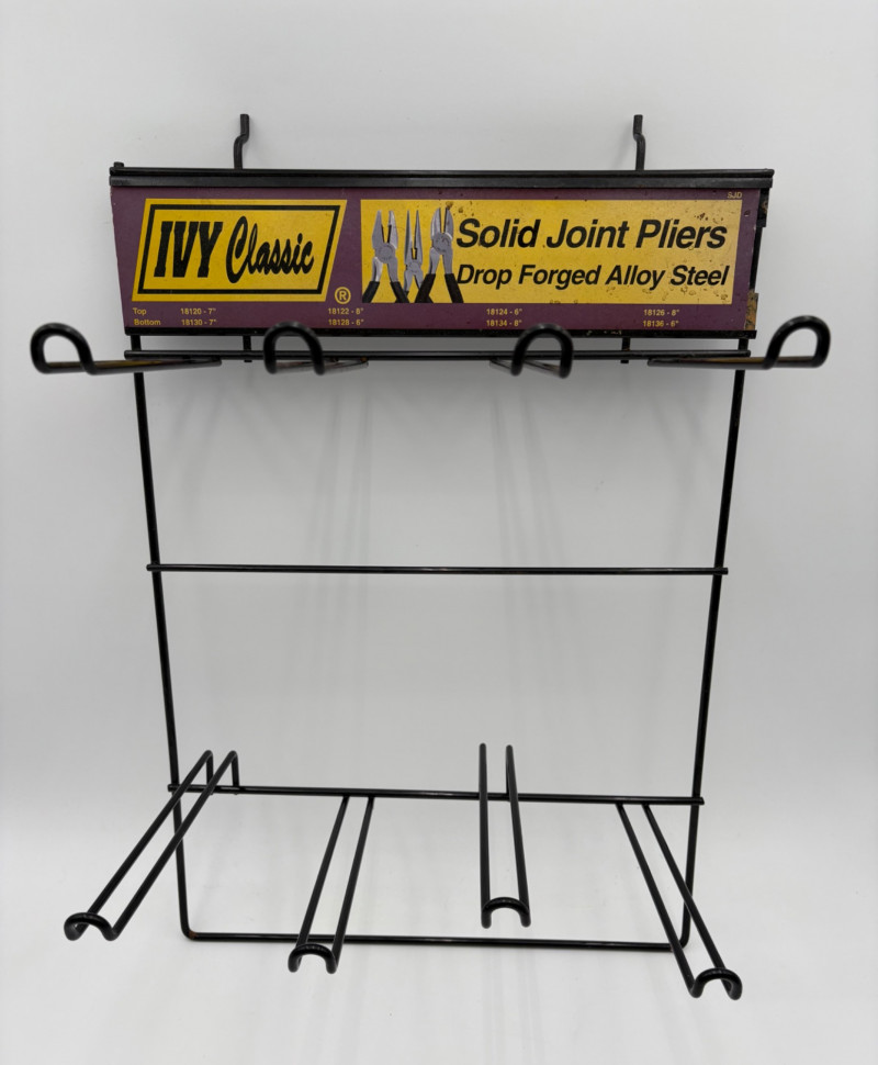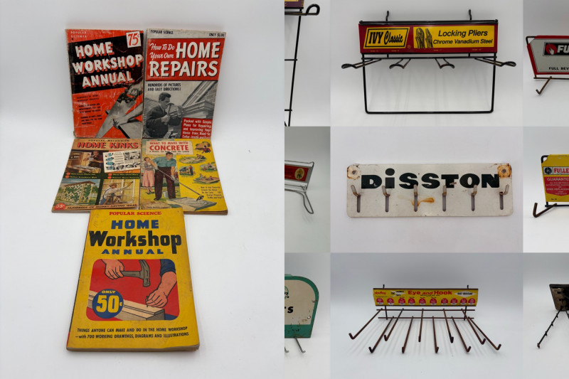 Multiple heavy duty wire racks that were made originally as tool displays, but our client purchased them to hang necklaces in her closet. She liked the look, but in case you don’t like it, we paired them with several home repair books, and you could use the racks in your home shop . The repair books - mostly Popular Science from the late 40s and early 50s - explain how to repair things in simple common language with great illustrations. Client said her father used them with her when she was young and they are still very informative. Largest rack (Ivy Pliers) measures 25" H x 15" W with 9" projections. All items in the lot are in vintage condition appropriate to their age.
